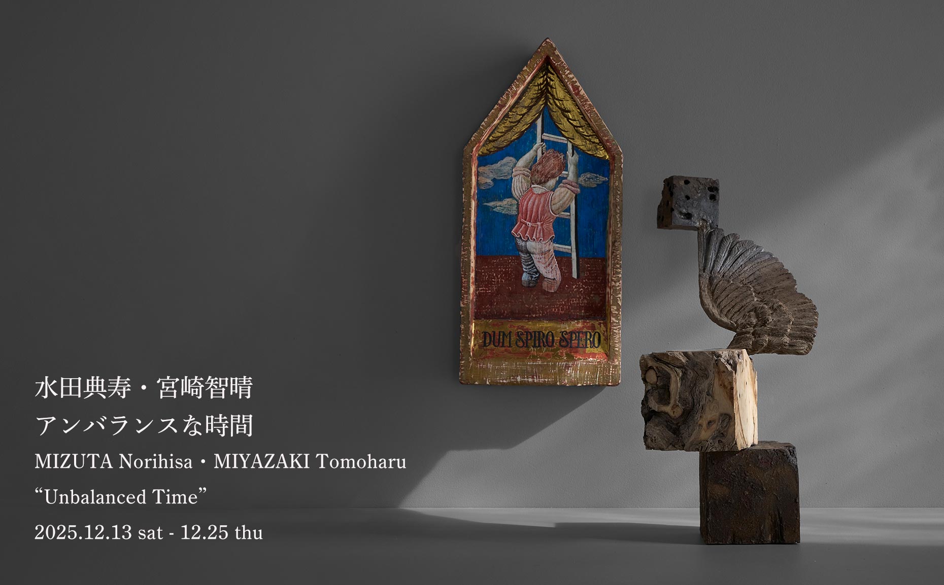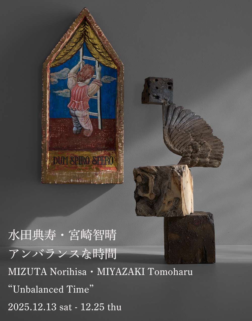 水田典寿・宮崎智晴「アンバランスな時間」 過去と現在、平面と立体、均衡と歪み。そのあいだに揺らぐ「アンバランスな時間」を、ぜひ会場でご体感ください。 2025.12.13 sat - 12.25 thu12:00-18:00