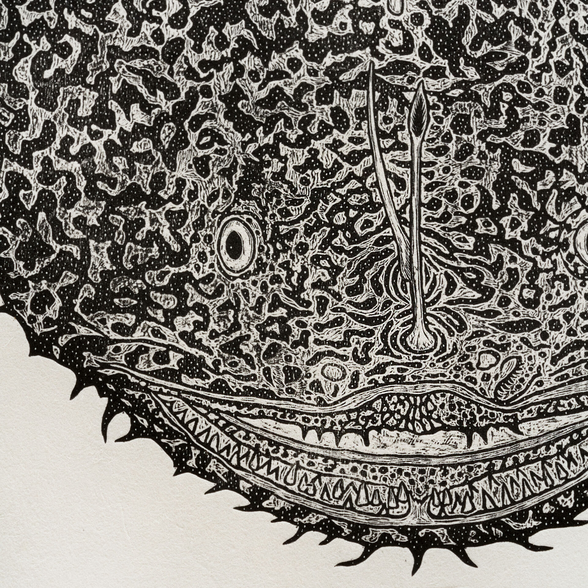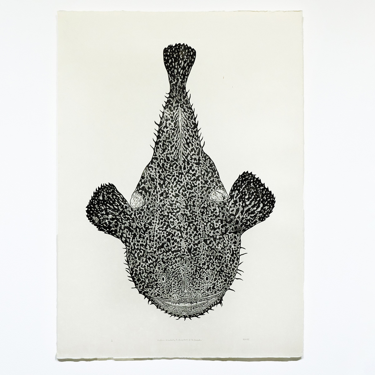水揚げされたアンコウをスケッチし、それを元に実物大で制作した木版画です。版木を電熱ペンで焦がしながら彫り、和紙にバレンで摺っています。茨城県常陸大宮市で生産される西ノ内和紙を使用しています。