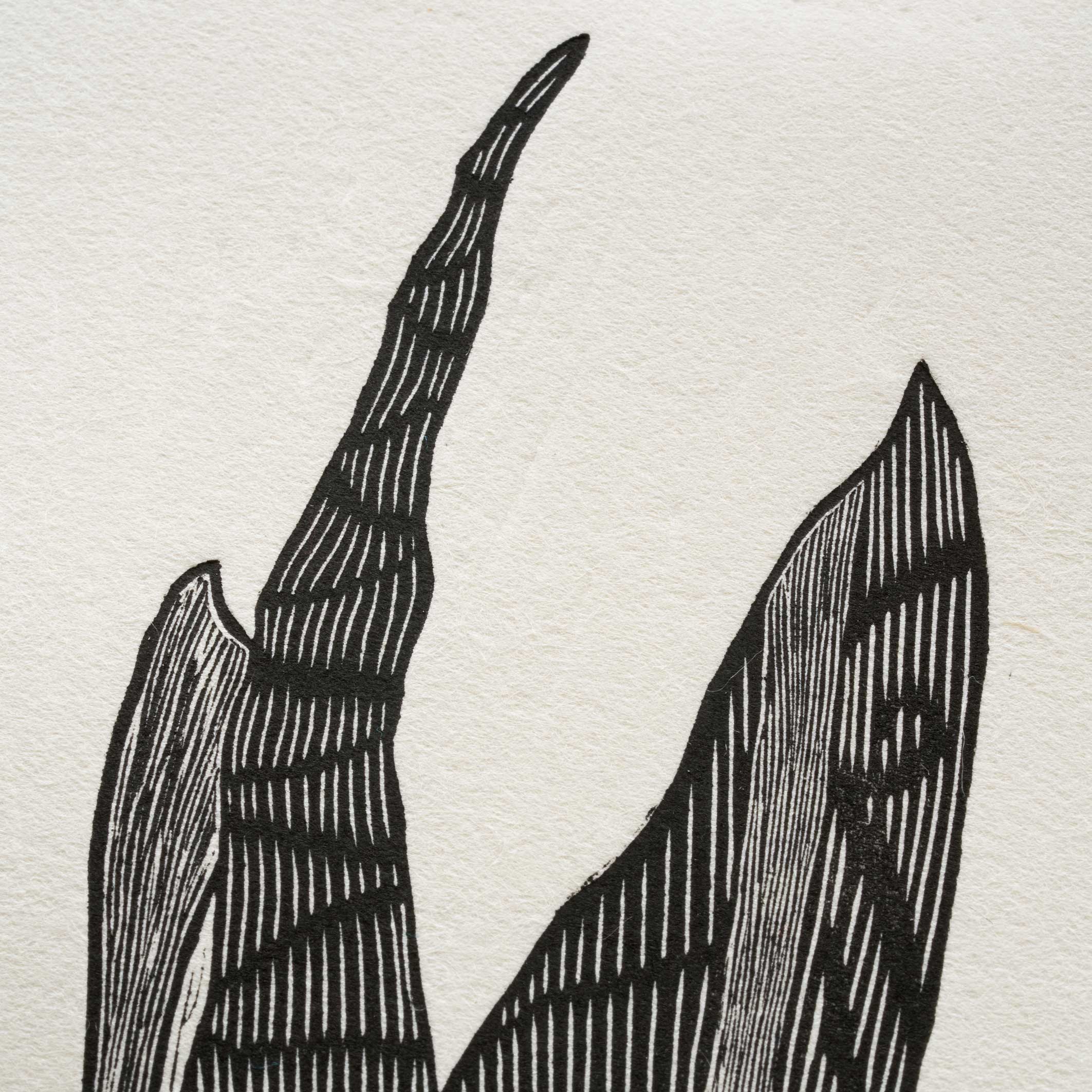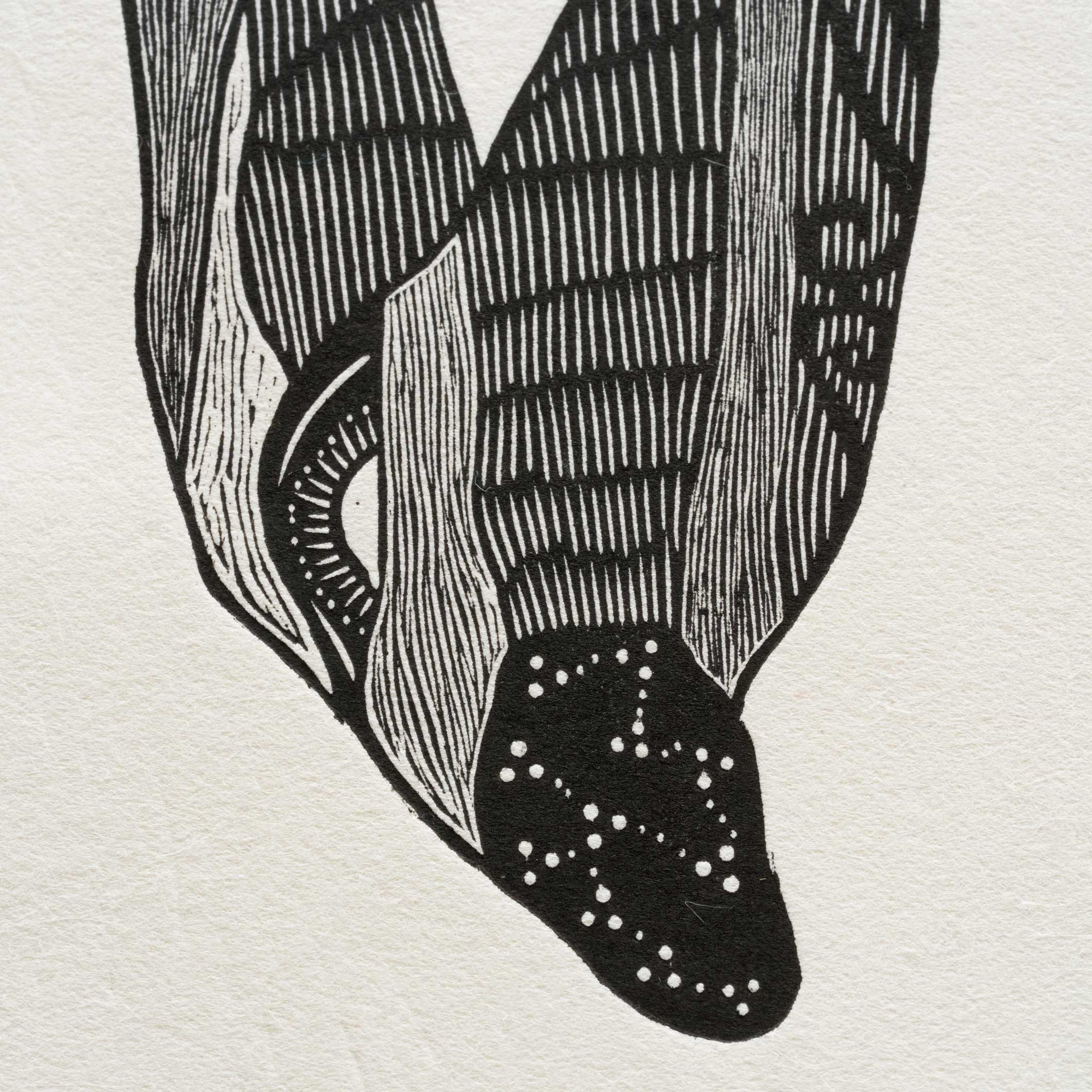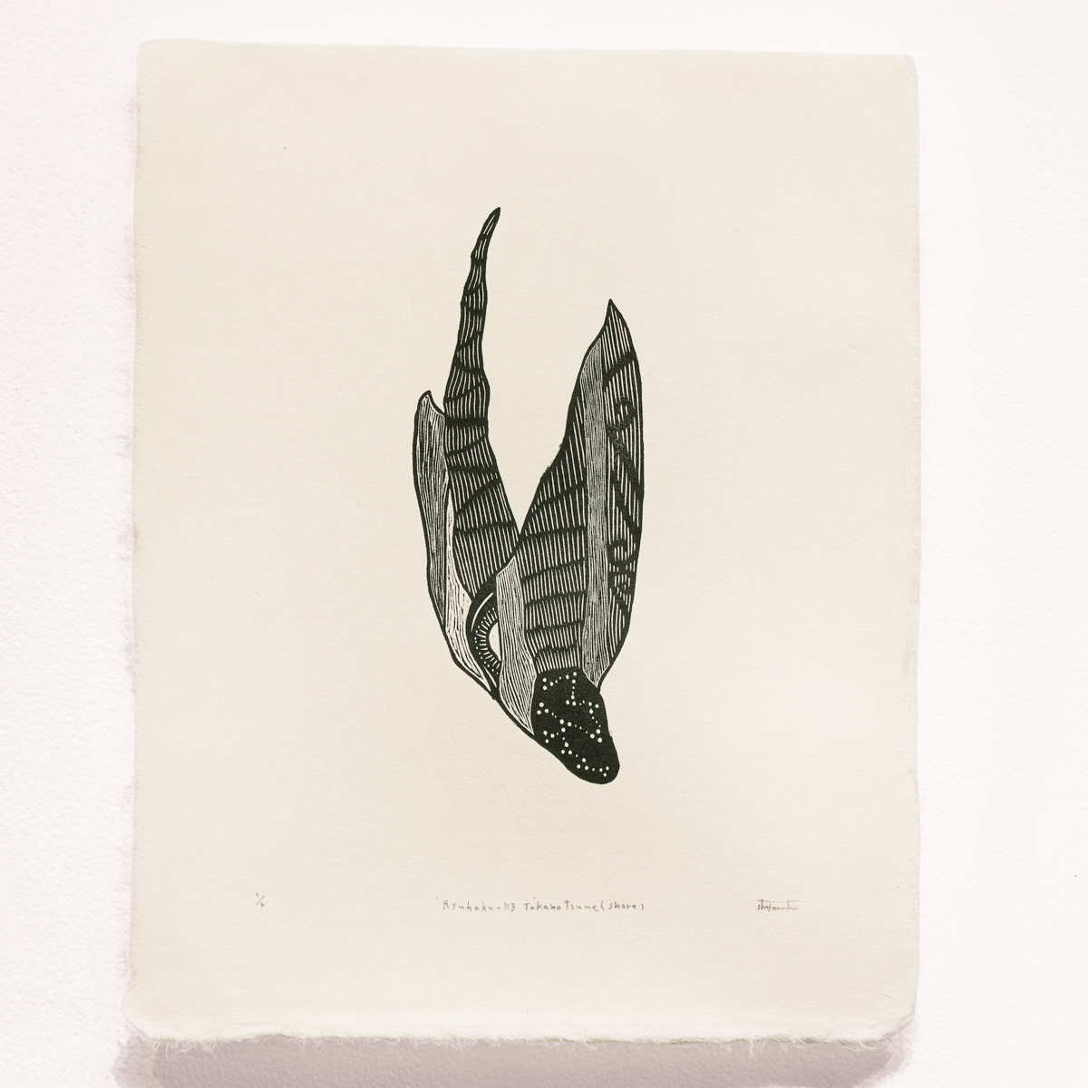 海岸に打ち上げられた石が、月の引力によって再び海へと引き戻される際に砂浜に残る痕跡をスケッチし、それを元に制作した木版画です。版木を電熱ペンで焦がしながら彫り、和紙にバレンで摺っています。茨城県常陸大宮市で生産される西ノ内和紙を使用しています。