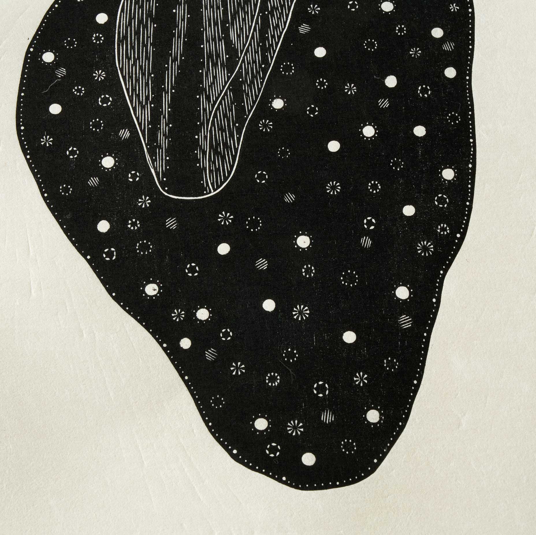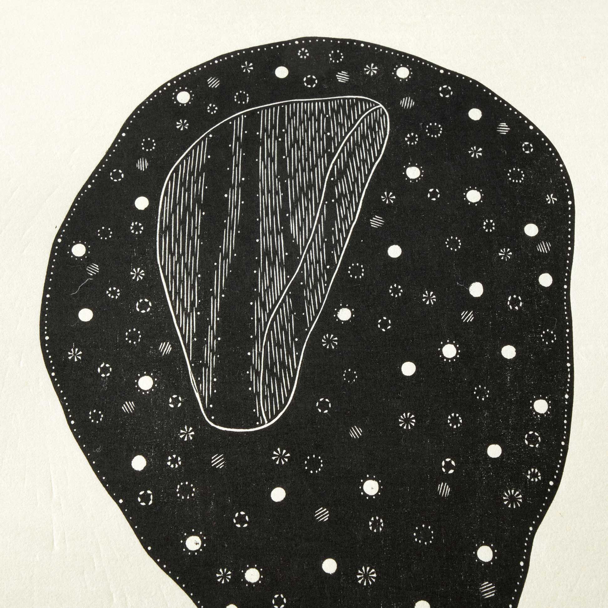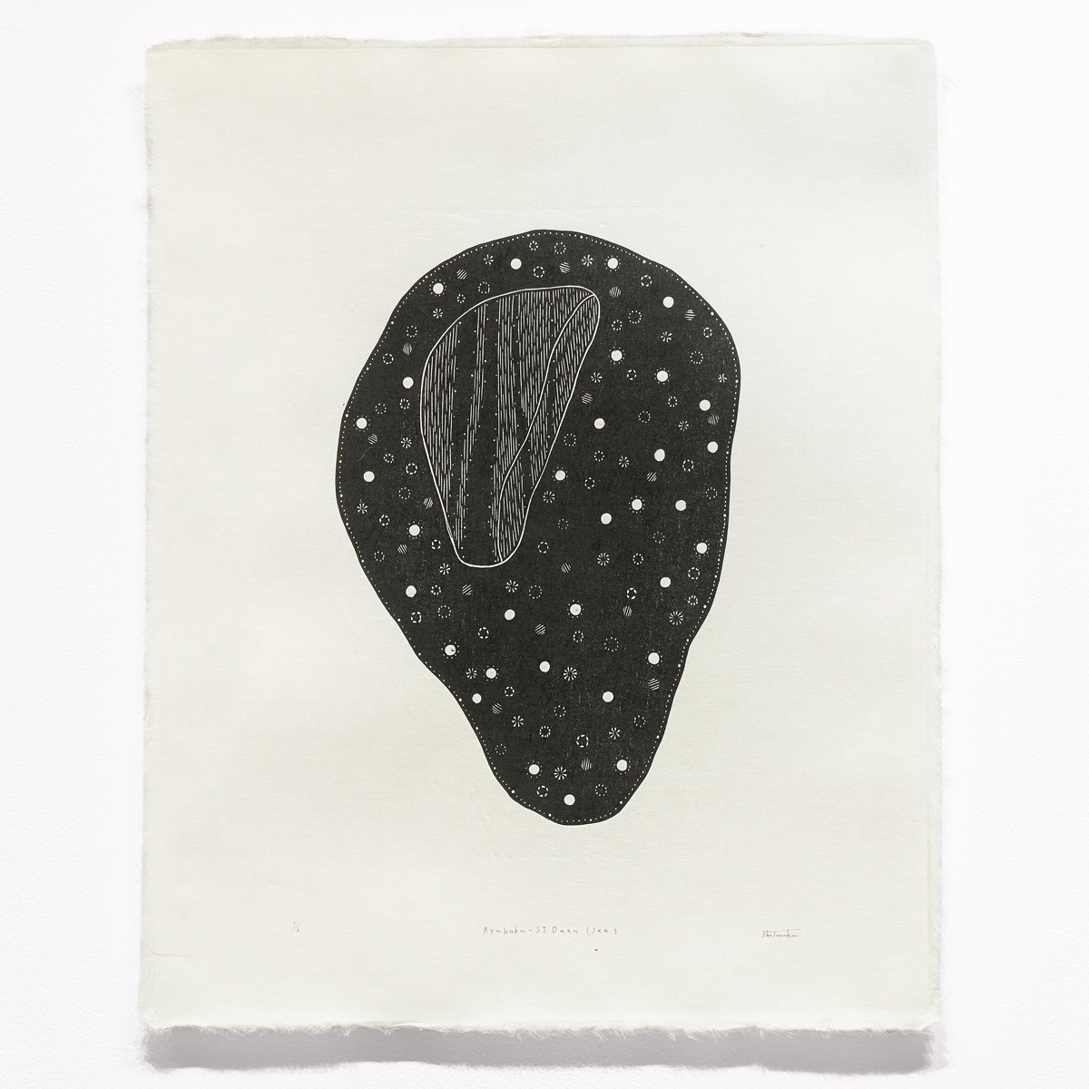 海岸に打ち上げられた石が、月の引力によって再び海へと引き戻される際に砂浜に残る痕跡をスケッチし、それを元に制作した木版画です。版木を電熱ペンで焦がしながら彫り、和紙にバレンで摺っています。茨城県常陸大宮市で生産される西ノ内和紙を使用しています。