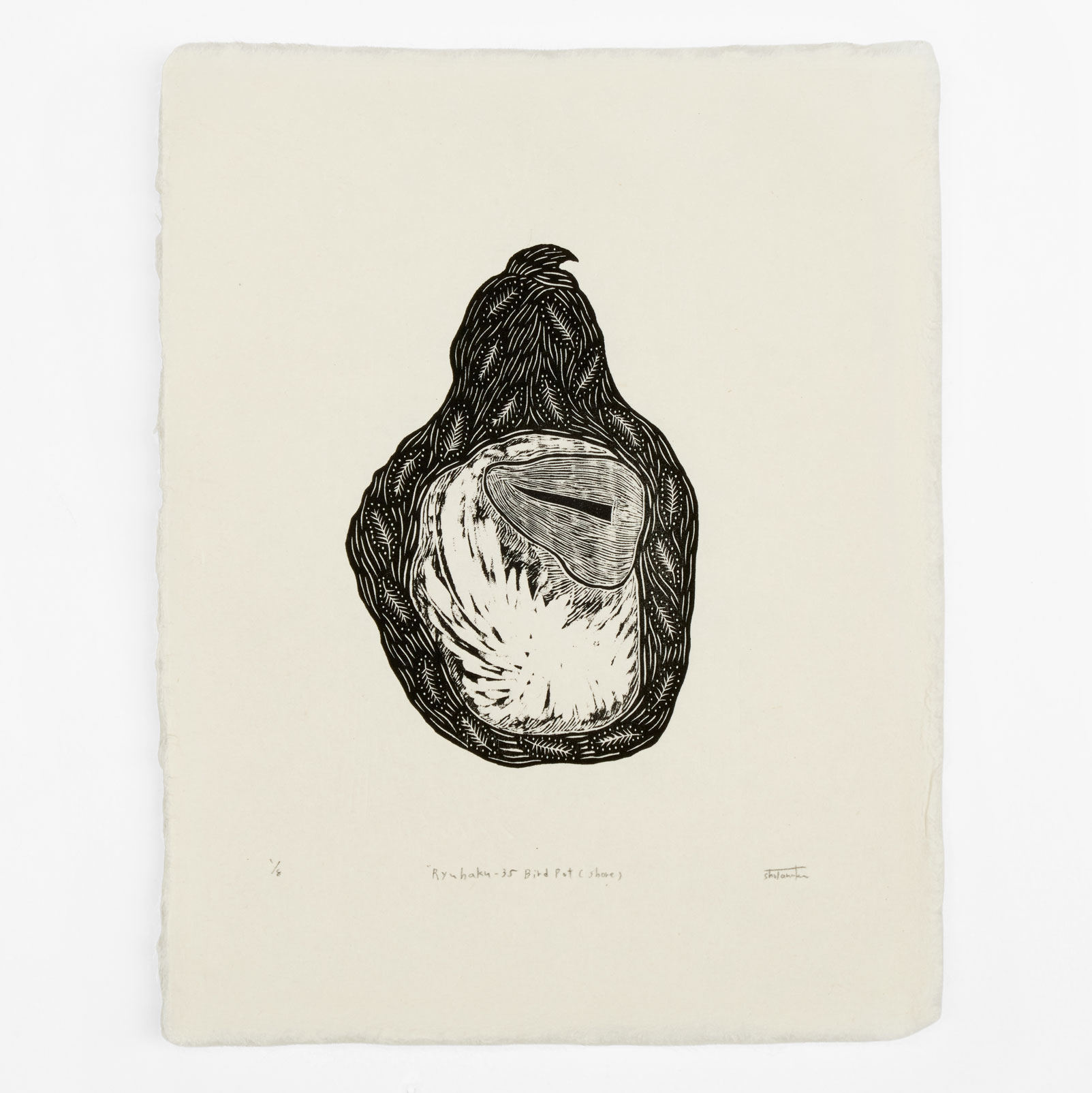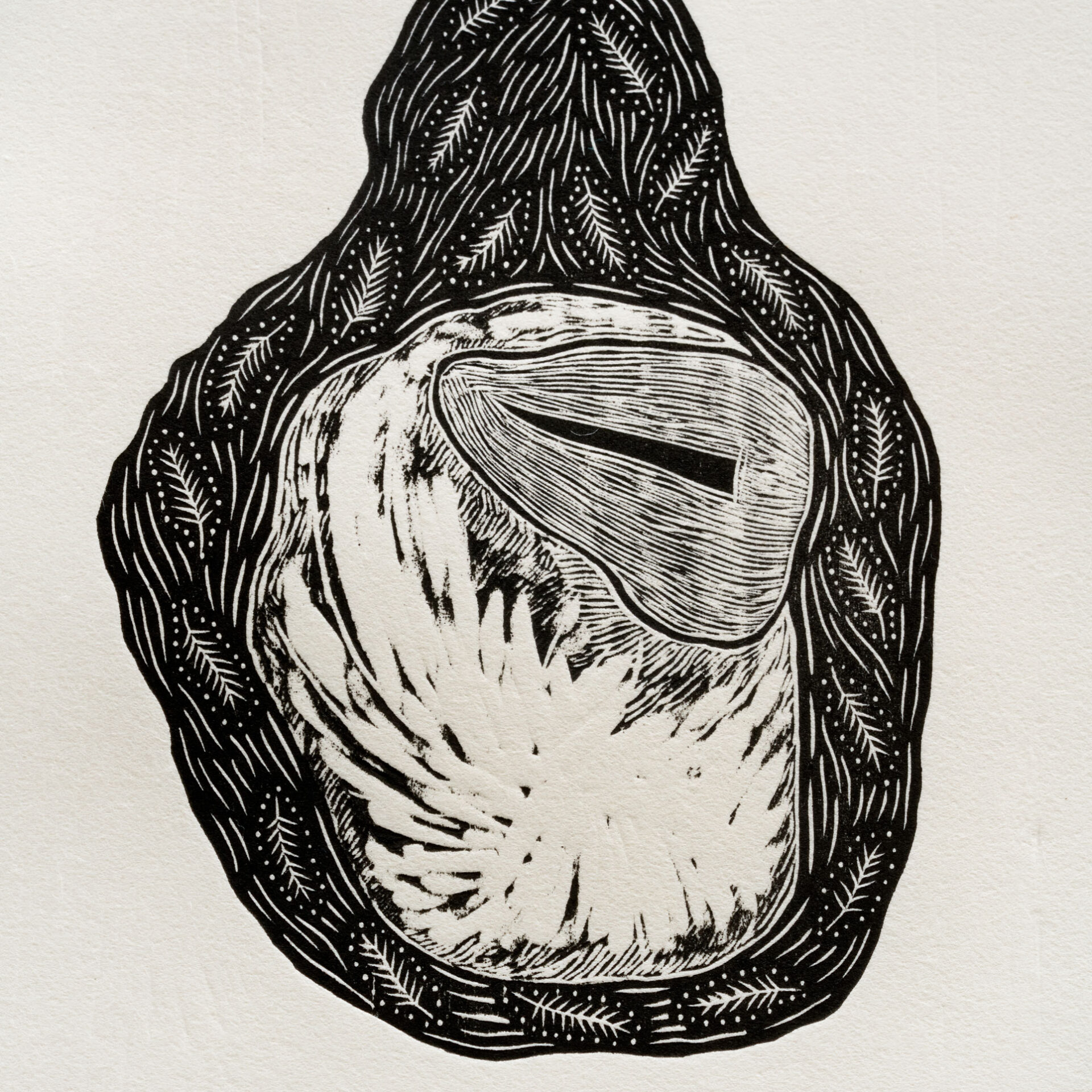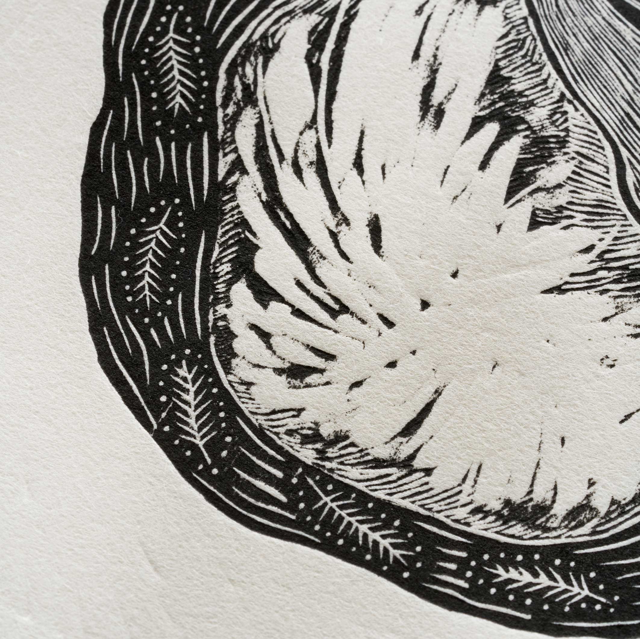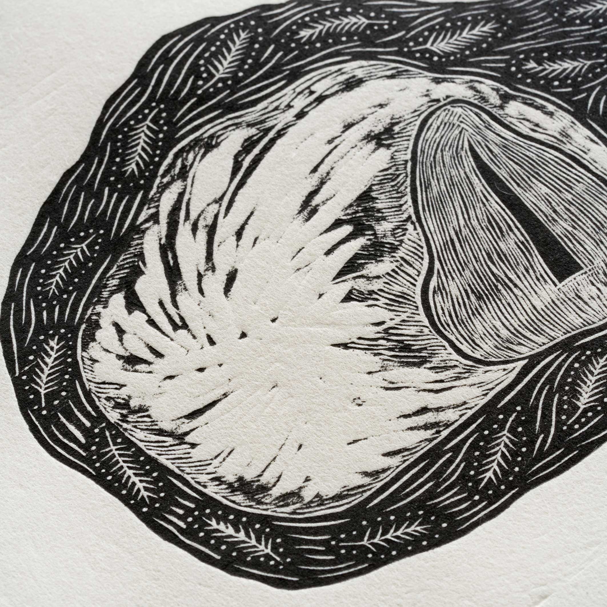 海岸に打ち上げられた石が、月の引力によって再び海へと引き戻される際に砂浜に残る痕跡をスケッチし、それを元に制作した木版画です。版木を電熱ペンで焦がしながら彫り、和紙にバレンで摺っています。茨城県常陸大宮市で生産される西ノ内和紙を使用しています。