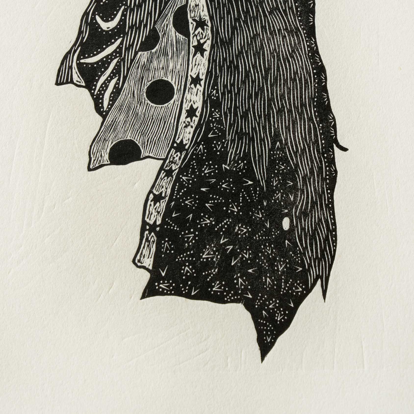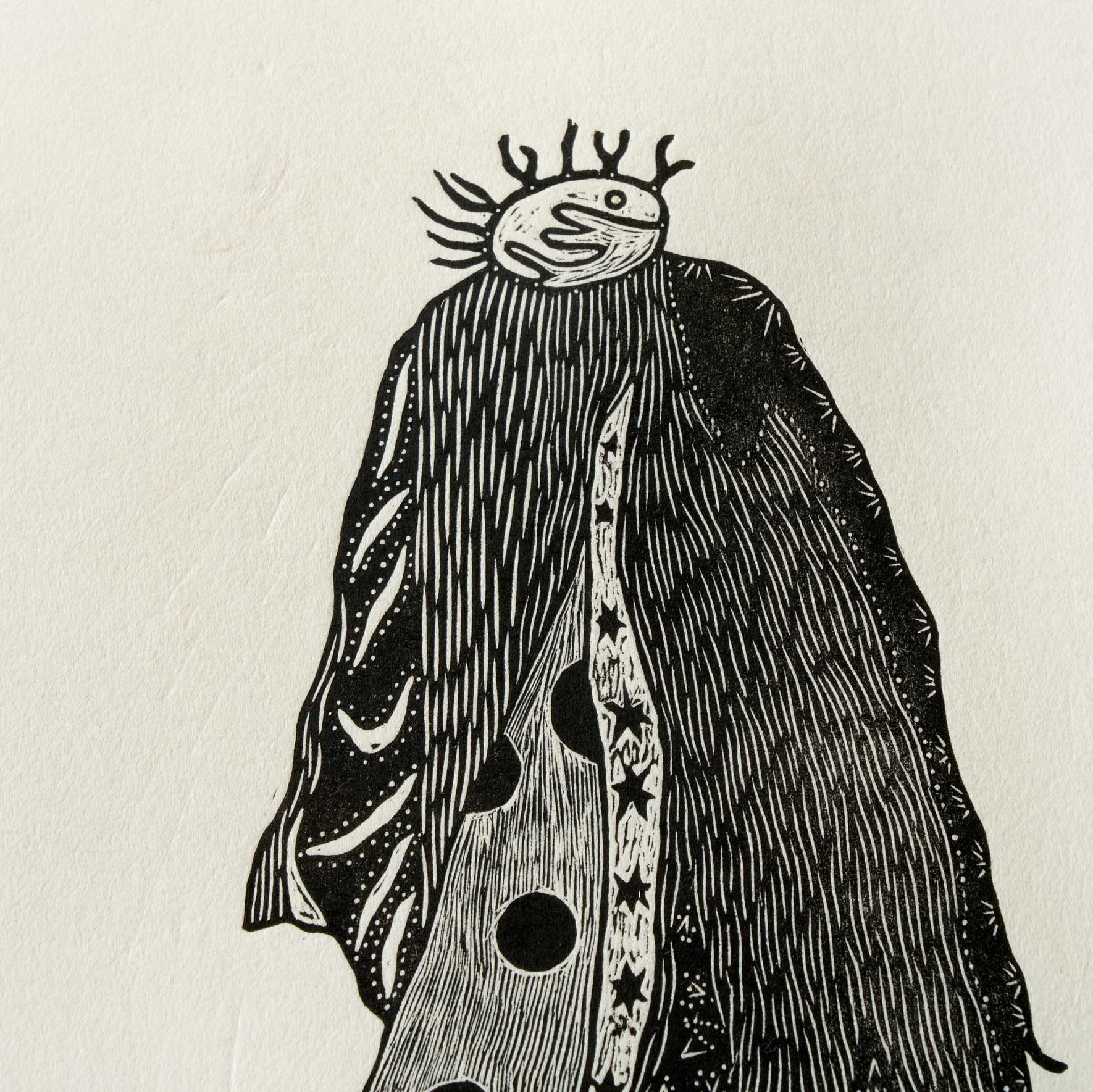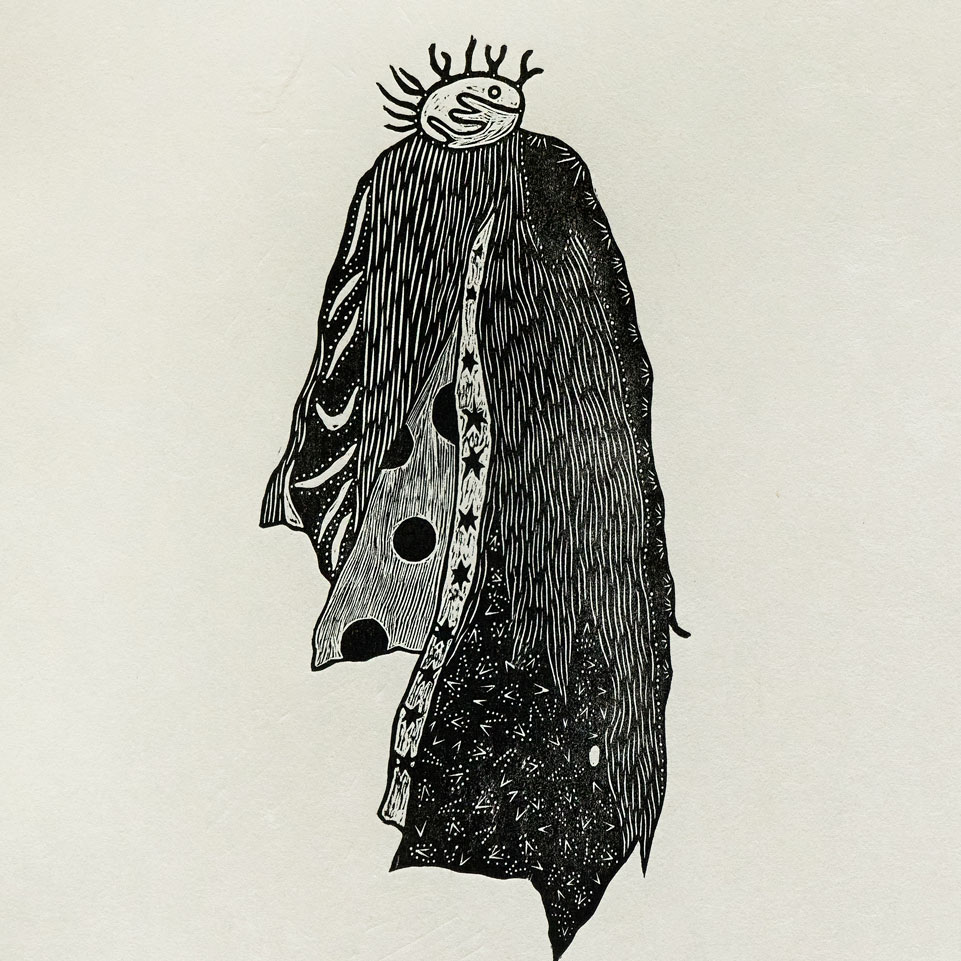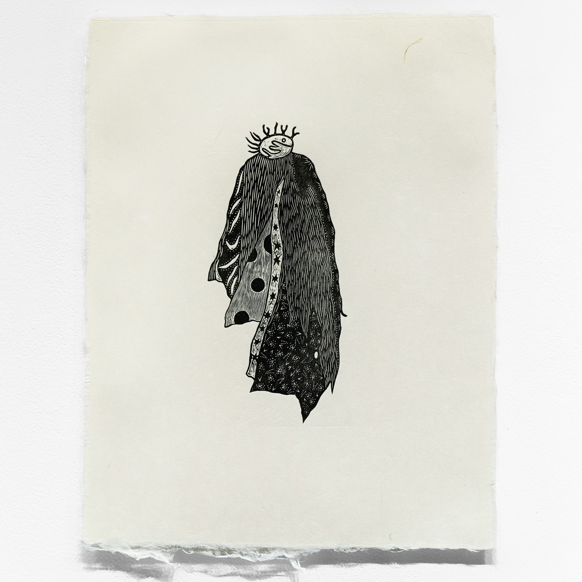 海岸に打ち上げられた石が、月の引力によって再び海へと引き戻される際に砂浜に残る痕跡をスケッチし、それを元に制作した木版画です。版木を電熱ペンで焦がしながら彫り、和紙にバレンで摺っています。茨城県常陸大宮市で生産される西ノ内和紙を使用しています。