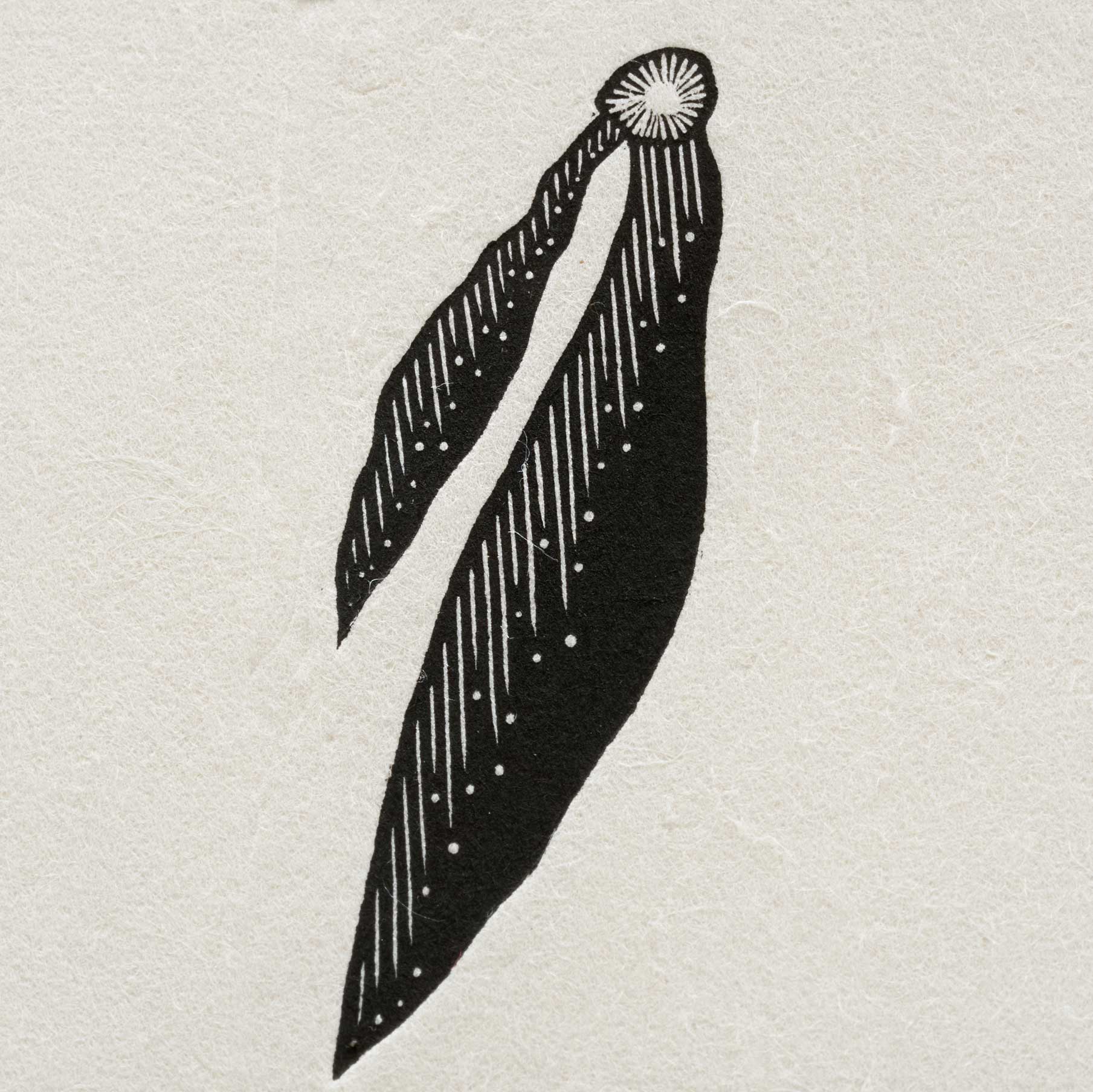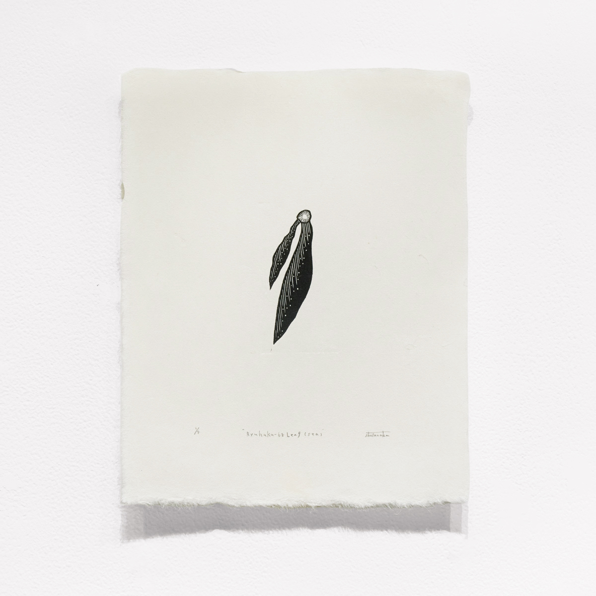 海岸に打ち上げられた石が、月の引力によって再び海へと引き戻される際に砂浜に残る痕跡をスケッチし、それを元に制作した木版画です。版木を電熱ペンで焦がしながら彫り、和紙にバレンで摺っています。茨城県常陸大宮市で生産される西ノ内和紙を使用しています。