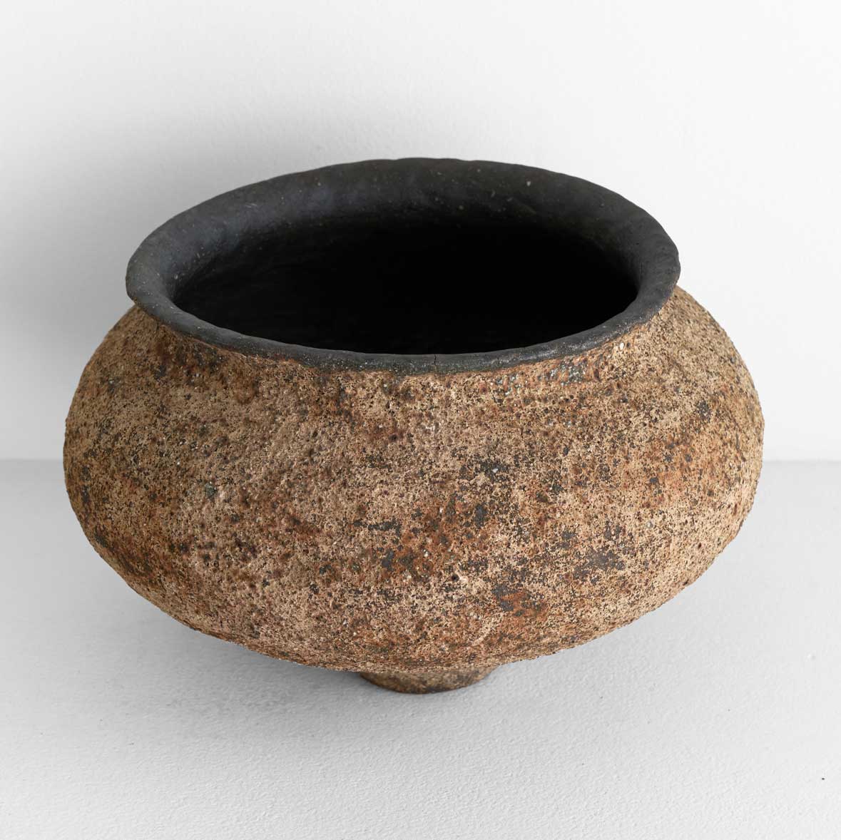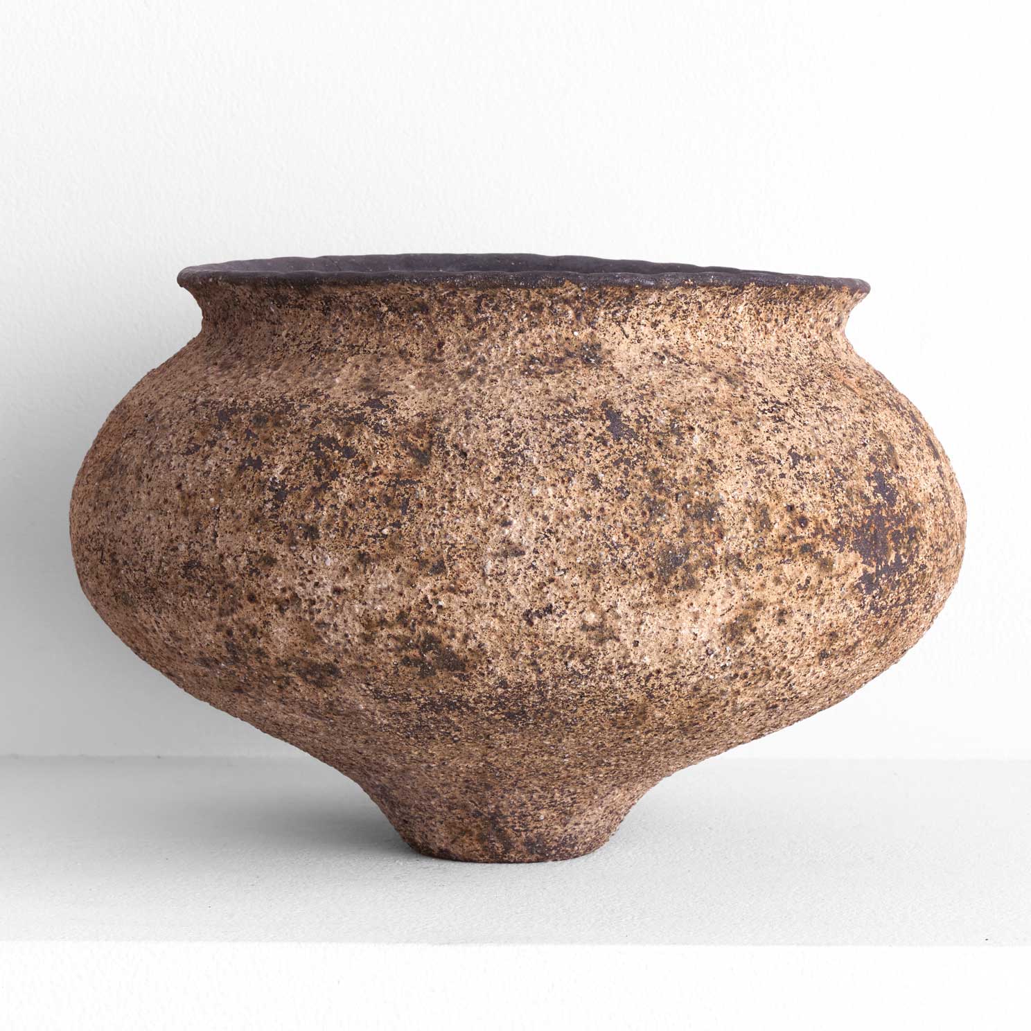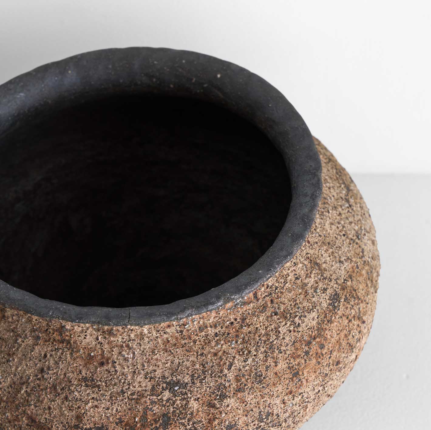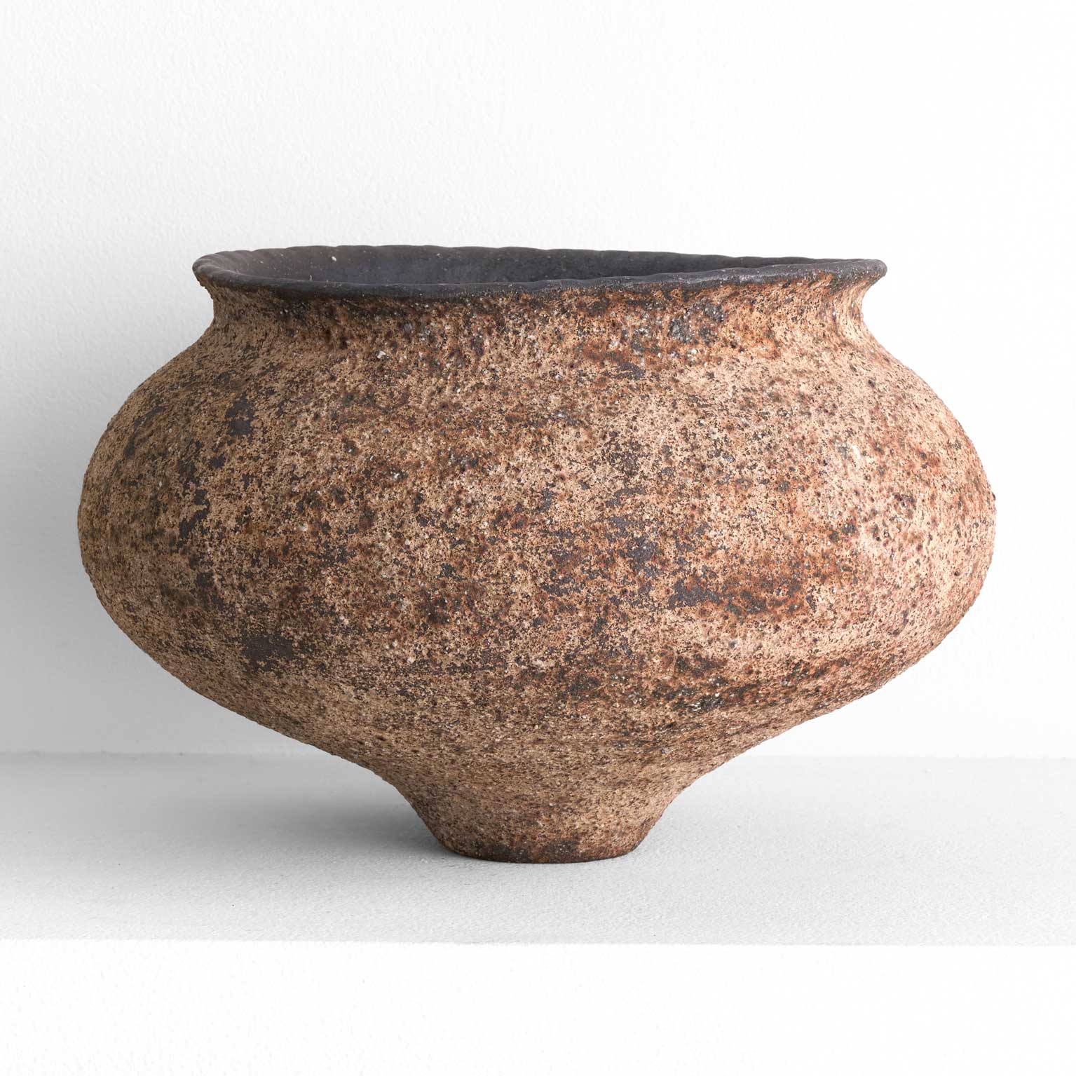 両手で包み込みたくなるようなフォルムに、手捻りならではの揺らぎと削り出しの表情が重なり、温もりと力強い存在感を感じさせてくれます。花器としてもご使用いただけます。水を注ぐと、時間の経過とともに作品自体が湿り気を帯び、色合いにさらに深みが増します。水が腐りにくいため、植物を生けるのにも適しています。