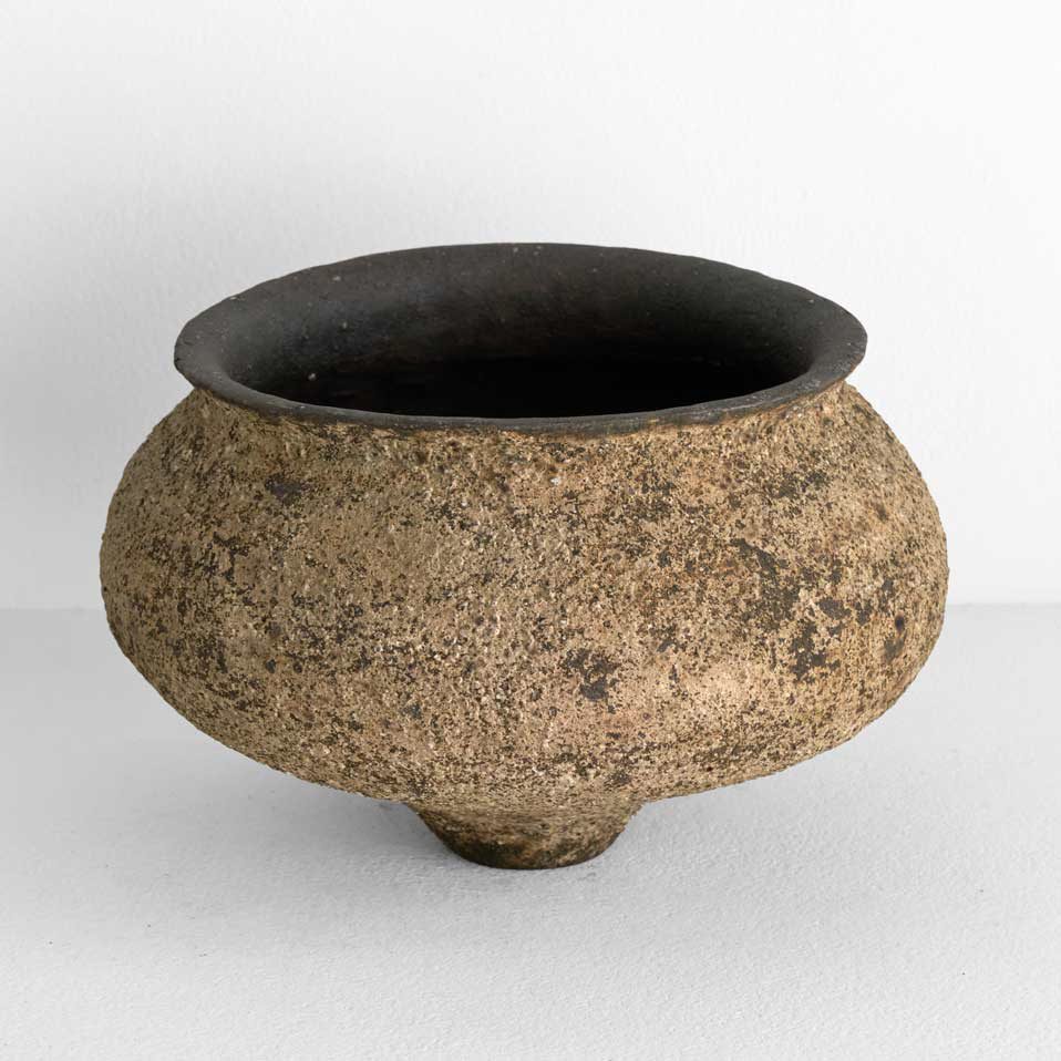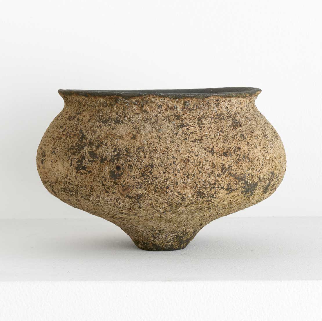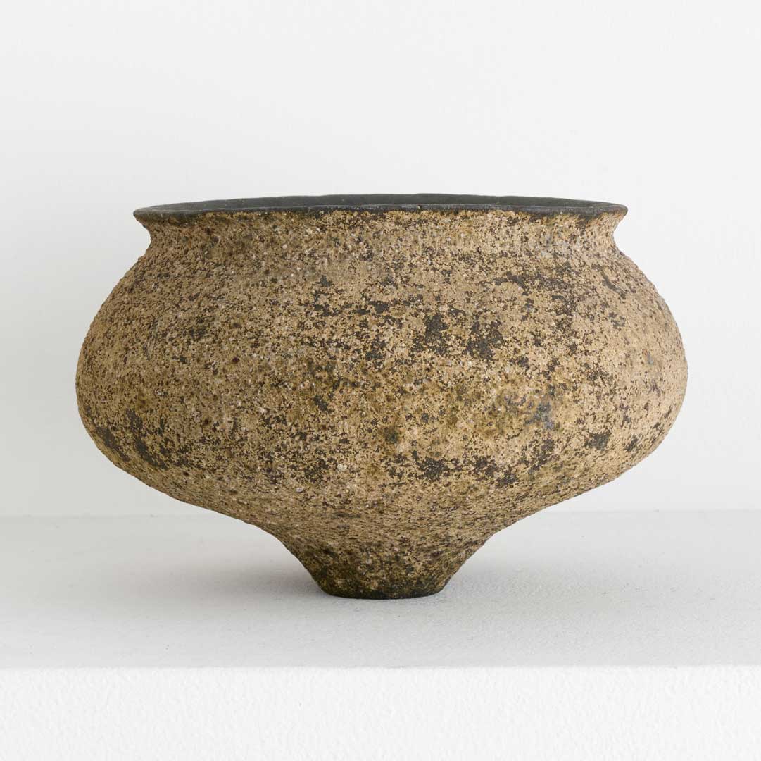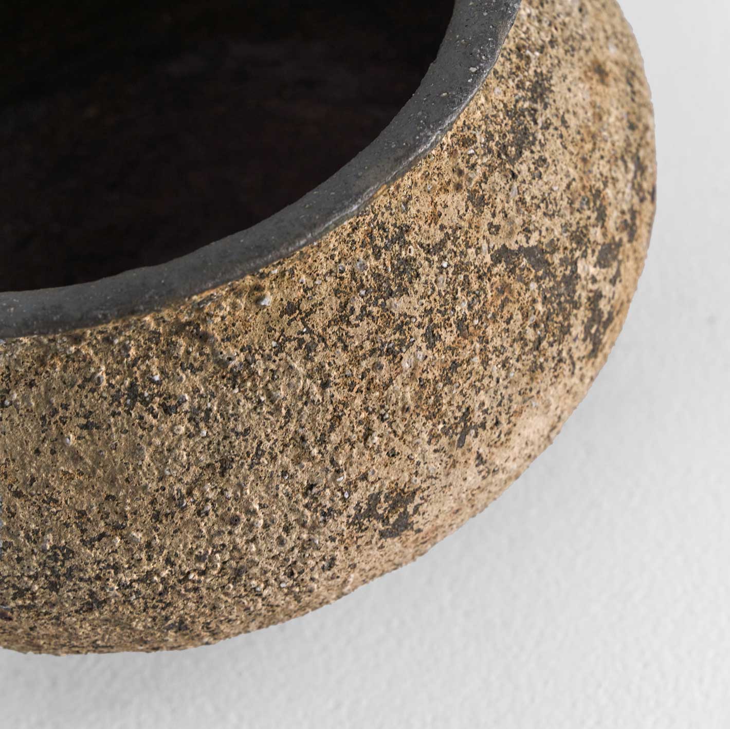 両手で包み込みたくなるようなフォルムに、手捻りならではの揺らぎと削り出しの表情が重なり、温もりと力強い存在感を感じさせます。花器としてもご使用いただけます。水を注ぐと、時間の経過とともに作品自体が湿り気を帯び、色合いにさらに深みが増します。水が腐りにくいため、植物を生けるのにも適しています。
