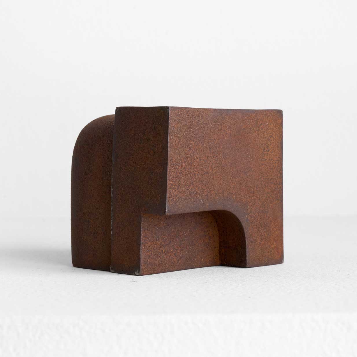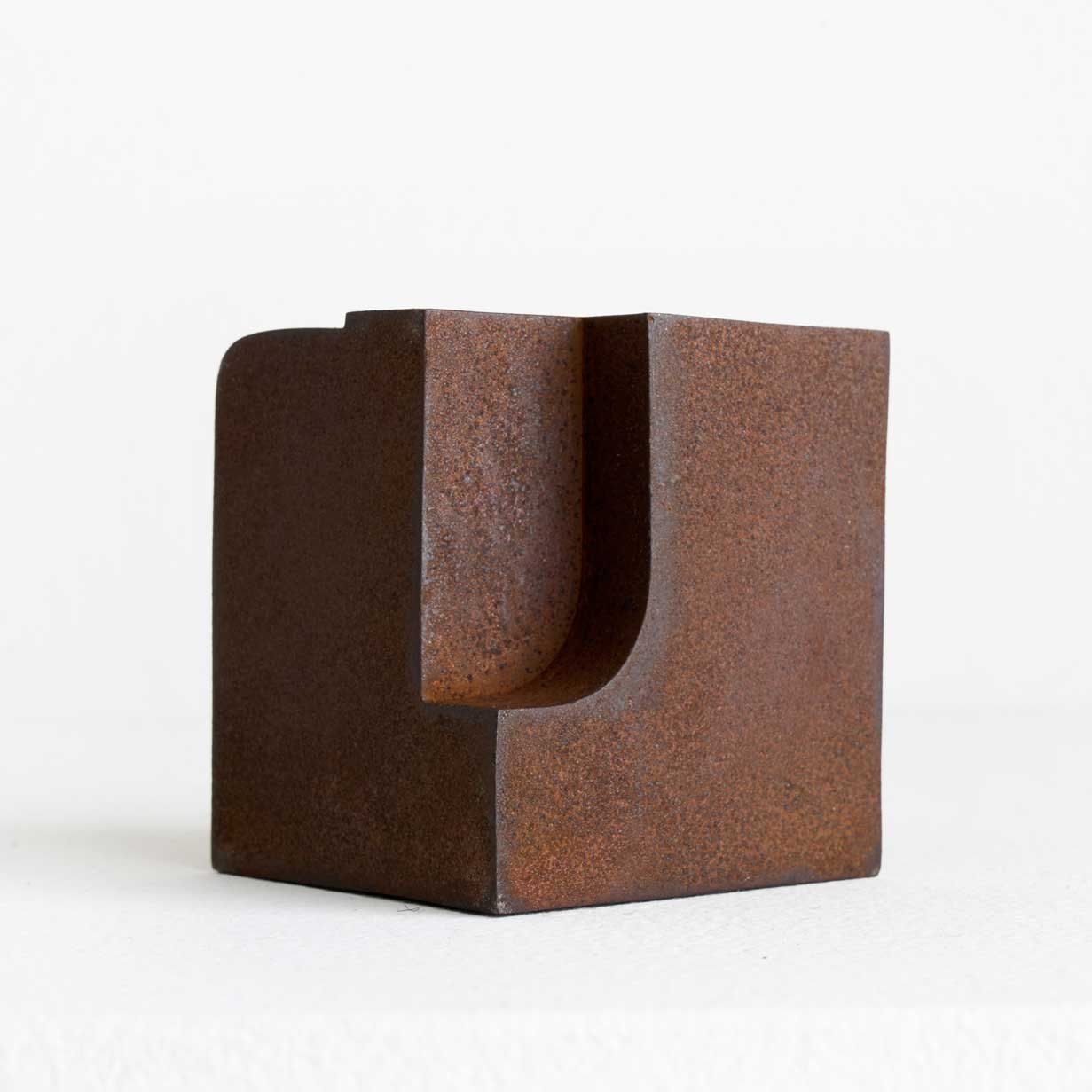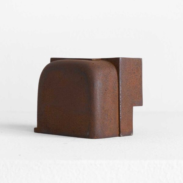 梱包材として使われる発泡スチロール製の緩衝材を鉄板で囲い、溶接によって密封した作品です。表面には錆を施し、あえて自然の経年変化に委ねる仕上げを採用しています。環境により表情が多少の経年変化を伴うのも特徴のひとつです。