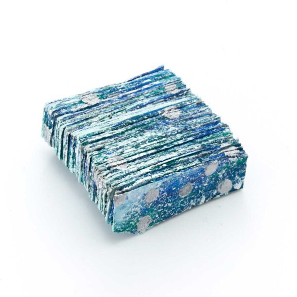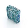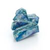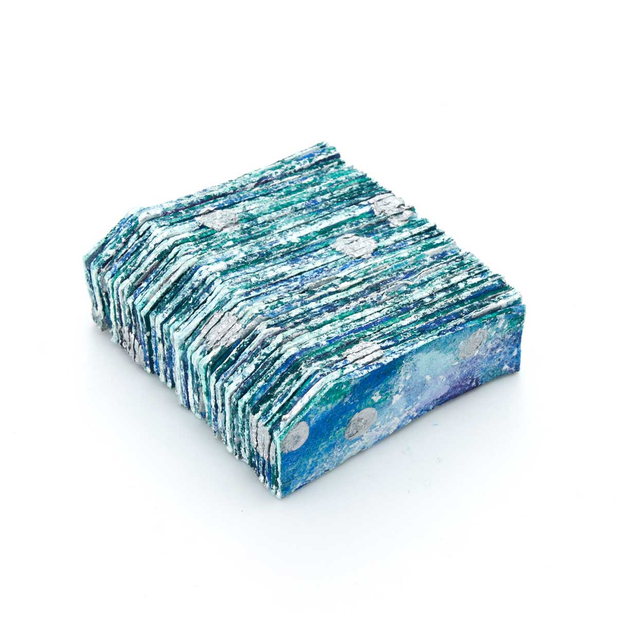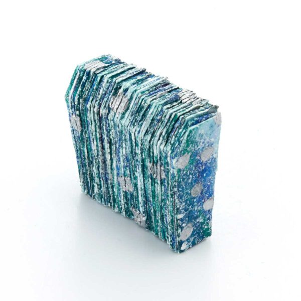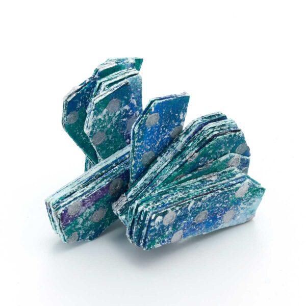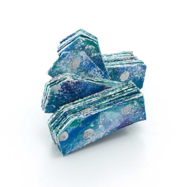 ポリエステル生地に増粘剤調整をした樹脂顔料を染み込ませてから、両面を何層か染め重ね、テクスチャーをつけたピースを重ねて糸で繋げています。形と色から、氷のような涼しげな雰囲気です。