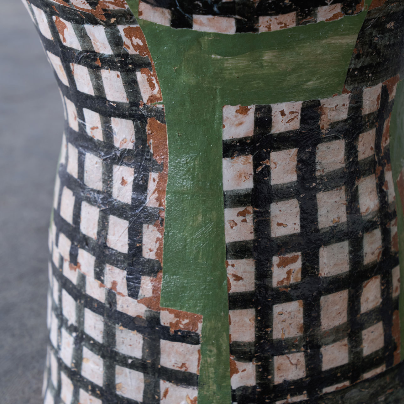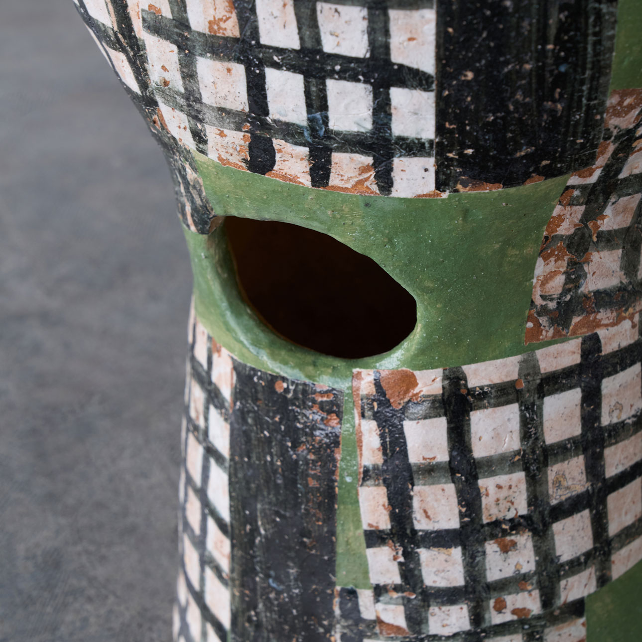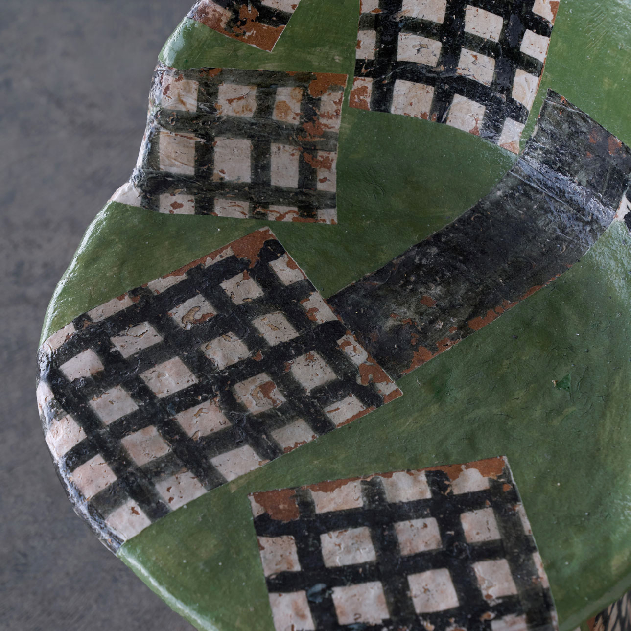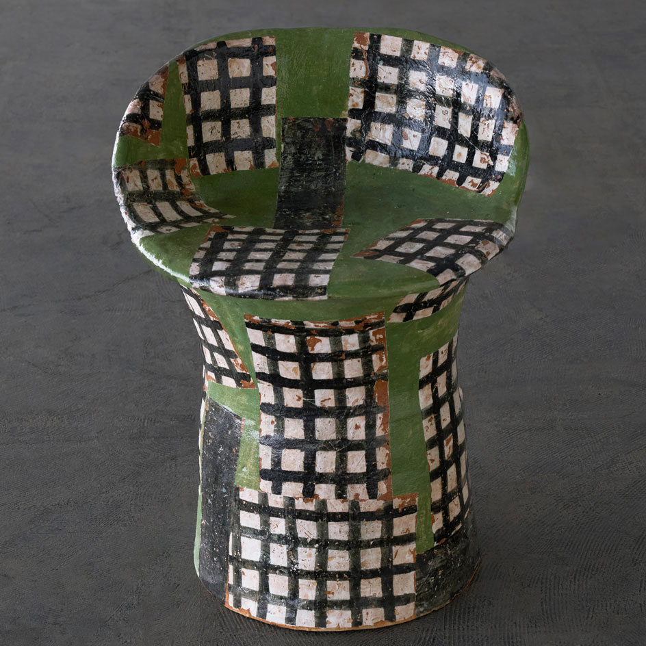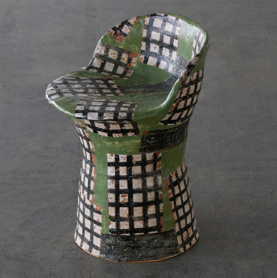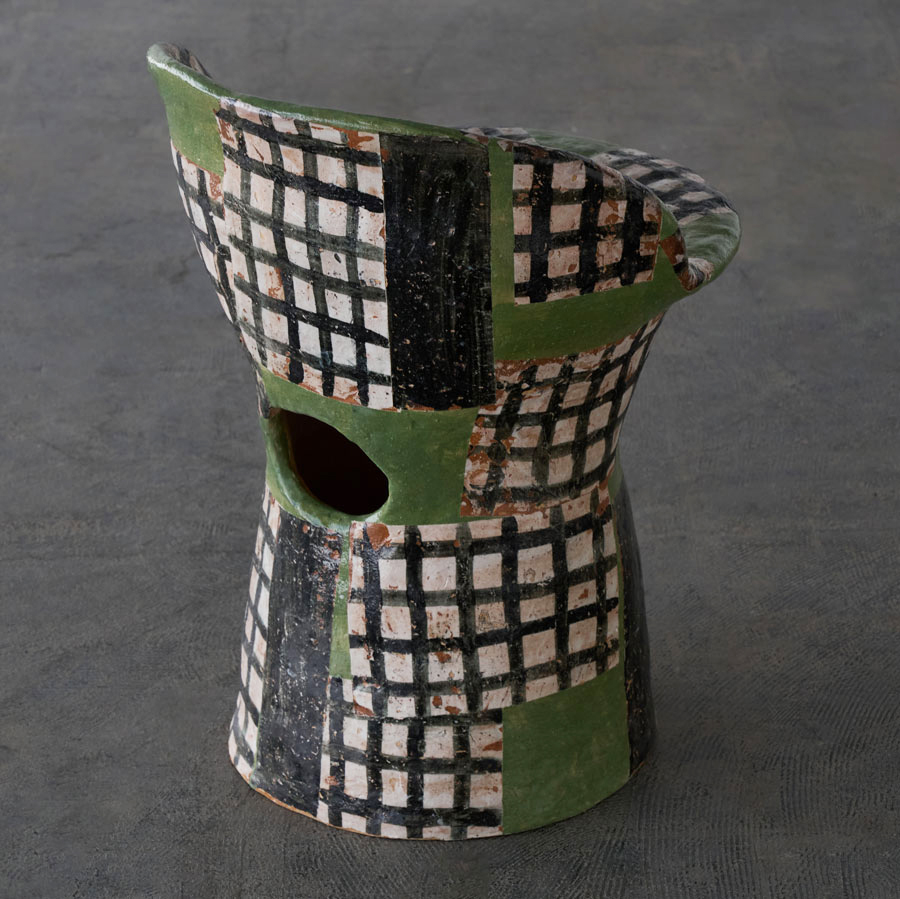 A ceramic chair adorned with a checkered pattern in a serene shade of green.Though solid and weighty, the opening in its back allows it to be moved with ease.Its ceramic form harmonizes beautifully with both indoor and outdoor spaces.The pattern is applied using a technique known as transfer printing.