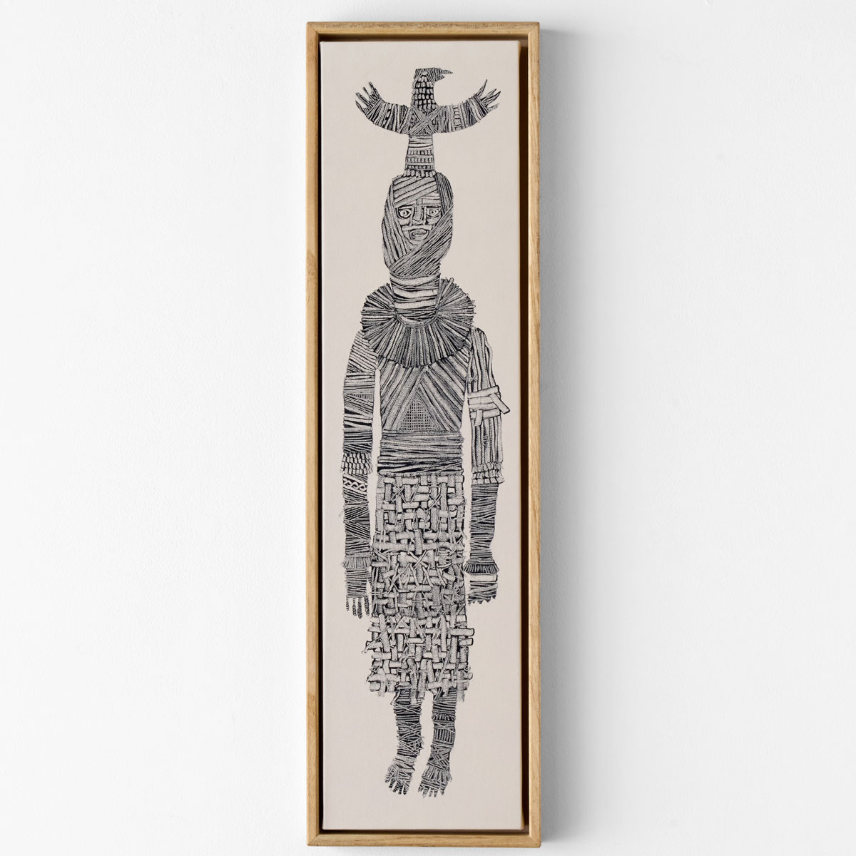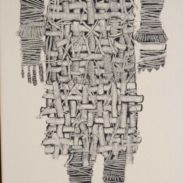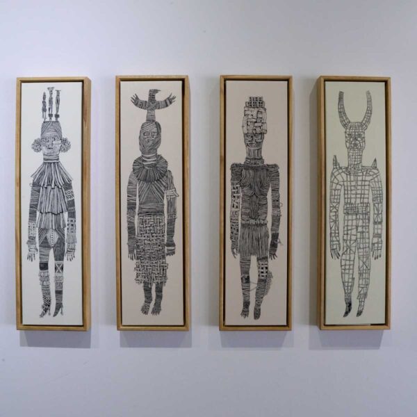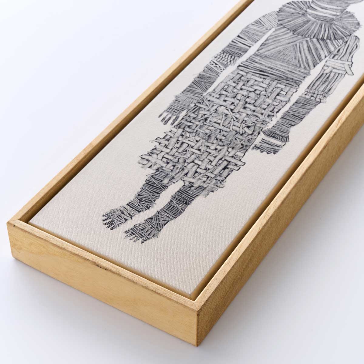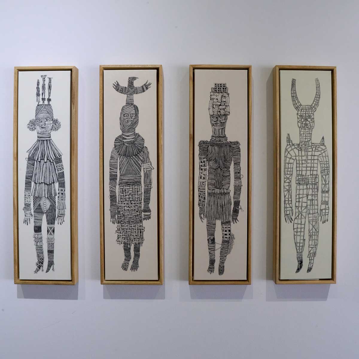 縫う、編む、巻きつける、これらのモチーフで構成した衣装を纏った人物画のシリーズ。鳥のモチーフは繁栄や幸運、平和がこめられているそうです。