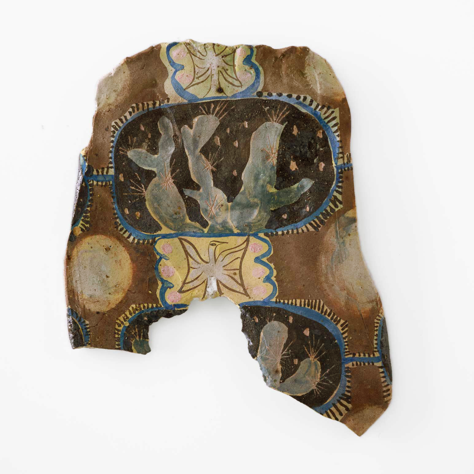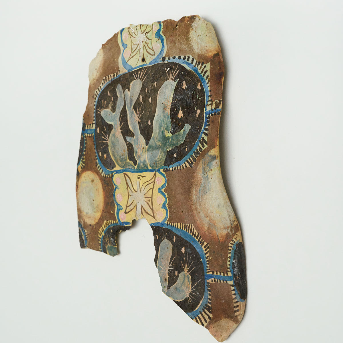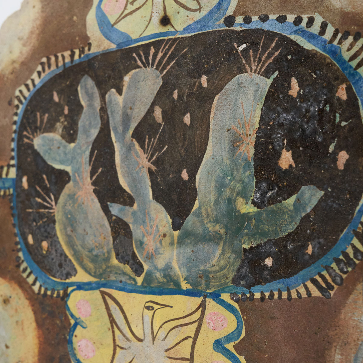 Motifs such as cacti and birds are depicted in a patterned design.It is a work in which form and color resonate beautifully.