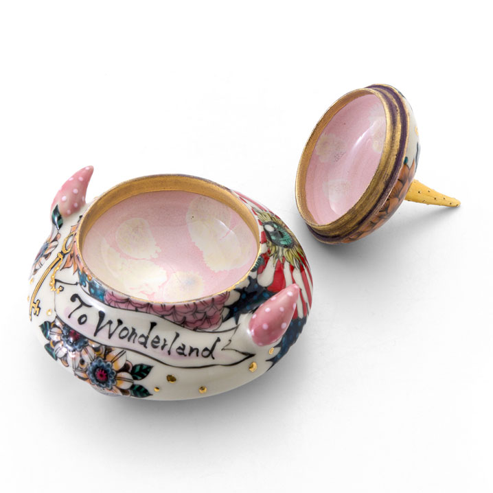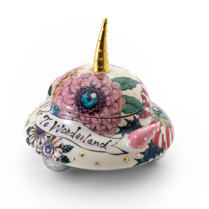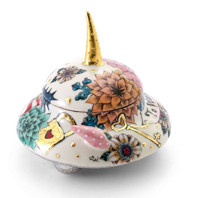 This is a small UFO-shaped lidded container. It is richly adorned with floral motifs across the entire surface, while the key and antenna are embellished with elegant gold detailing. The playful form harmonizes with the delicate decoration, making it a piece that brings a smile each time you hold it.