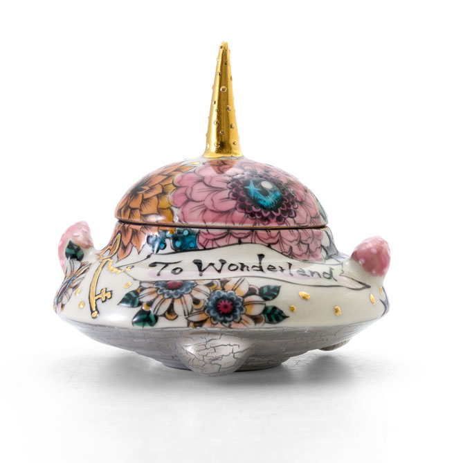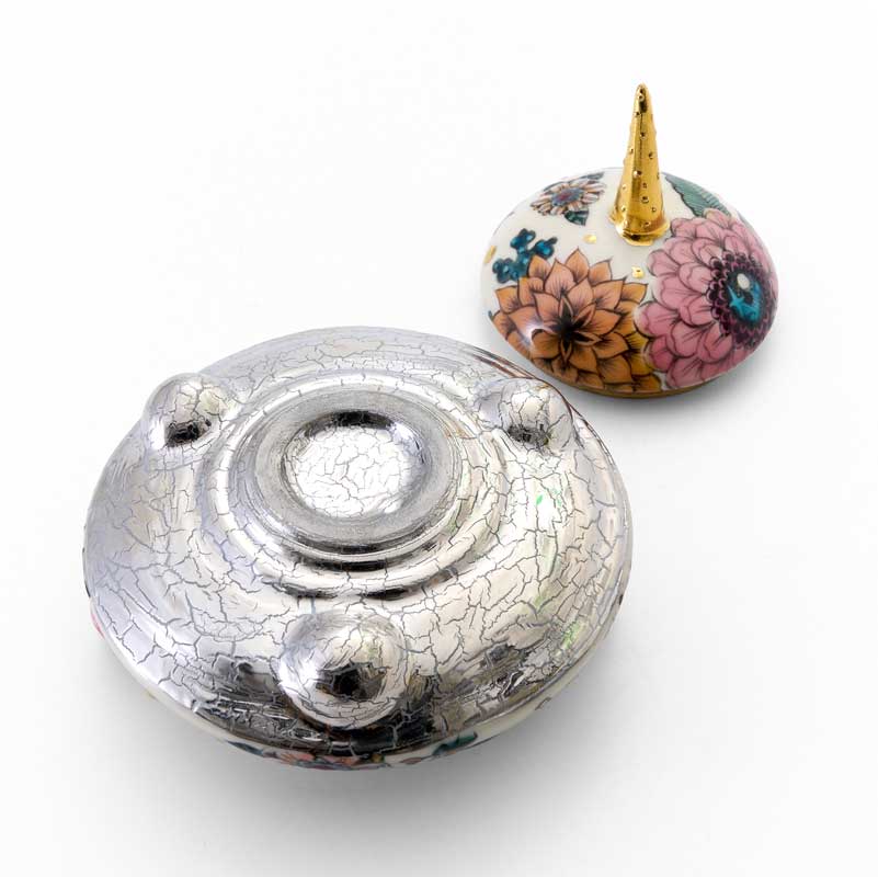 UFO型の小さな蓋物です。全体に花がふんだんに描かれ、鍵とアンテナには華やかな金彩が施されています。ユーモラスな形と繊細な装飾が響き合い、手に取るたびに微笑みを得られる作品です。