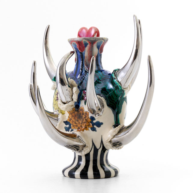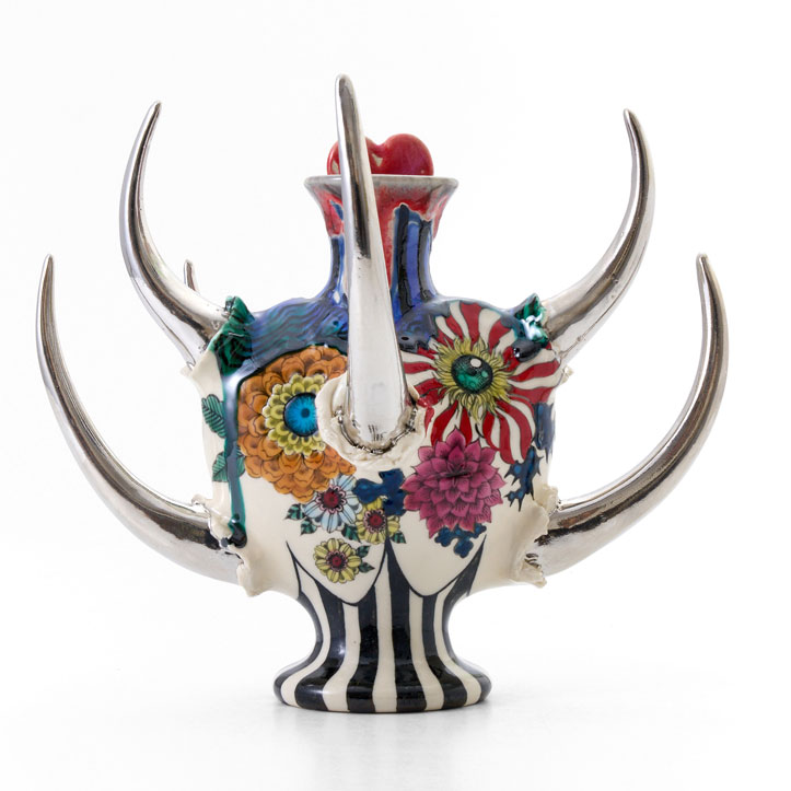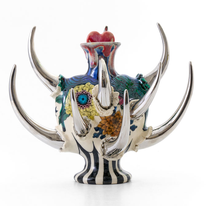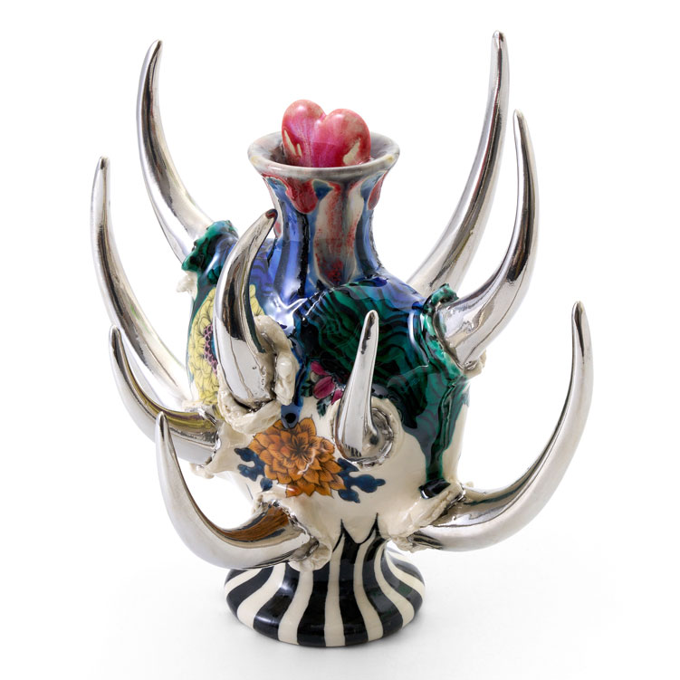 The babirusa, native to Indonesia, is sometimes called “the animal that faces death,” because its tusks grow toward its own face. The longer they grow, the more they bring the animal closer to danger. In this piece, a heart seems about to spill out from the vase’s opening, while the tusks loom threateningly— which will arrive first? The work evokes the dilemmas that lie at the heart of love.