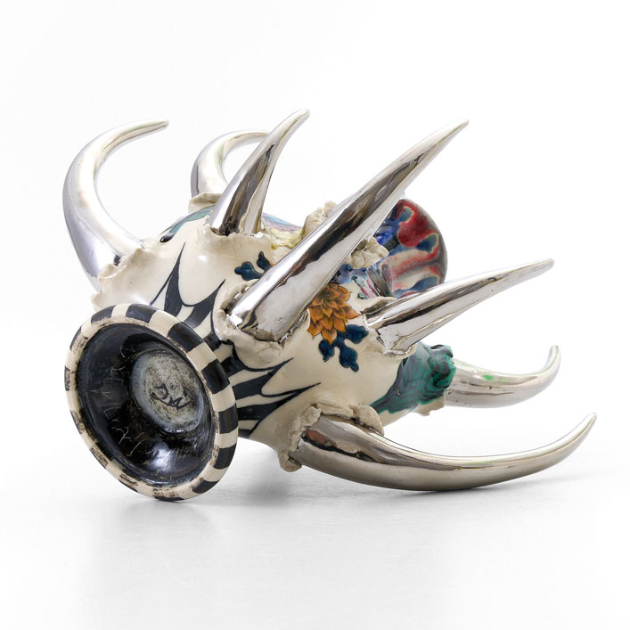 インドネシアに生息するバビルサは、牙が自らに向かって伸びることから「死を見つめる動物」とも呼ばれています。伸びれば伸びるほど、自身を危険へと近づけてしまうその姿。壺の口から今にもあふれ出しそうなハートと、わが身に迫る角、どちらが先に訪れるのか。恋愛に潜むジレンマを象徴するかのような作品です。
