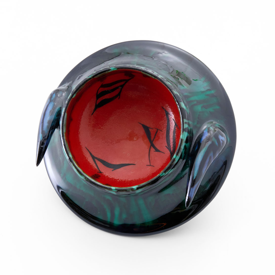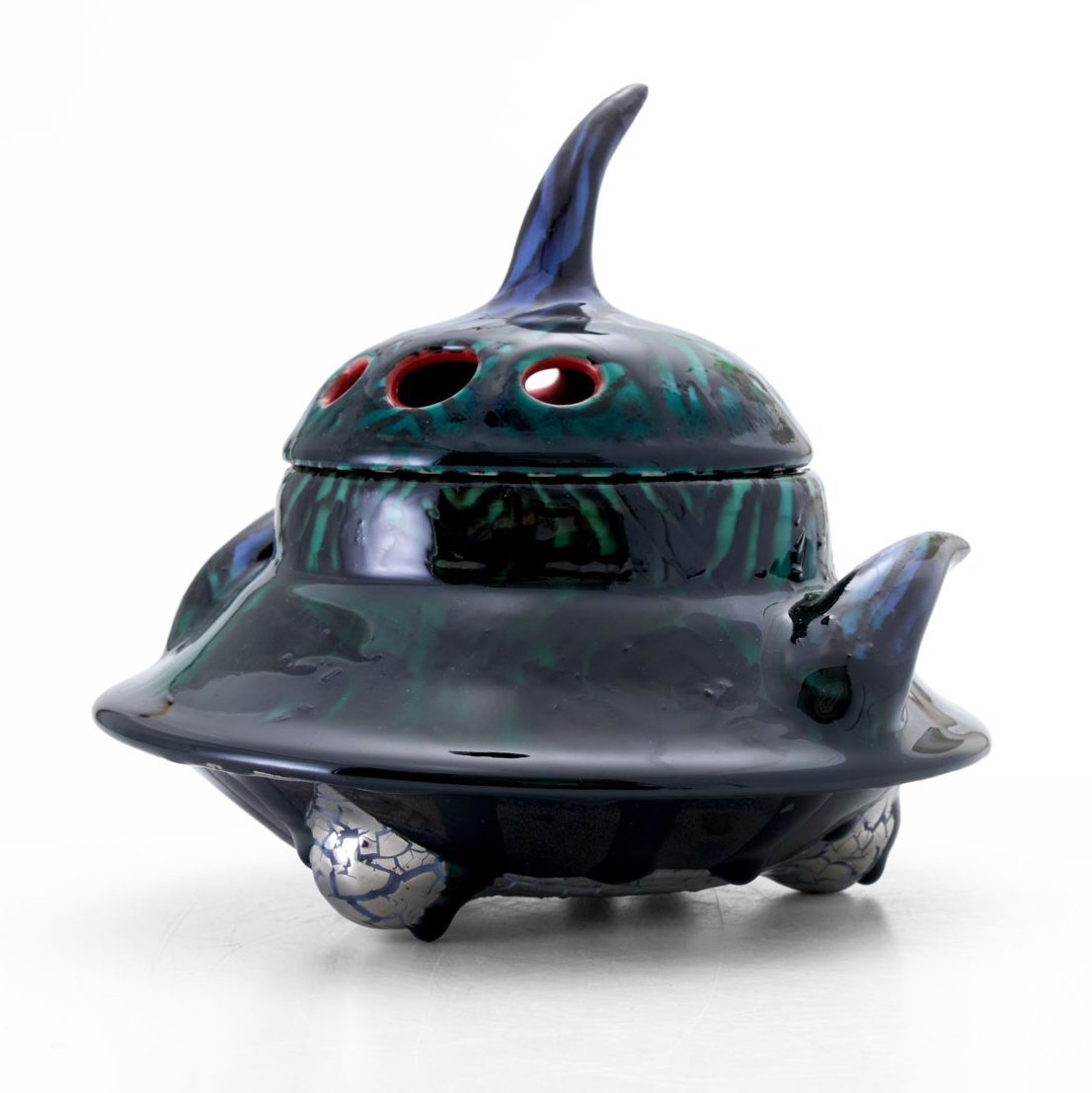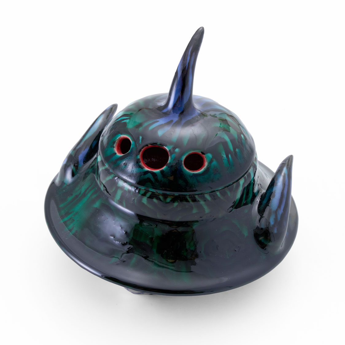 This UFO-shaped incense burner is painted with colors reminiscent of traditional old Kutani ware. Inside the lid, distorted Roman numerals are depicted, creating a whimsical world that seems to warp through time and space. The work combines traditional techniques with a playful, sci-fi-inspired imagination, sparking creativity and wonder. It can be enjoyed as a functional incense burner or displayed as a decorative piece.