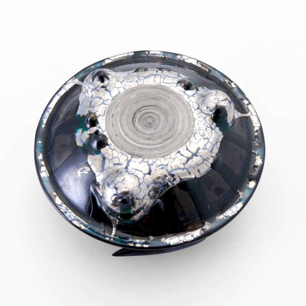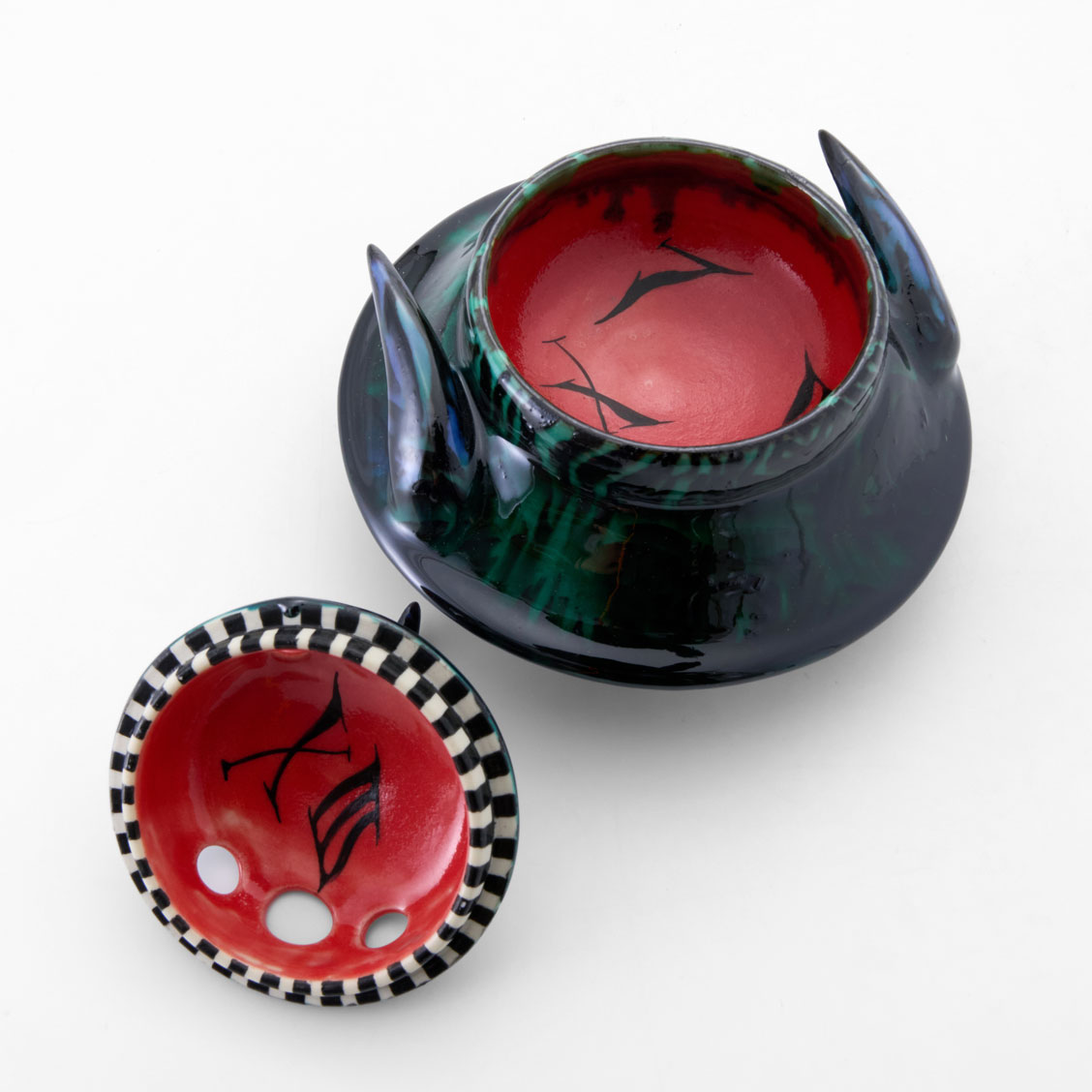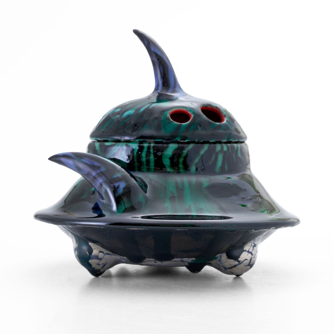 古九谷風の絵の具で彩られたUFO型の香炉です。蓋の内側には歪んだローマ数字が描かれ、時空を超えてワープするような不思議な世界観が広がります。伝統的な技法とSF的な遊び心が融合した、想像力をかき立てられる作品です。香炉として日常使いできるだけでなく、飾ってもお楽しみいただけます。