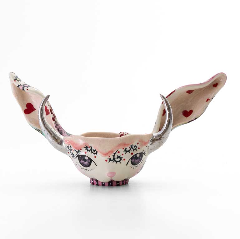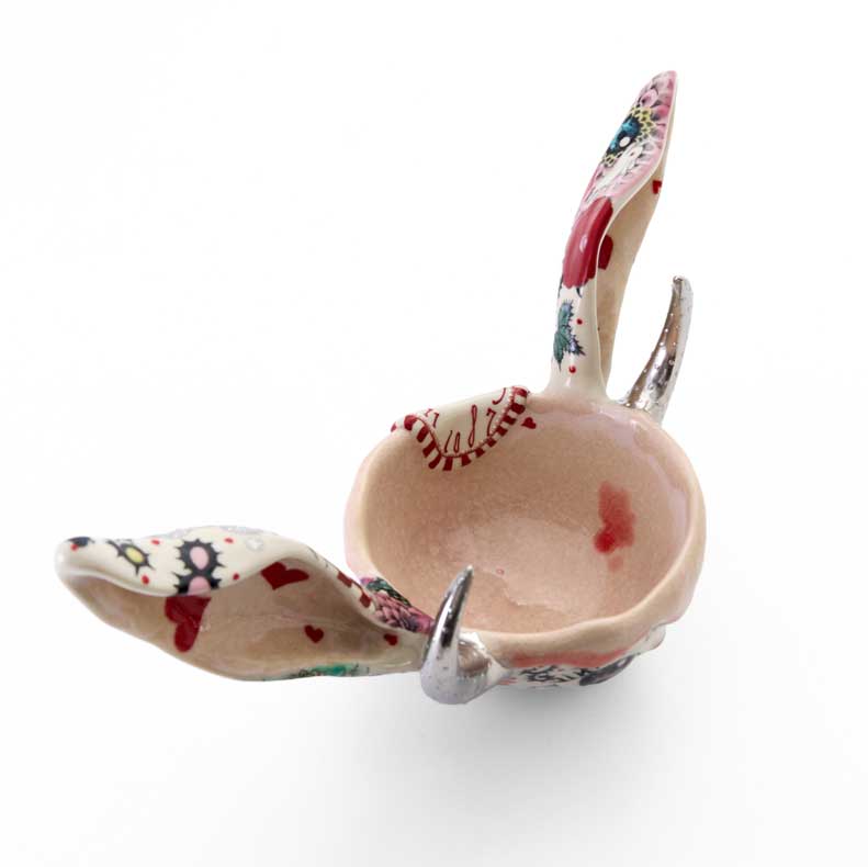 大きなうさぎの耳をあしらったお抹茶碗です。耳は長く伸び、見る者の視線を引きつけるとともに、耳を澄ませて周囲の気配に敏感なうさぎの特性を象徴しています。遊び心あふれる形状の中に、生命力や純粋な感受性、そして新たな始まりへの希望を感じさせる作品です。
