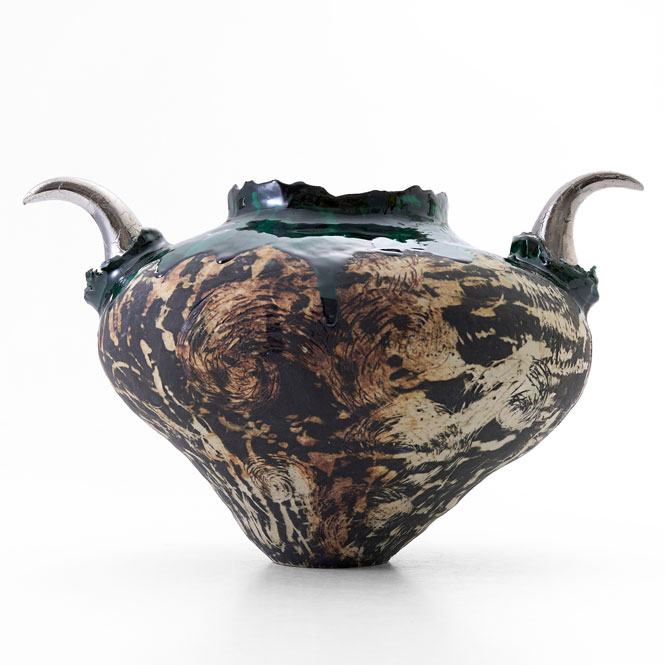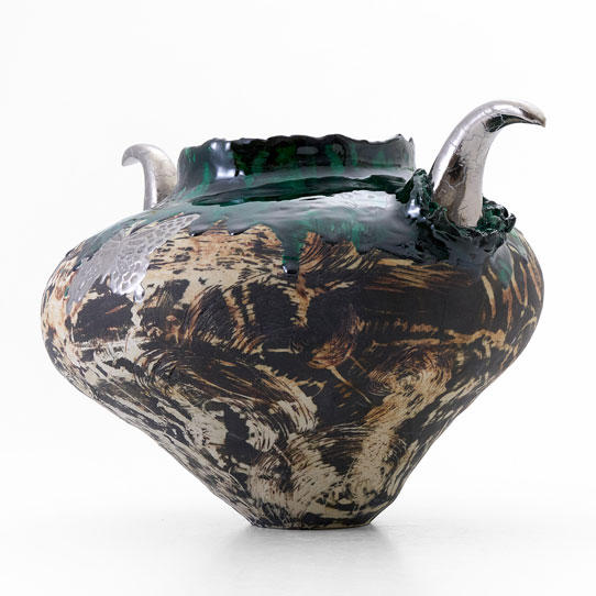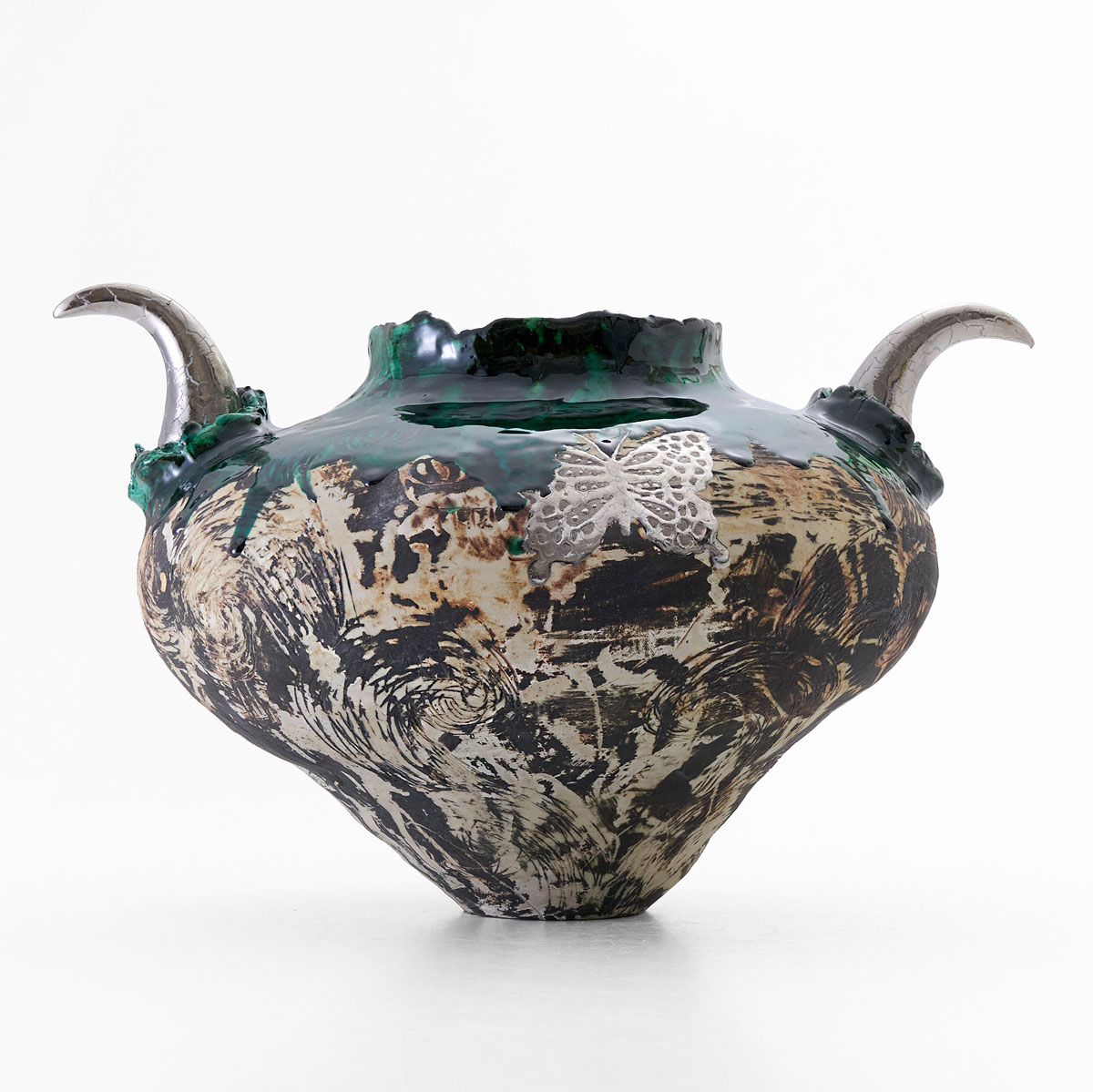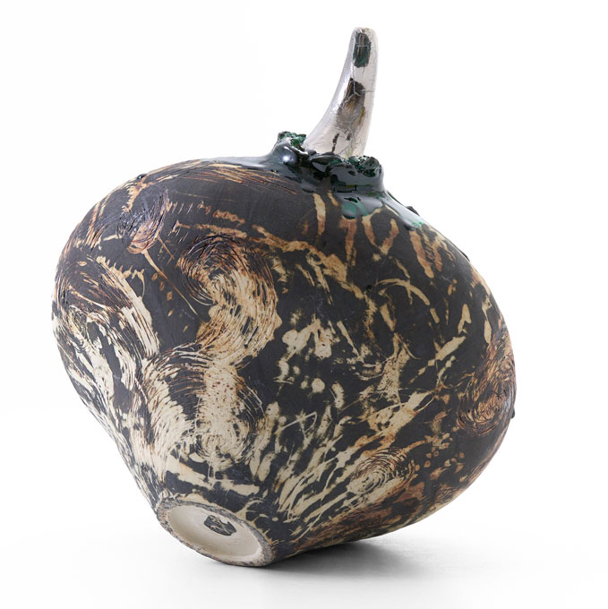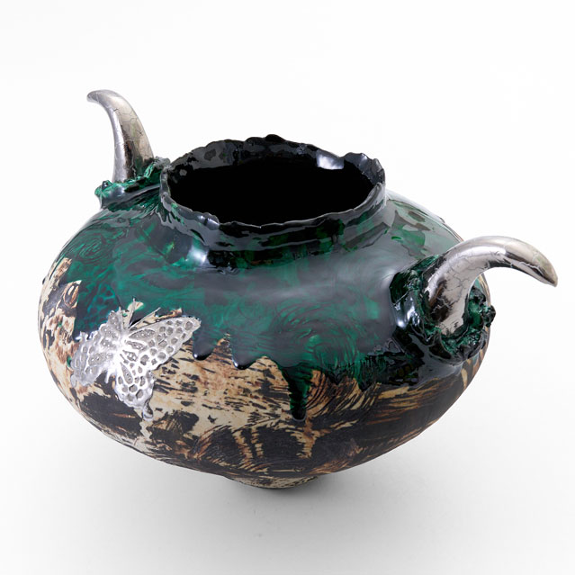 The contrast between dry earth and lush moss is expressed using black slip and blue Kutani pigments. Added to this, the rough texture created by freehand brushwork gives the piece a powerful presence. This is an ambitious work in which Mizumoto boldly explores a new form of expression.