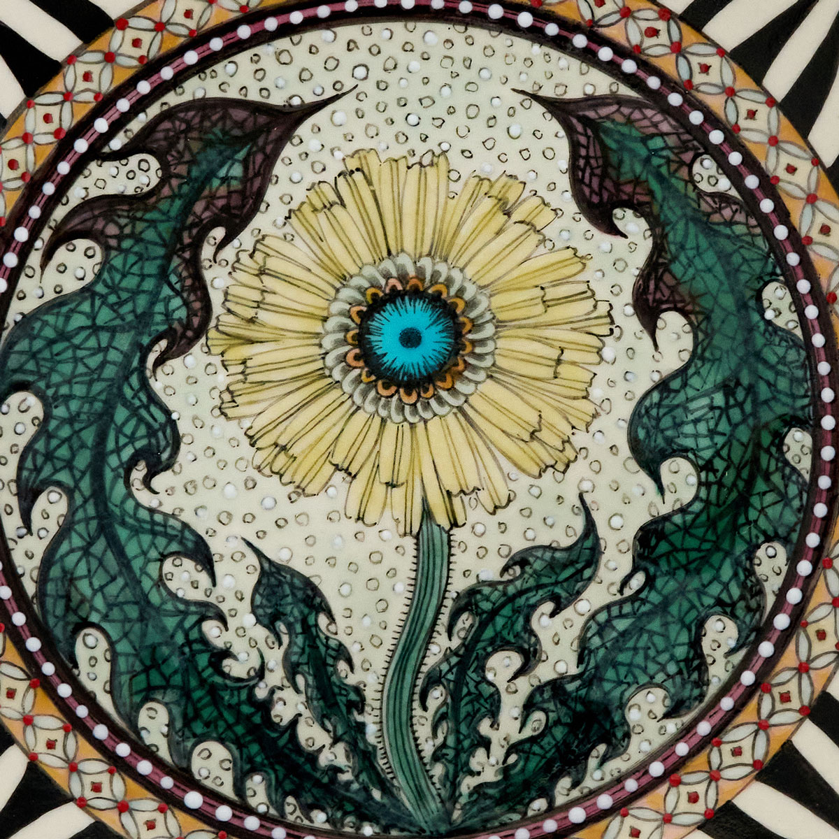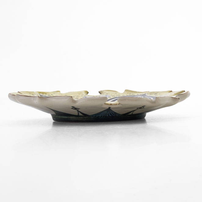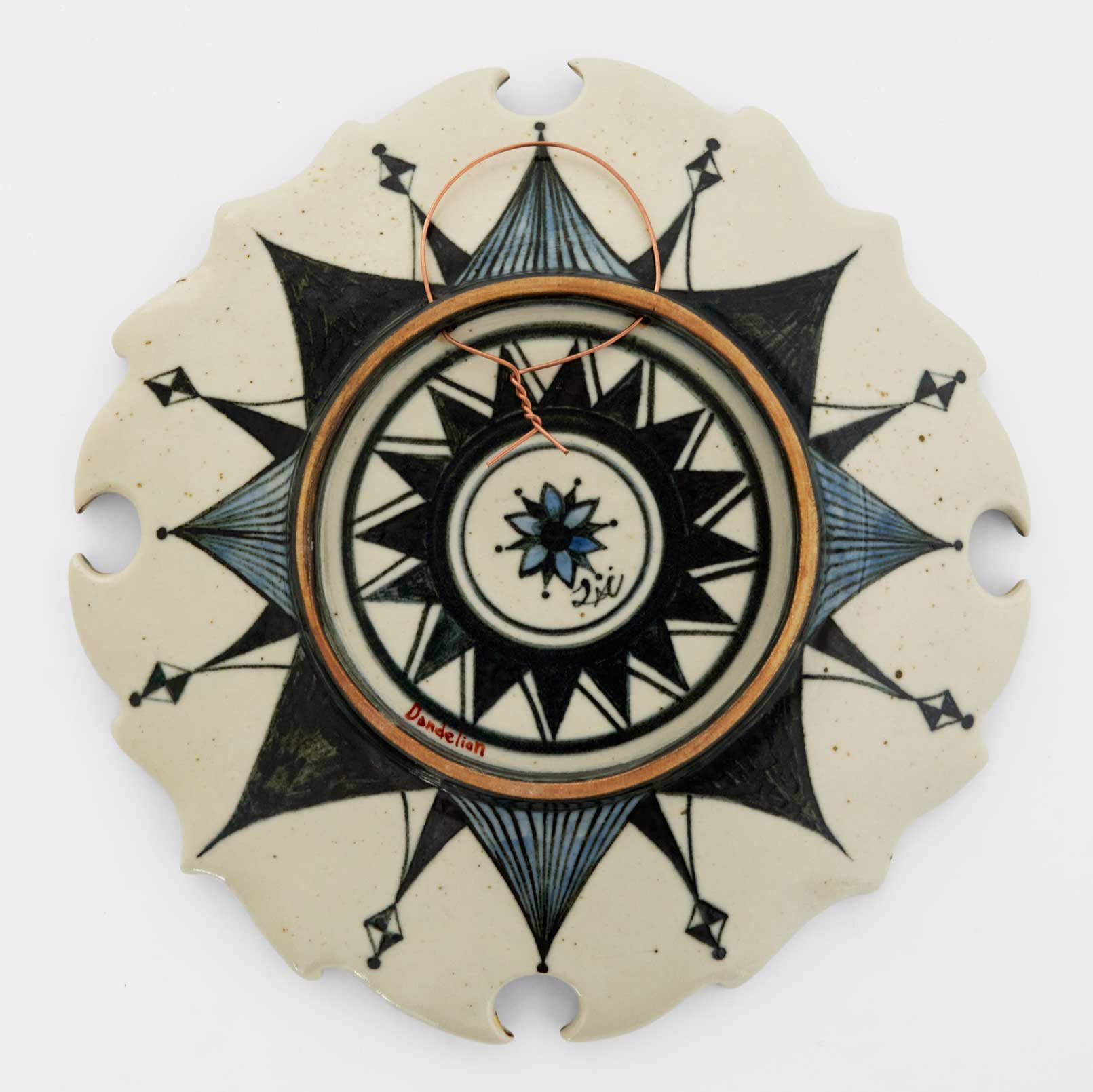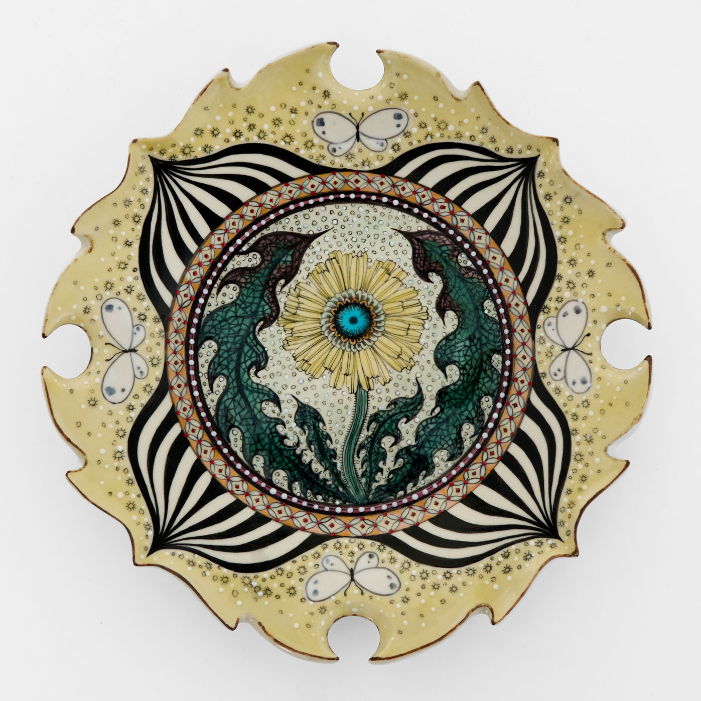 蒲公英(たんぽぽ)と蝶をモチーフにした一枚です。地色には古い九谷焼に見られる細やかな文様が丁寧に描き込まれ、その上に白い粒が重なり、奥行きと静かなきらめきを生み出しています。伝統的な装飾と軽やかなモチーフが響き合った作品です。器として日常使いできるだけでなく、壁掛けとしてもお楽しみいただける一枚です。