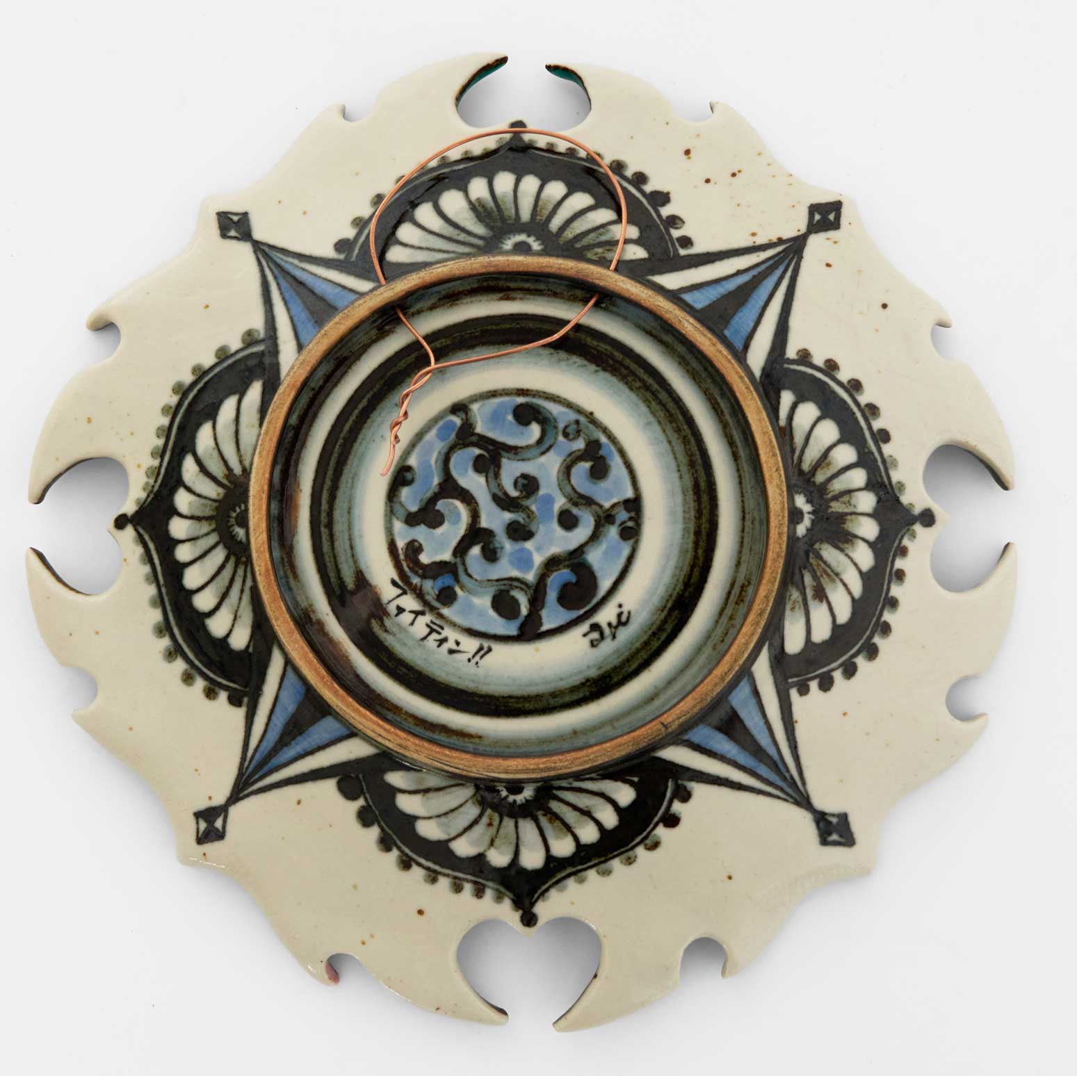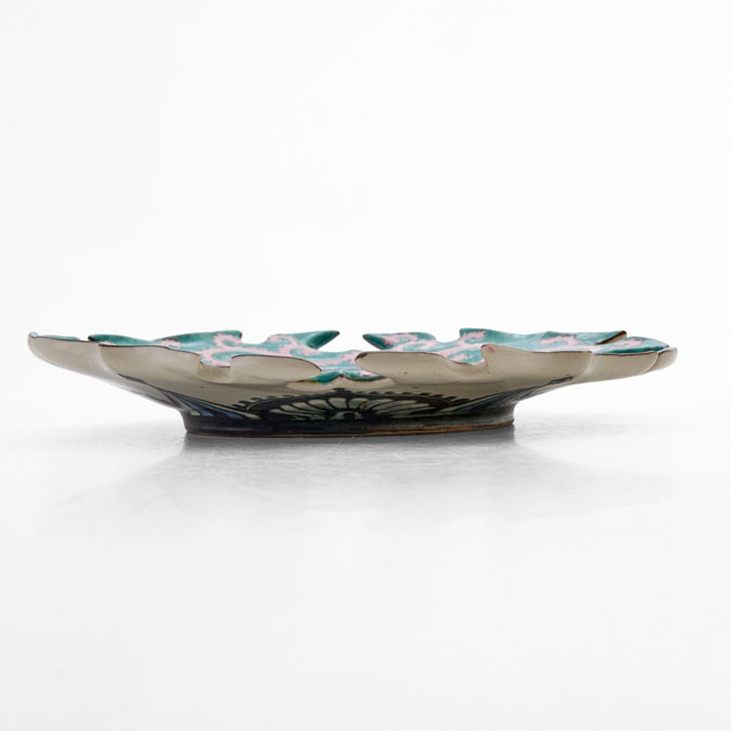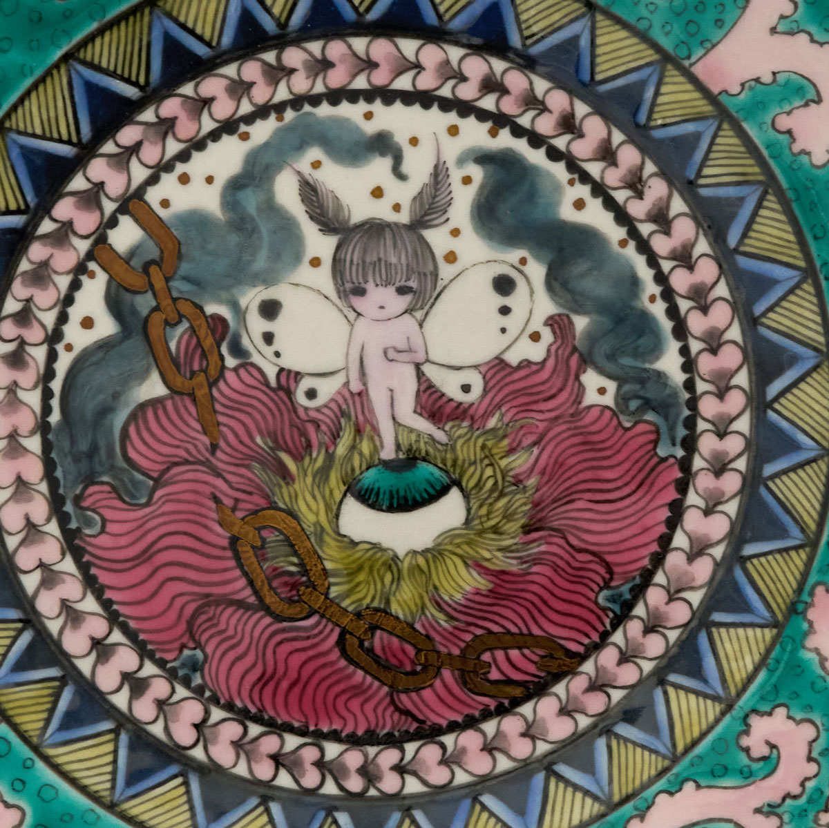 「ファイティン!」と題された一枚です。強く拳を握り、決意を宿した目玉の上にフェアリーが乗る、印象的なモチーフが描かれています。ユーモラスでありながらも、内に秘めた意志や前へ進む力強さが感じられる表現です。見る者にそっとエールを送るようなエネルギーを湛えた作品です。器として日常使いできるだけでなく、壁掛けとしてもお楽しみいただける一枚です。