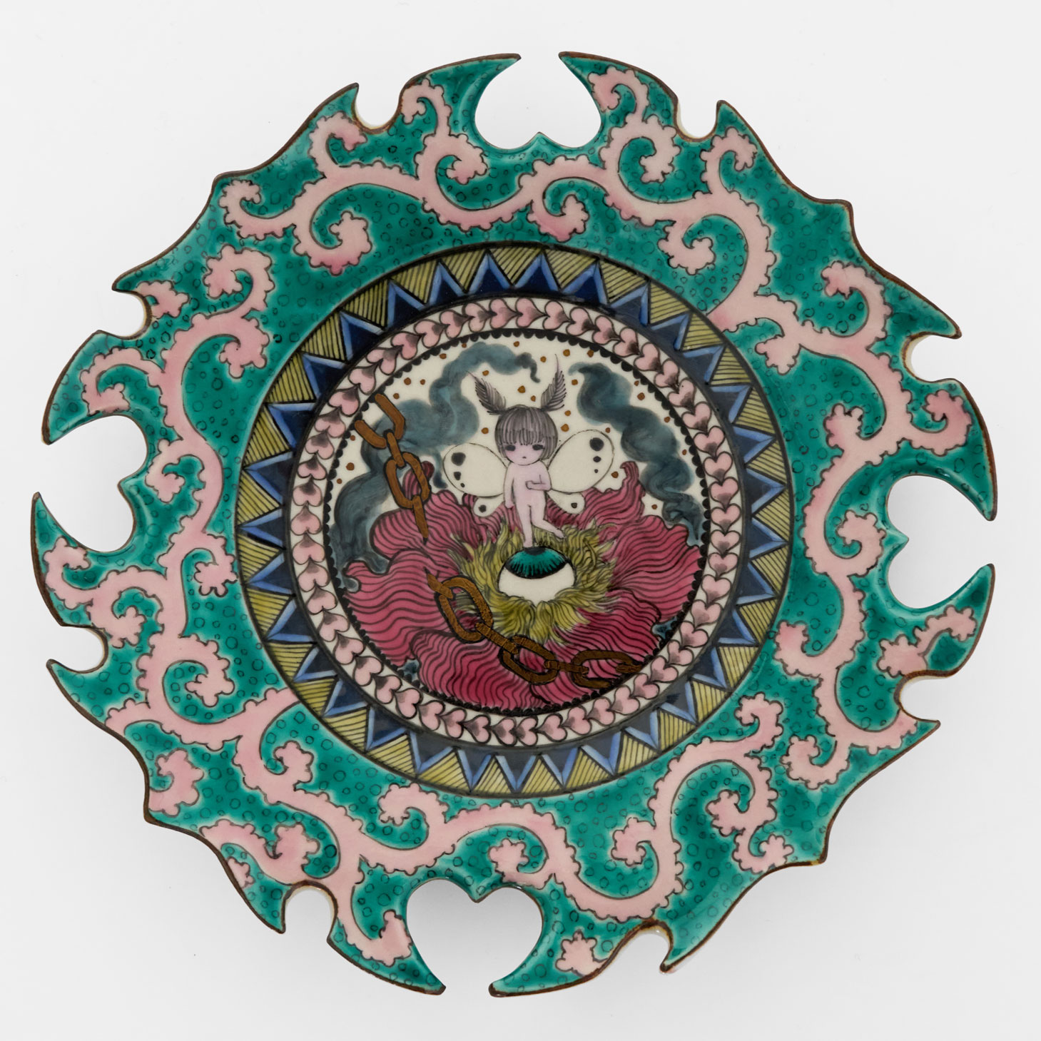This piece is titled “Fighting!” It depicts a striking motif of a fairy perched atop an eyeball, with a tightly clenched fist and eyes full of determination. Humorous yet imbued with a sense of inner resolve and forward-moving strength, the work carries an energy that quietly cheers on the viewer. Not only can it be used as a functional vessel in daily life, but it can also be enjoyed as a wall-hanging.