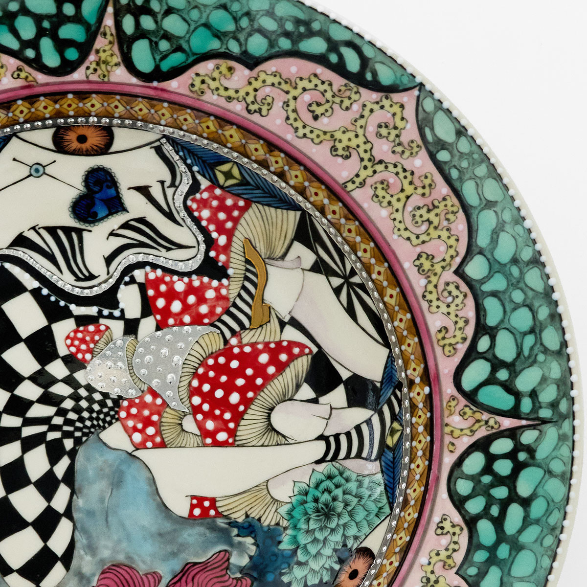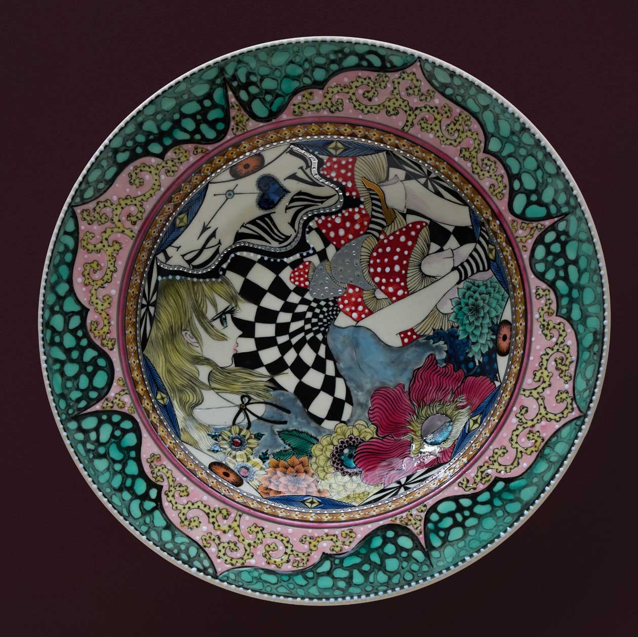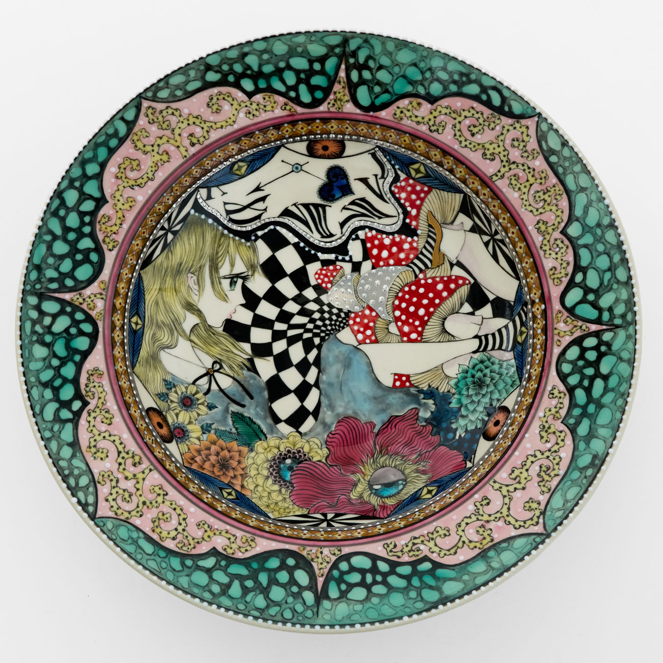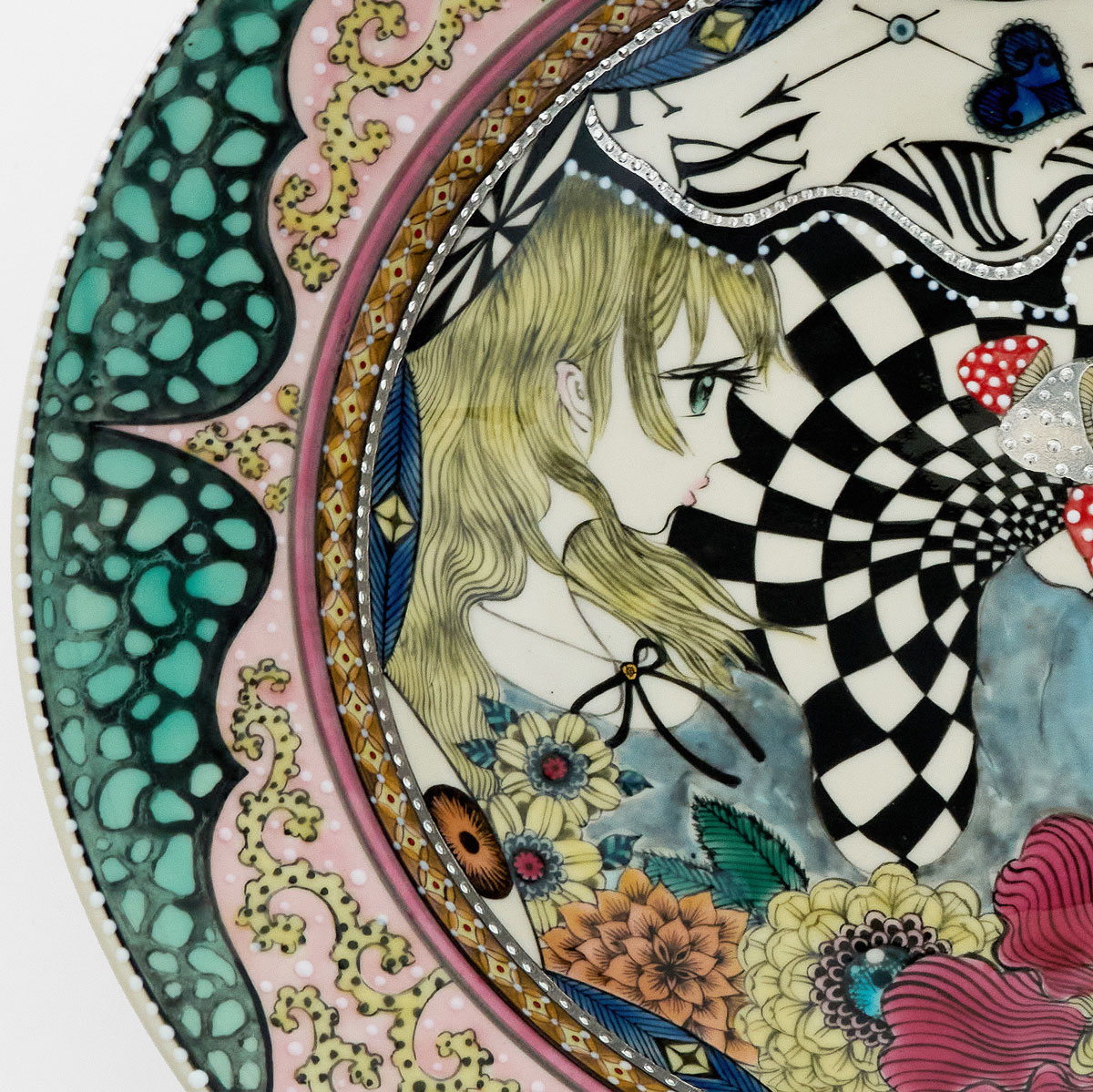 This painted plate captures a fleeting moment when, one day, you awaken to the signs of spring and realize that you have grown up. Surrounded by beautiful flowers, poisonous mushrooms, and distorted clocks, it quietly expresses the passage of time and the subtle changes of the heart as reality and fantasy intertwine.