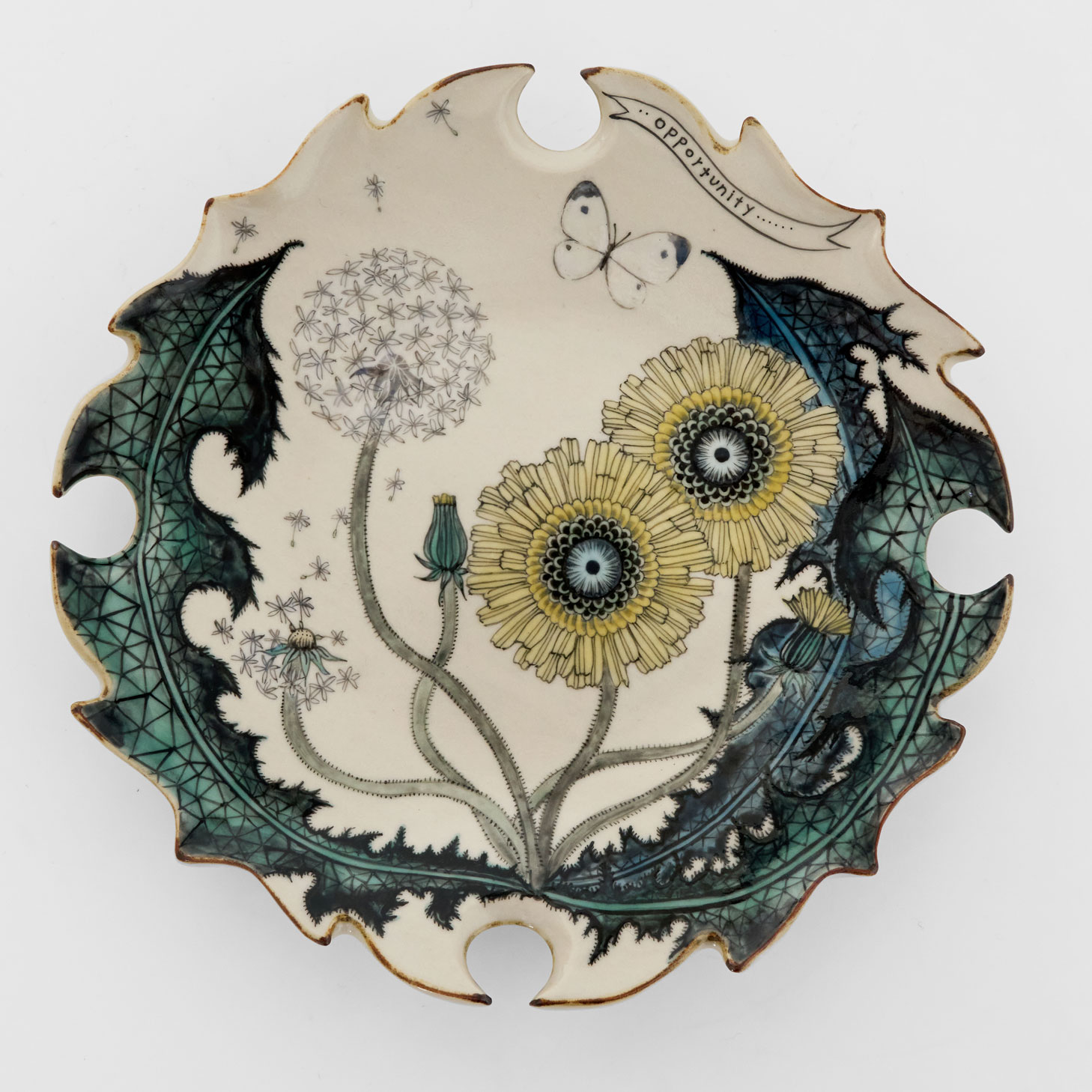 蒲公英(たんぽぽ)をモチーフにした絵皿です。小さく記された「opportunity」の文字には、“好機”という意味が込められています。綿毛と蝶が風に乗って旅立つ様子が描かれ、はじまりや可能性の広がりを感じさせます。軽やかさと前向きな気配をまとった、物語性豊かな作品です。器として日常使いできるだけでなく、壁掛けとしてもお楽しみいただける一枚です。