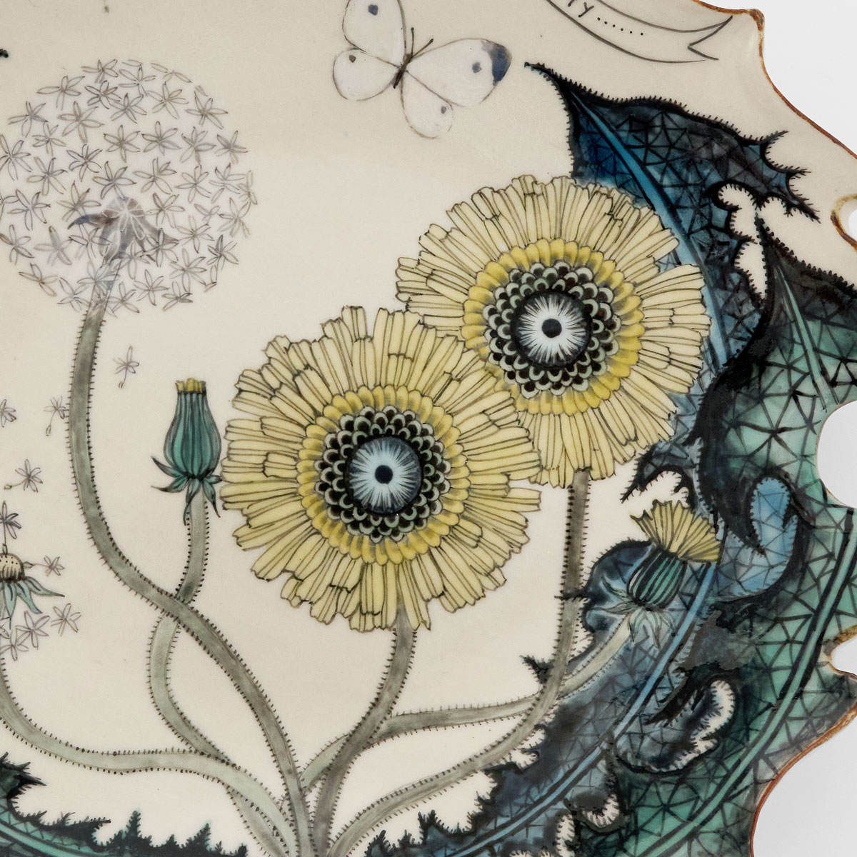 This painted plate features dandelions as its motif. The small inscription “opportunity” carries the meaning of a favorable chance. Depicted are seeds and butterflies drifting on the wind, evoking a sense of beginnings and expanding possibilities. Light and uplifting in character, this work is rich with narrative. Not only can it be used as a functional vessel in daily life, but it can also be enjoyed as a wall-hanging.