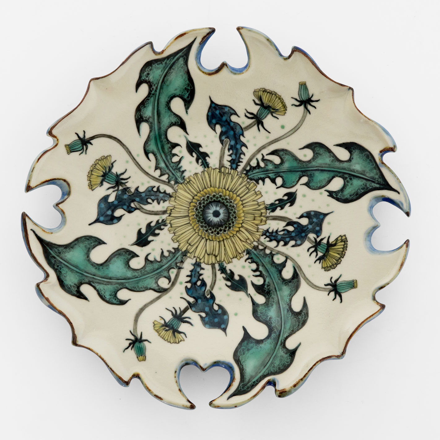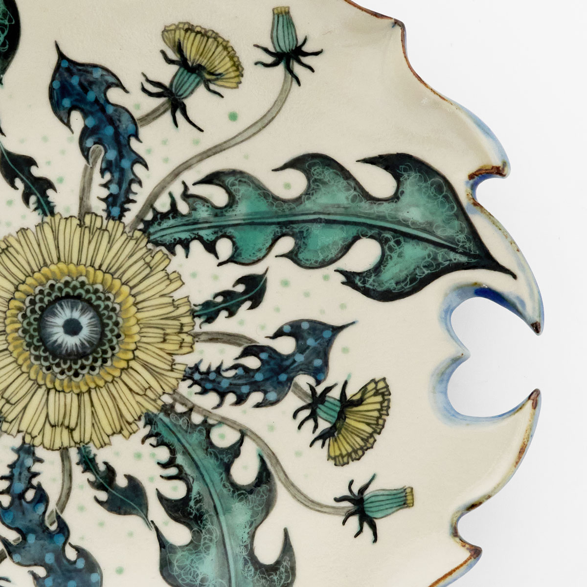 This painted plate features a dandelion viewed from directly above. The radially spreading flowers and seeds are depicted strikingly, highlighting the order and beauty of nature. Though simple in design, the composition draws the eye and conveys a sense of strength and expansiveness. Not only can it be used as a functional vessel in daily life, but it can also be enjoyed as a wall-hanging.