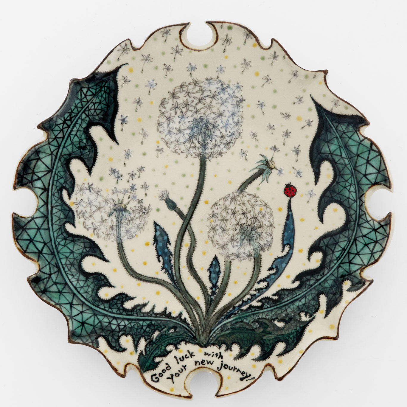 蒲公英(たんぽぽ)をモチーフに、旅立ちの綿毛を描いた一枚です。風に乗って広がっていく姿に、新たなはじまりと未来への希望が重ねられています。“Good luck with your new journey.”そっと背中を押すようなメッセージを宿しています。器として日常使いできるだけでなく、壁掛けとしてもお楽しみいただける一枚です。