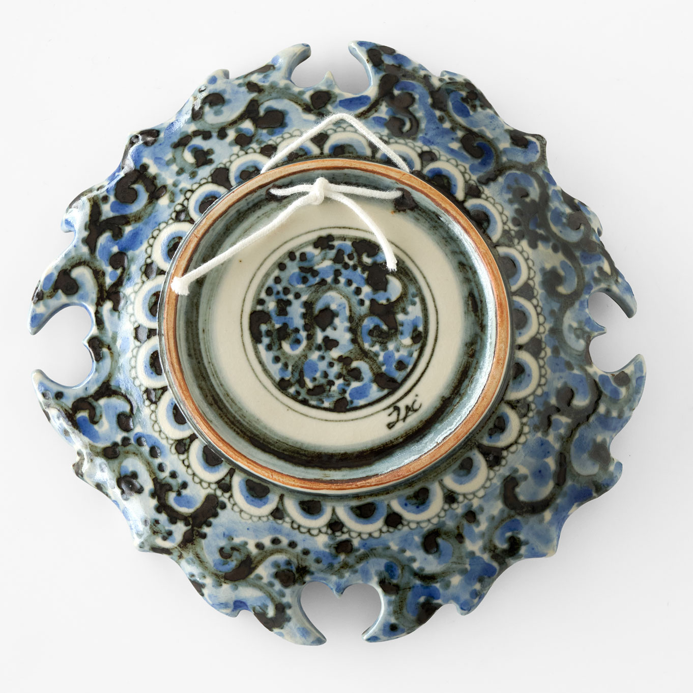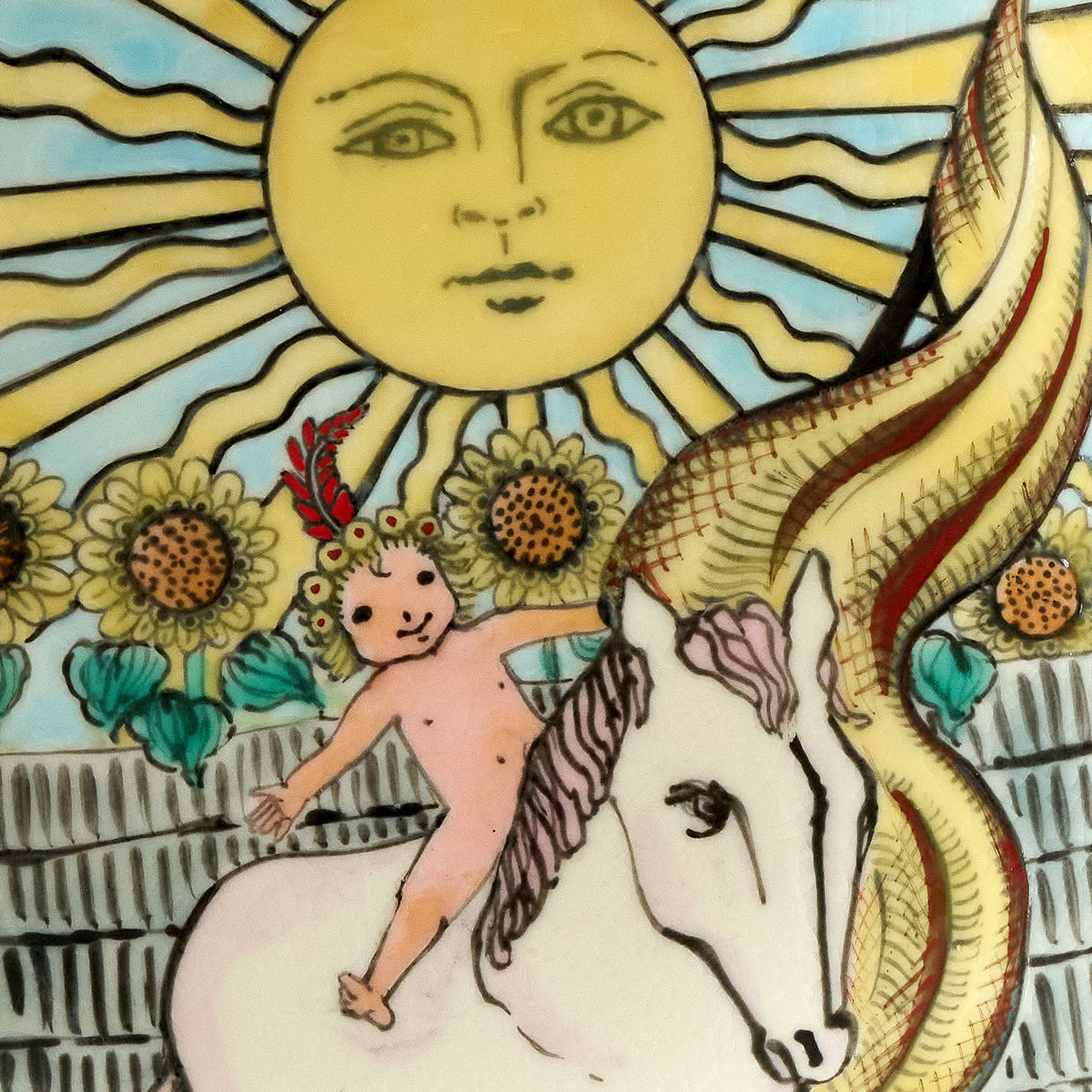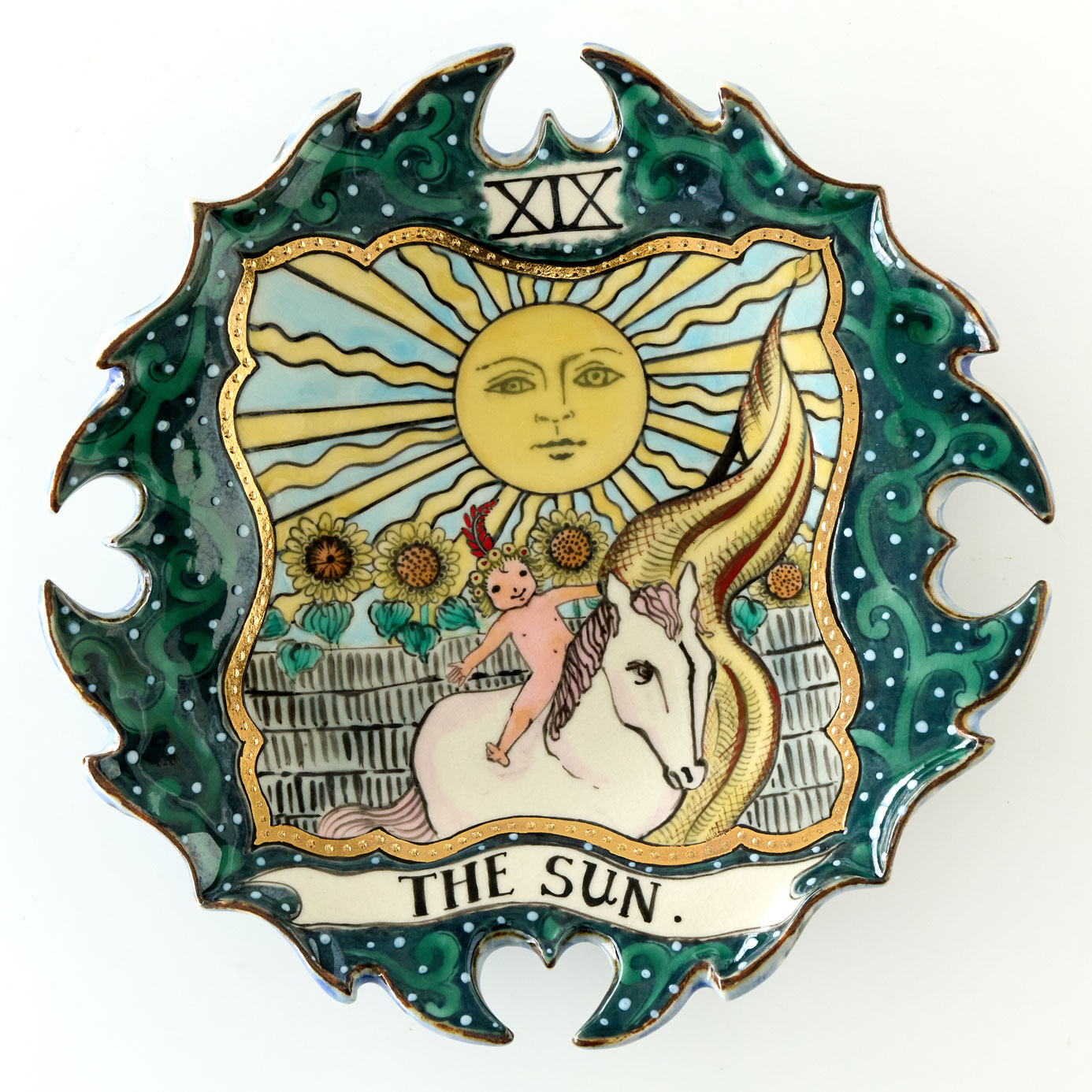 タロットの絵札「太陽」をモチーフにした一枚です。吉兆や明るい兆し、成功を象徴しています。光に満ちたモチーフの中に、前向きなエネルギーと喜びがいきいきと表現されています。器として日常使いできるだけでなく、壁掛けとしてもお楽しみいただける、空間に温かさと希望をもたらす作品です。