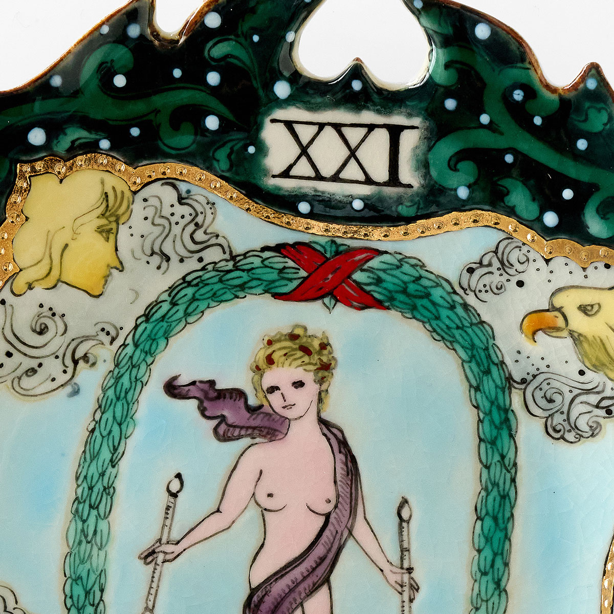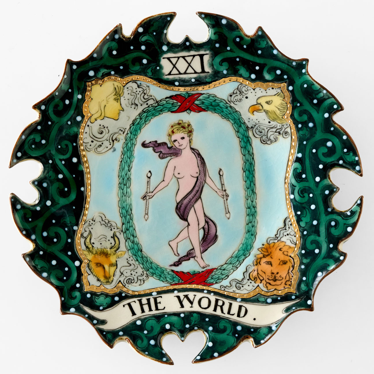 タロットの絵札「世界」をモチーフにした一枚です。完成や願望の実現、ハッピーエンドを象徴しています。物事が完成し、ひとつの区切りを迎えながらも、そこからまた新たな始まりへとつながっていく、というような、満ち足りた循環や調和が豊かに表現されています。器として日常使いできるだけでなく、壁掛けとしてもお楽しみいただける、空間に祝福と余韻をもたらす作品です。