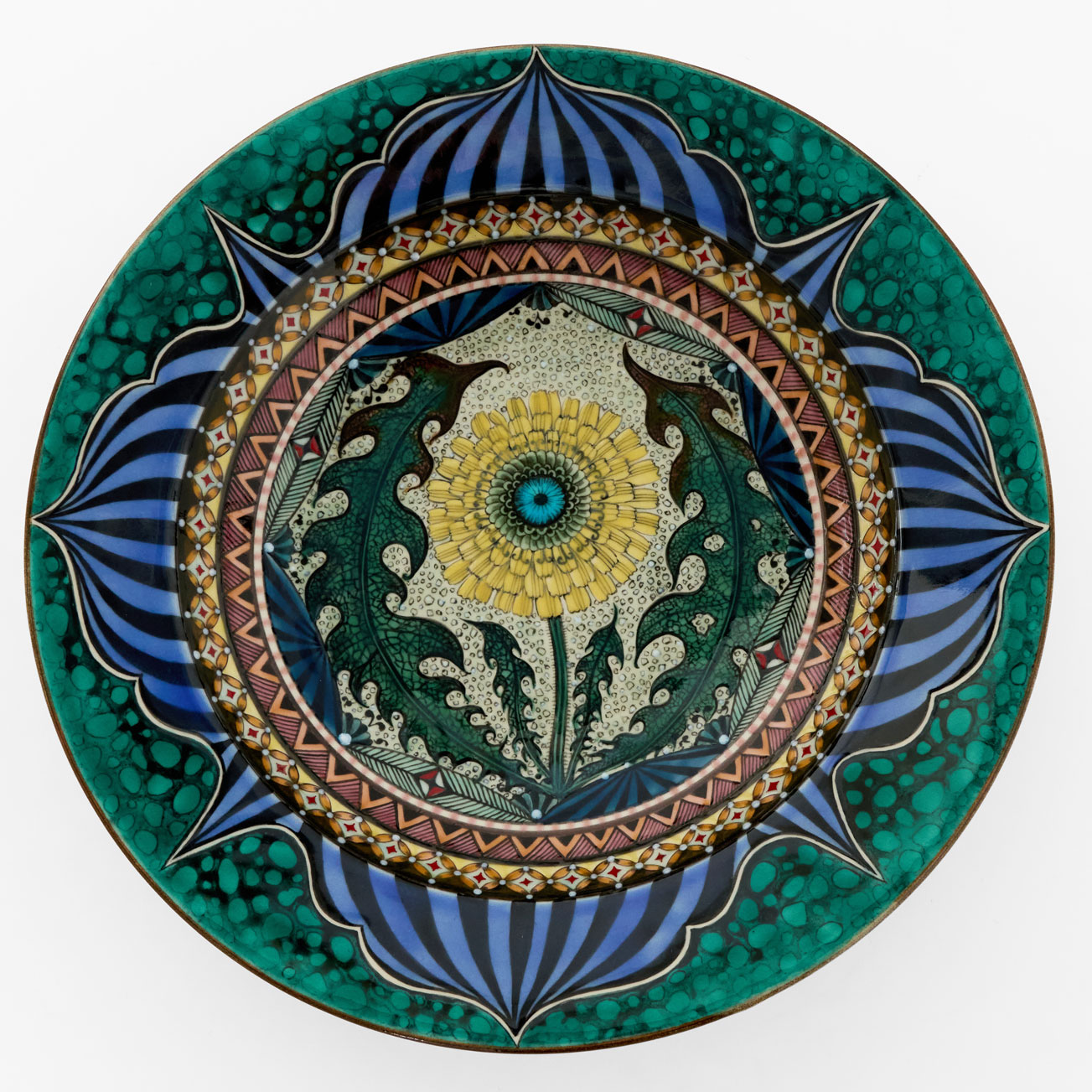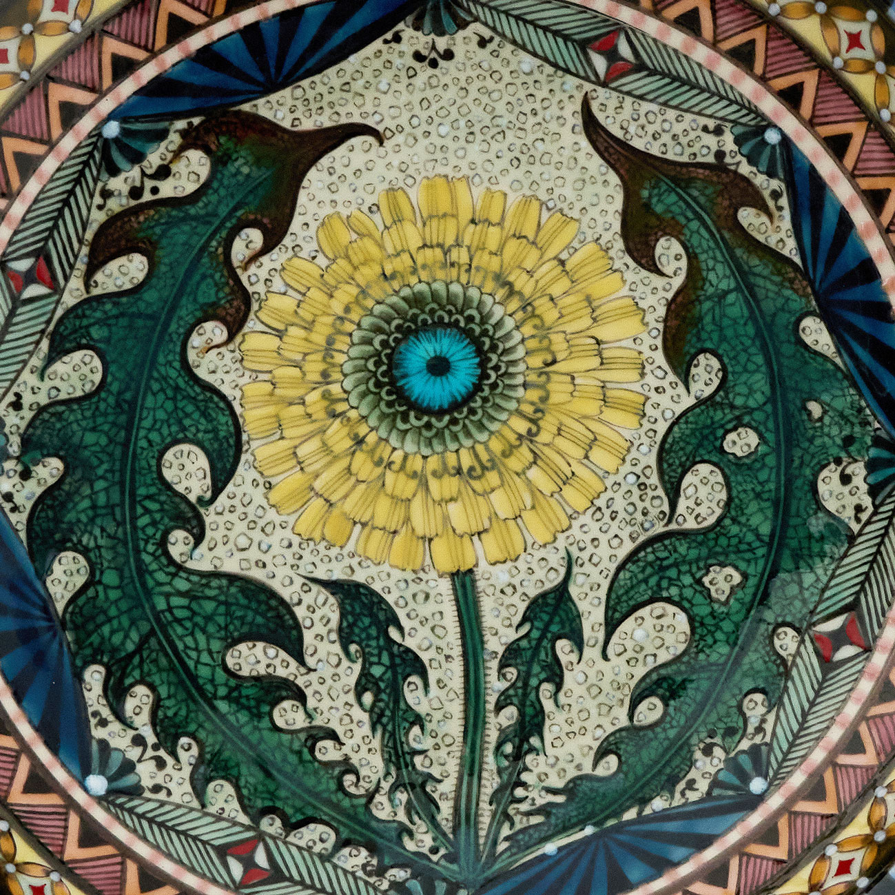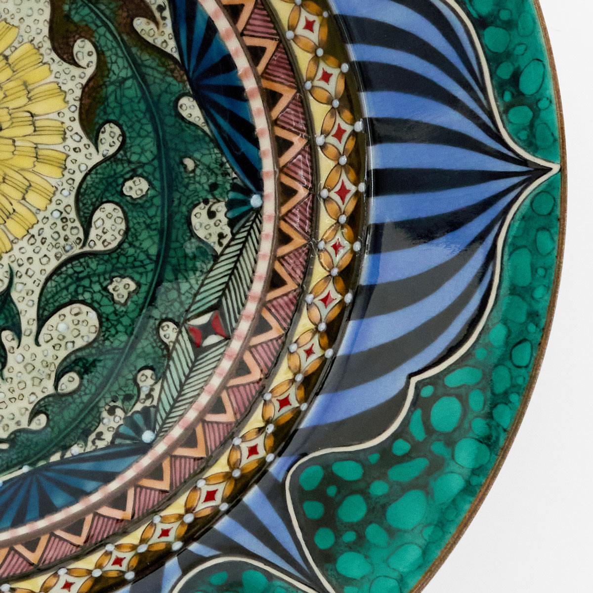 蒲公英(たんぽぽ)をモチーフにした一枚です。その別名である「Dandelion」は、ギザギザとした葉がライオンの歯のように見えることに由来しています。縁に施された緑は、細胞組織を思わせる有機的な広がりとして表現されています。自然の生命力と繊細な構造が重なり合う、存在感を放つ作品です。