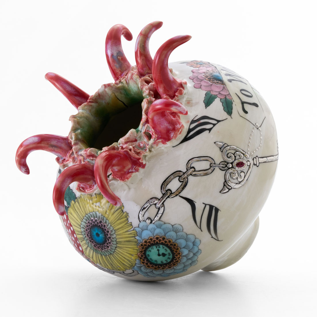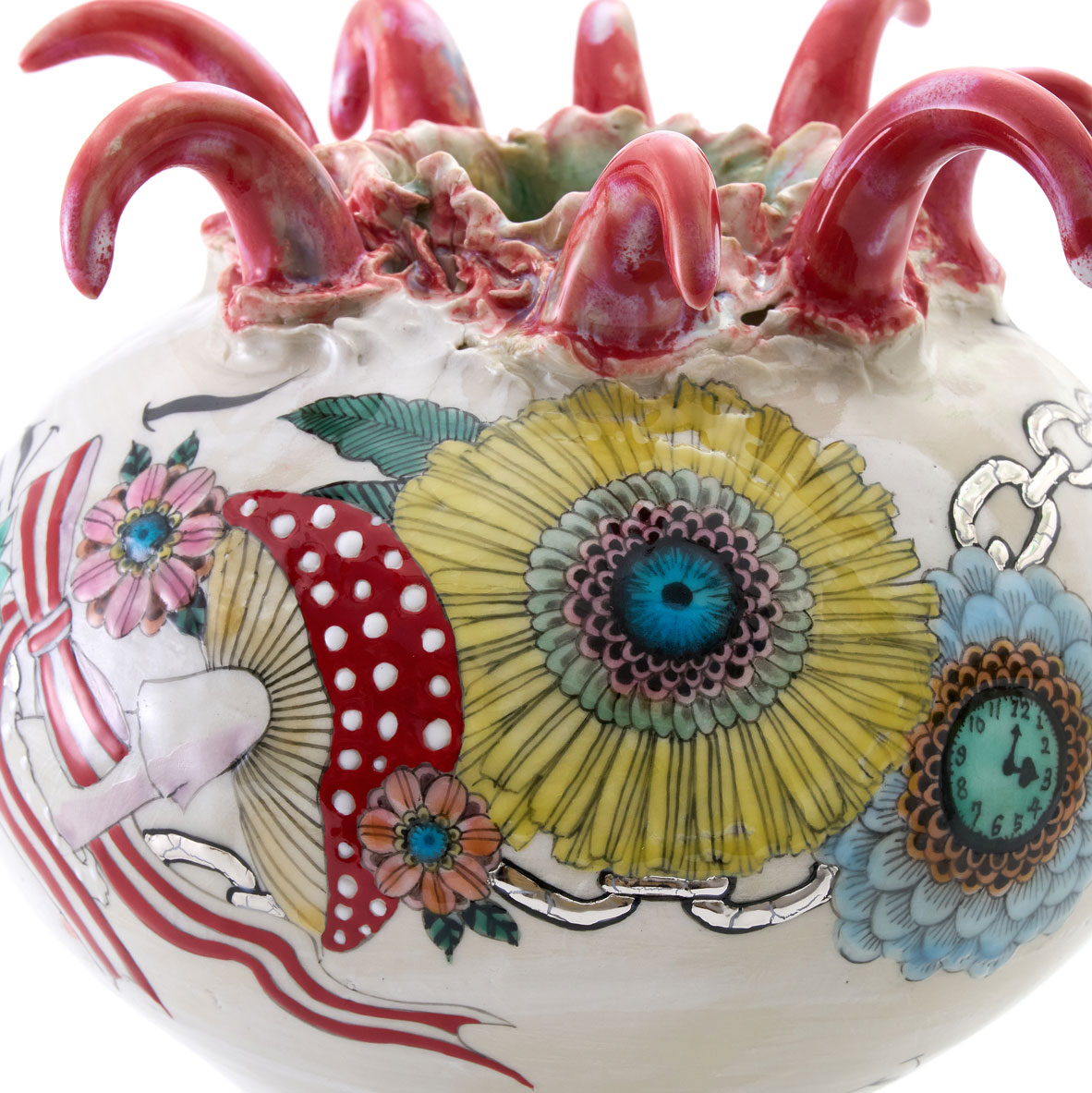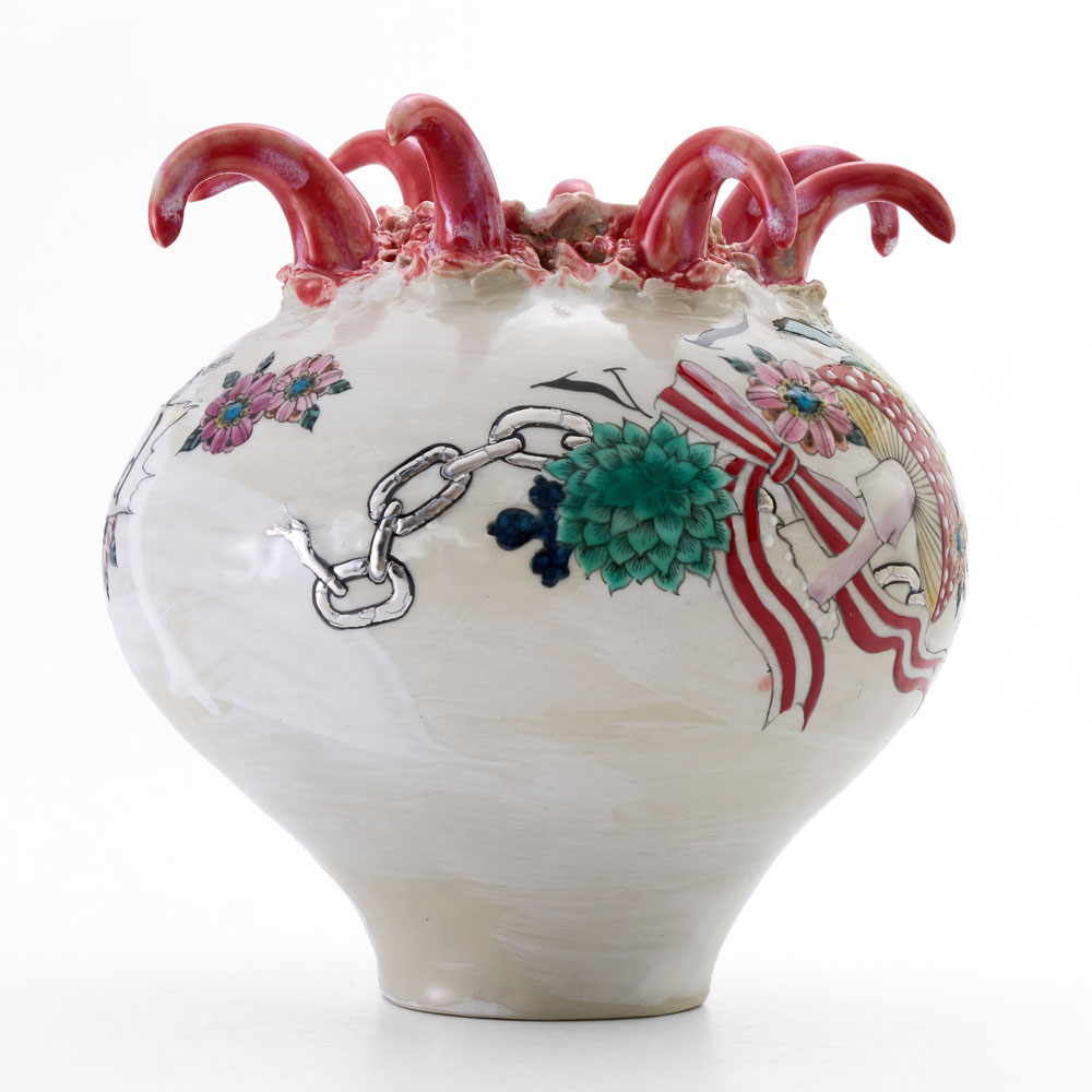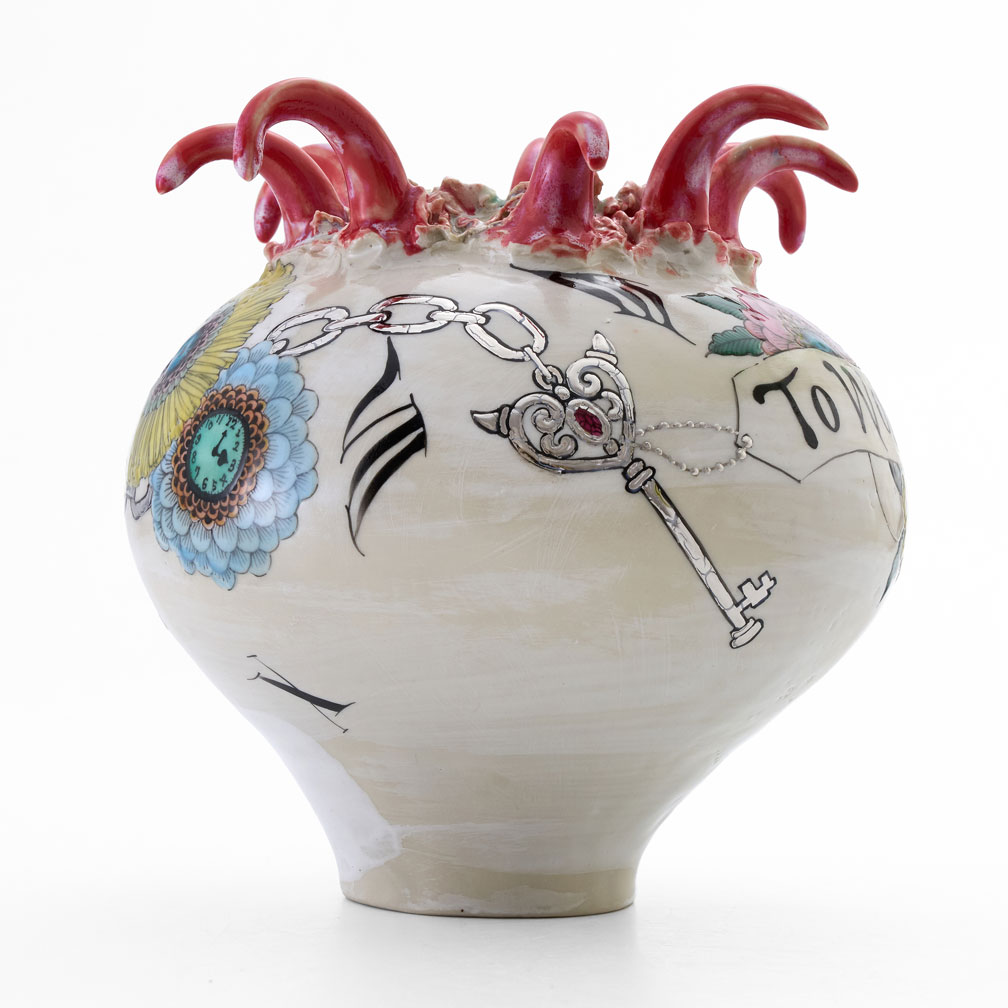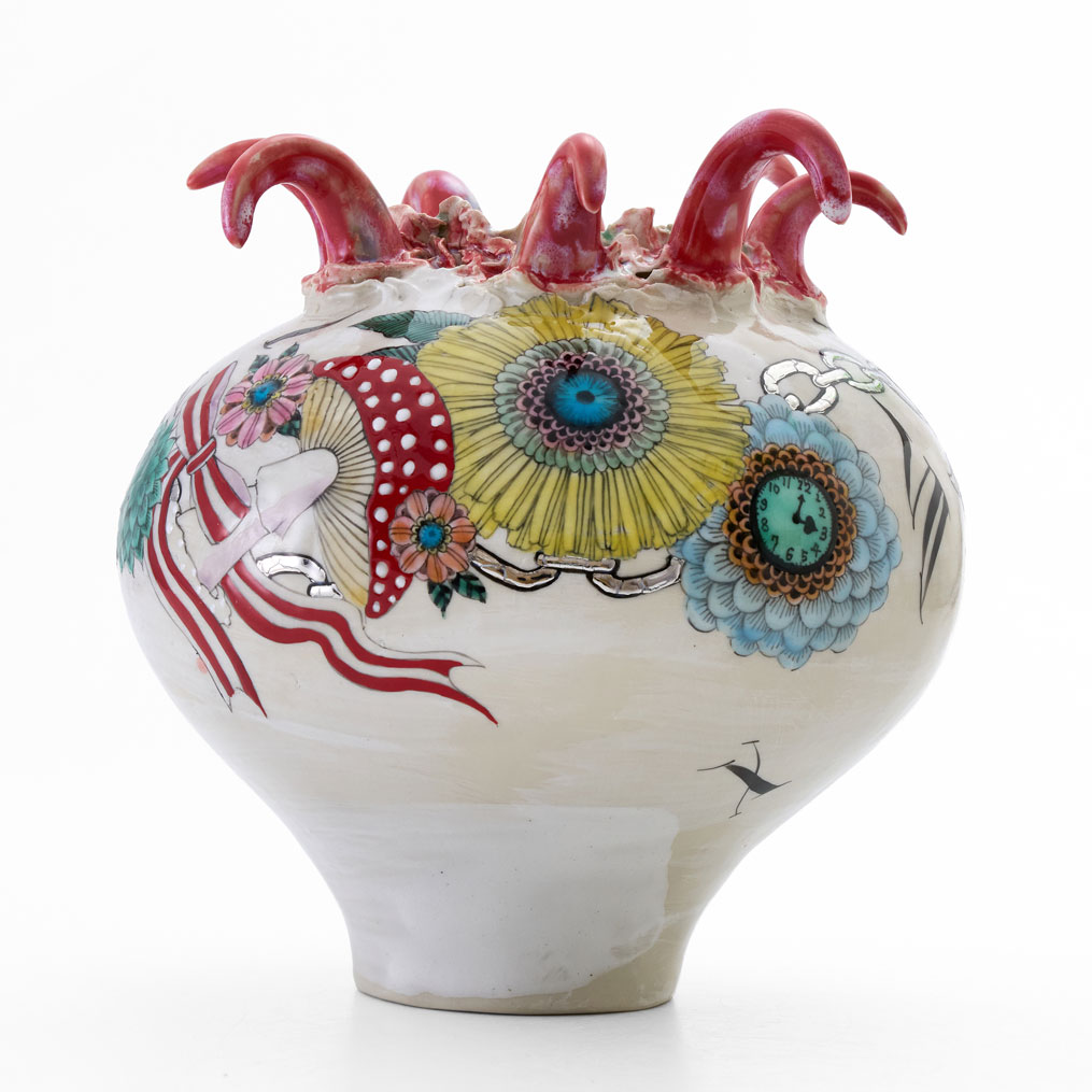 A vase that invites you into a wonderland. One can only imagine what kind of world unfolds once you dive into its interior. The piece is carefully decorated with colored glazes and overglaze painting on a white slip-coated body.