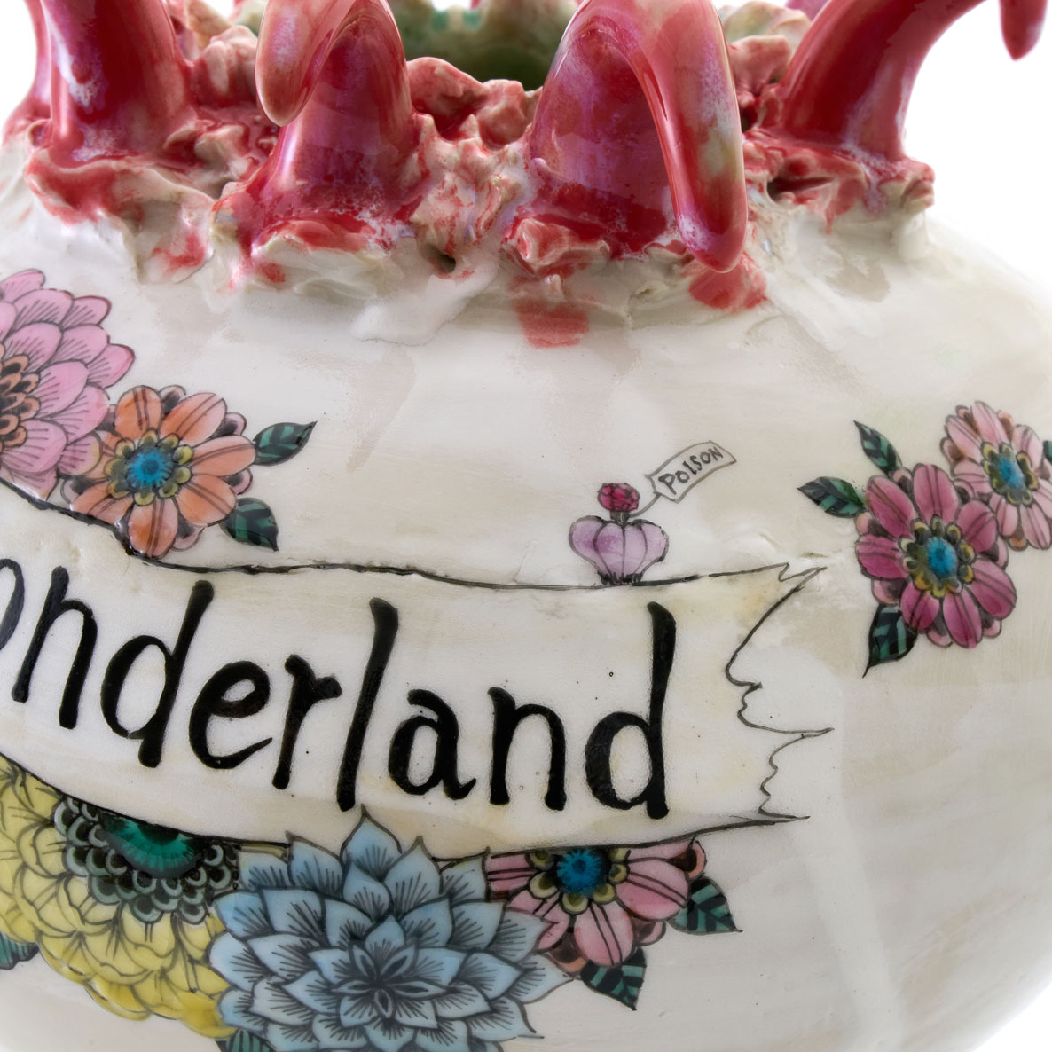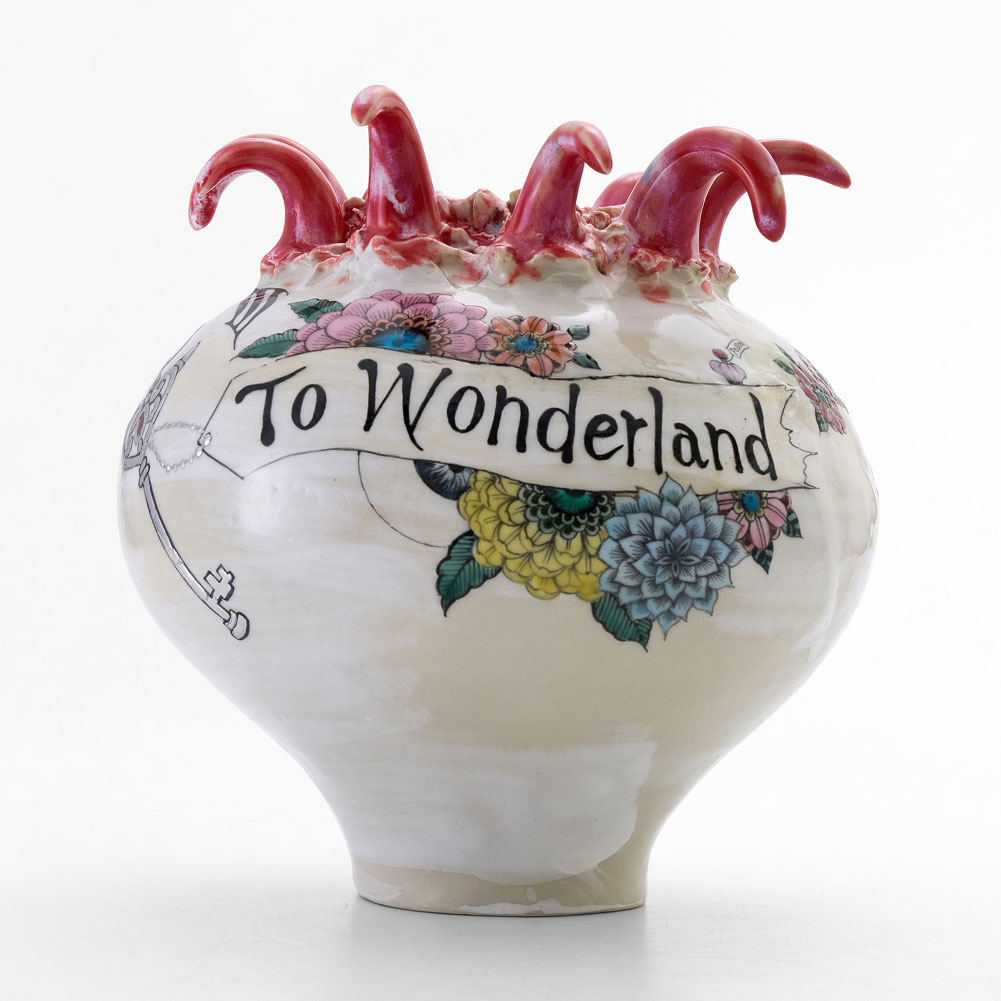ワンダーランドへと誘う壺。その内側へ飛び込んだなら、どのような世界が広がっているのか、想像がふくらむ作品です。白化粧を施した素地に、色釉薬と色絵で丁寧に彩色が施されています。