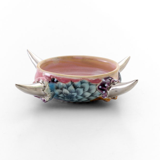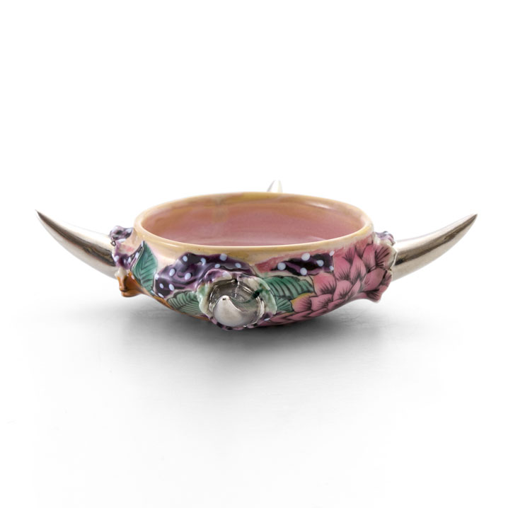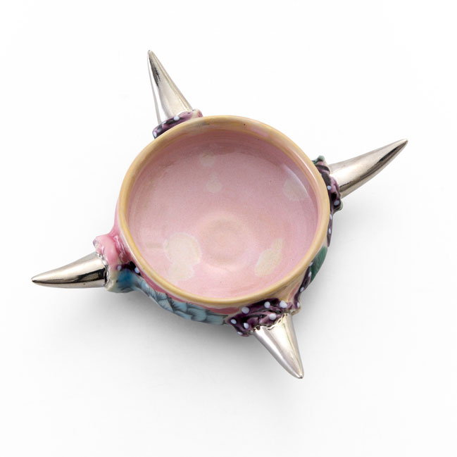 A cup with a softly pink interior and delicate floral patterns, exuding a subtly feminine presence. In striking contrast to its gentle appearance, four sharp spikes extend outward in different directions. Balancing sweetness with an underlying edge, it embodies a uniquely sweet and spicy character. The straight, unwavering gaze depicted on the underside leaves a quiet yet thought-provoking impression, as if posing a silent question to the viewer.This artwork comes with a paulownia wood storage box.