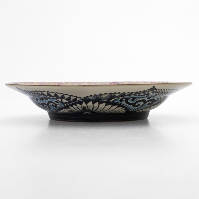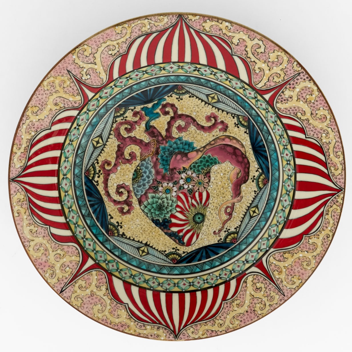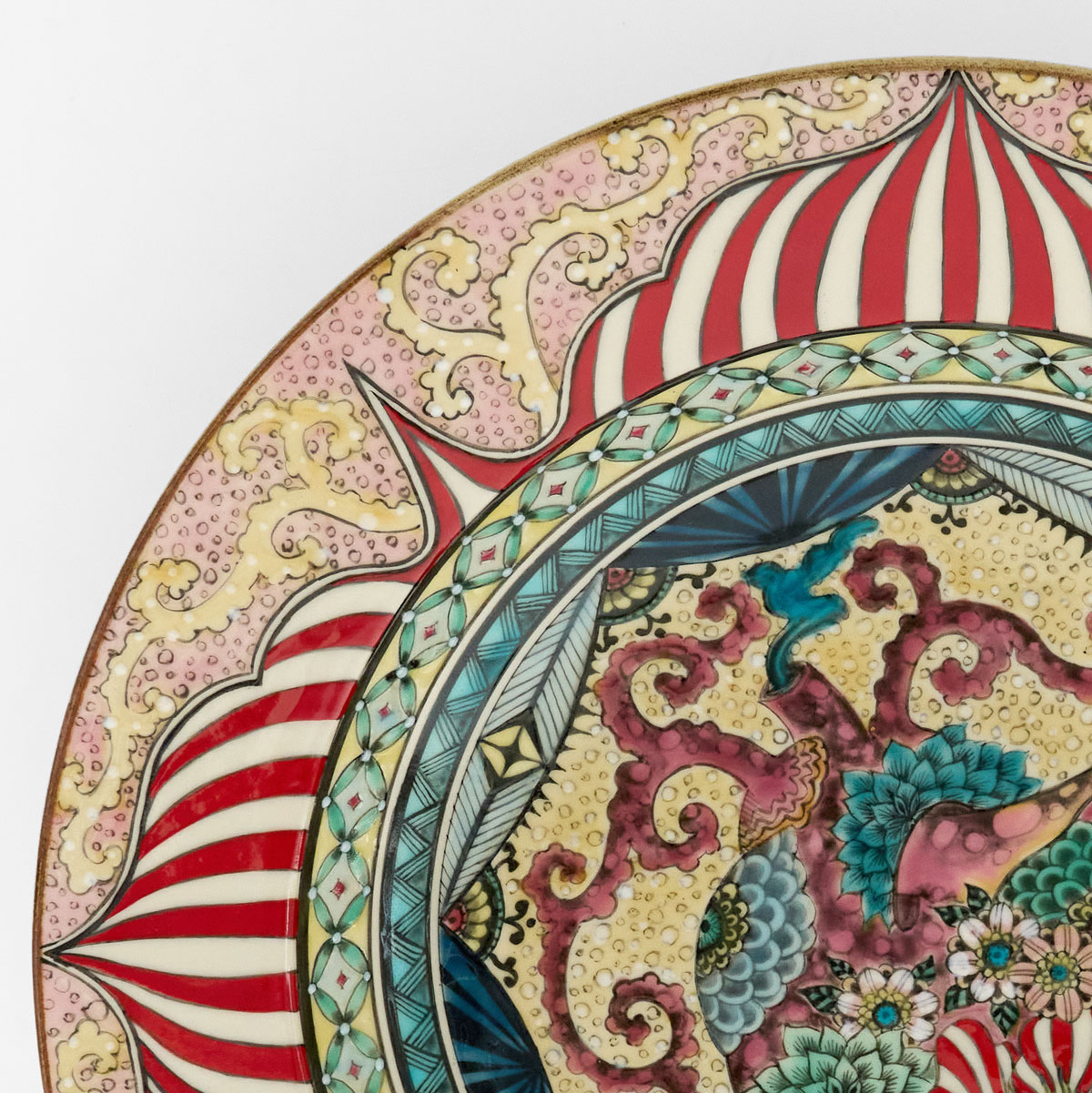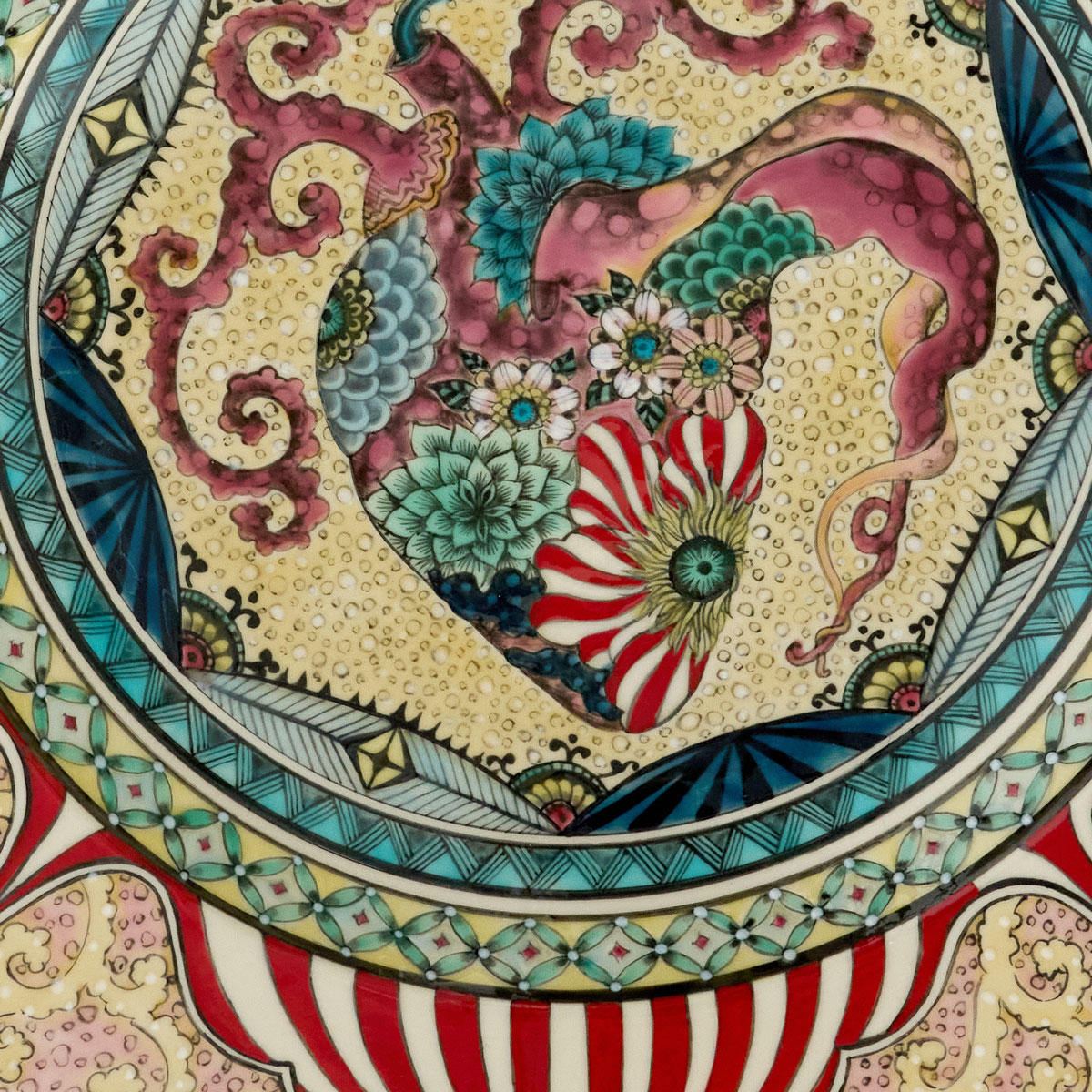 This piece features an octopus and a heart as its motifs, with a traditional octopus arabesque pattern adorning the rim. Eros, vitality, and a warm, humid sensuality are conveyed through a dense, immersive atmosphere. Organic motifs, imbued with an uncanny quality, overlap to create a work that leaves a strong impression and lingering resonance.