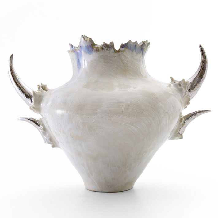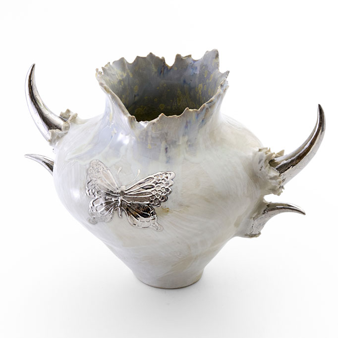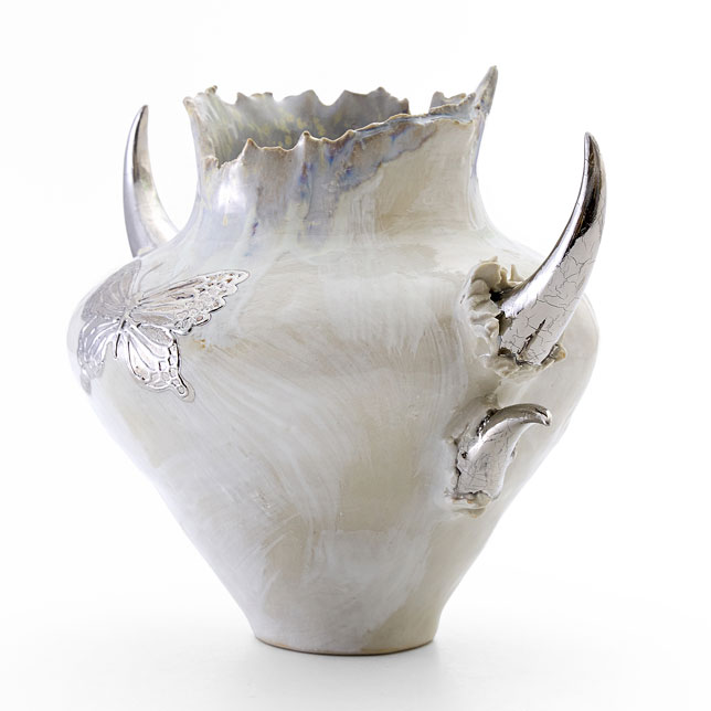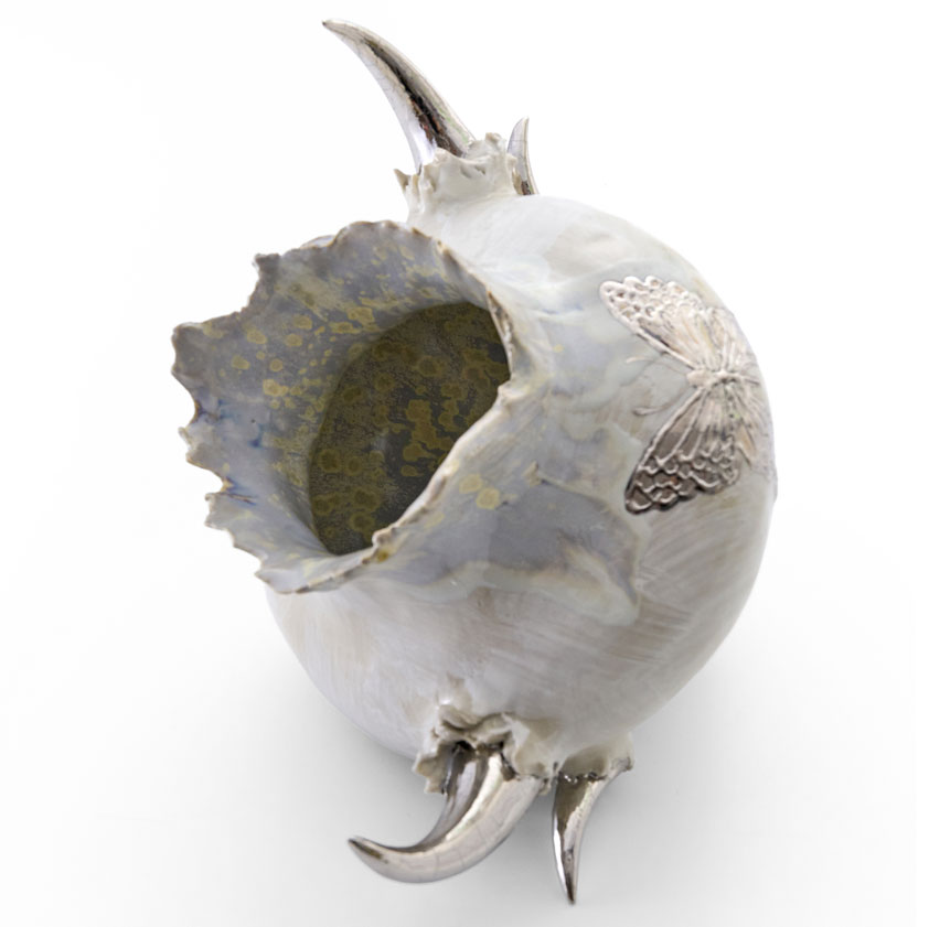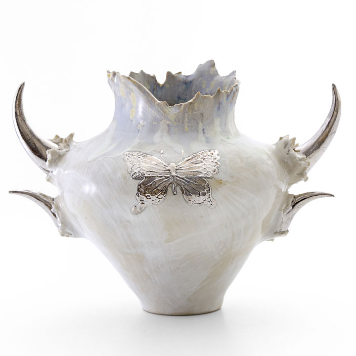 磁土に白化粧と結晶釉を施した白い壺。その中心にはプラチナの蝶が配され、側面からはプラチナの角が静かに伸びています。白とプラチナのみで表現された、水元さんによる新たな表現が際立つ作品です。