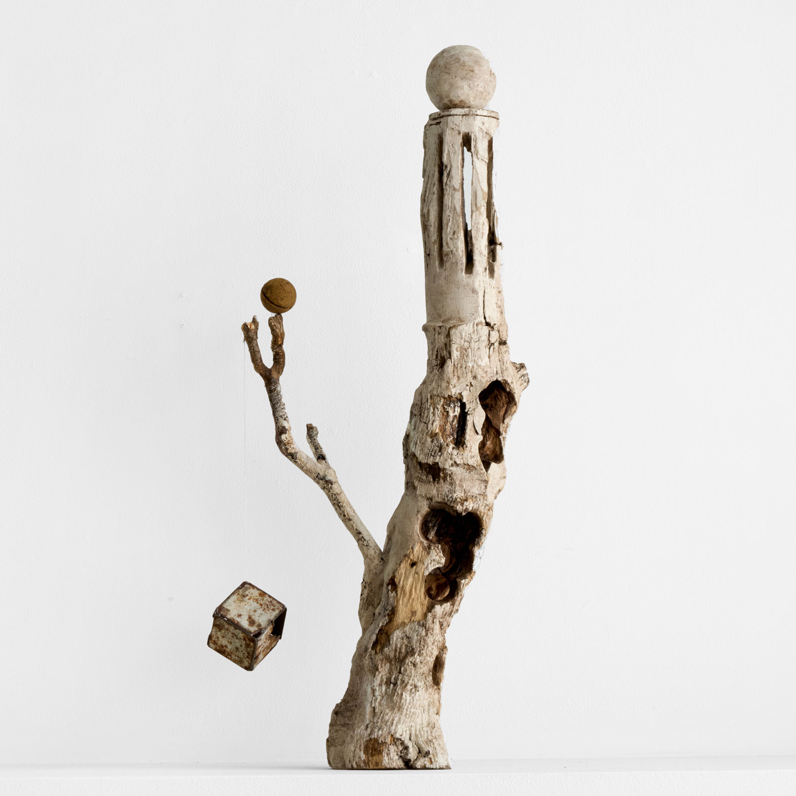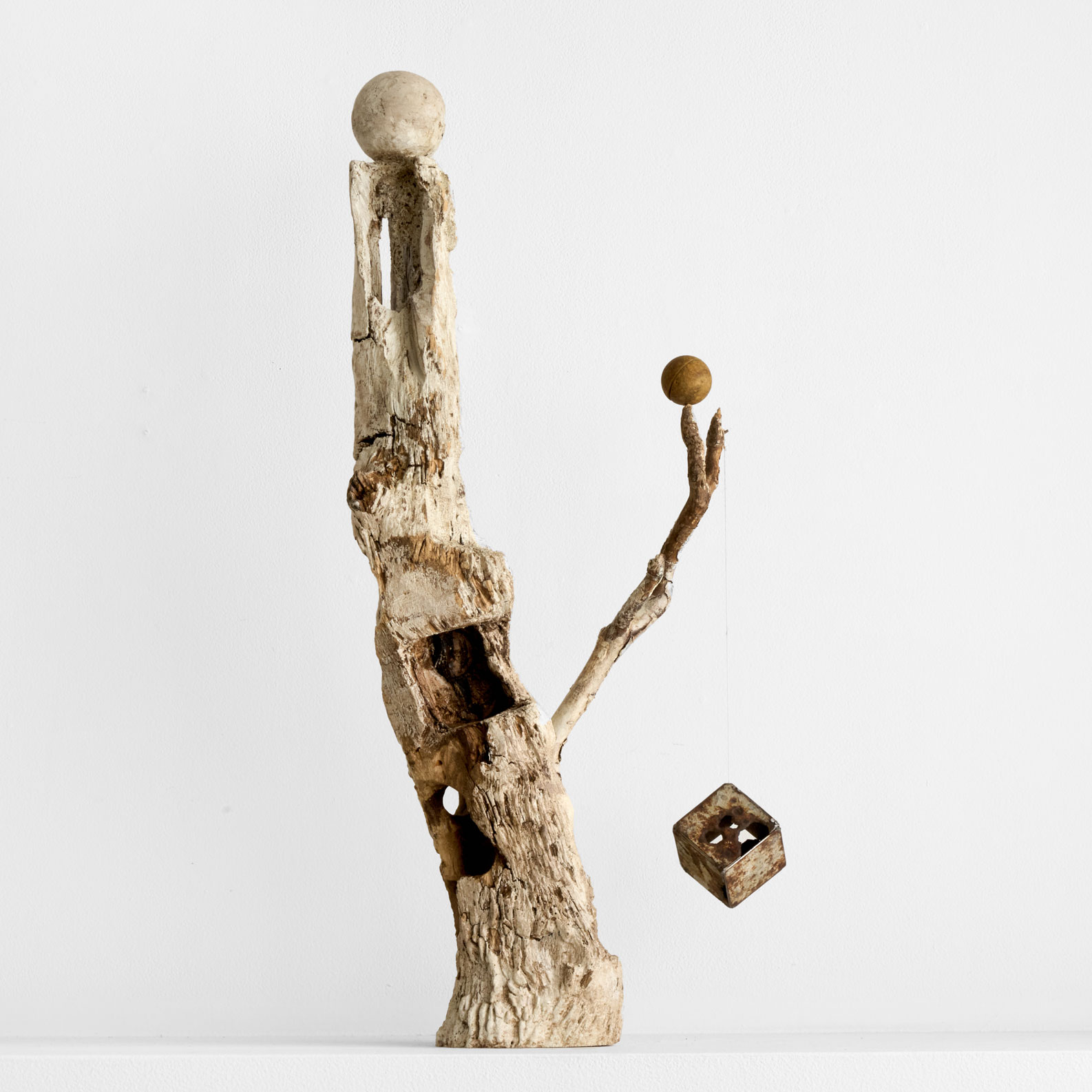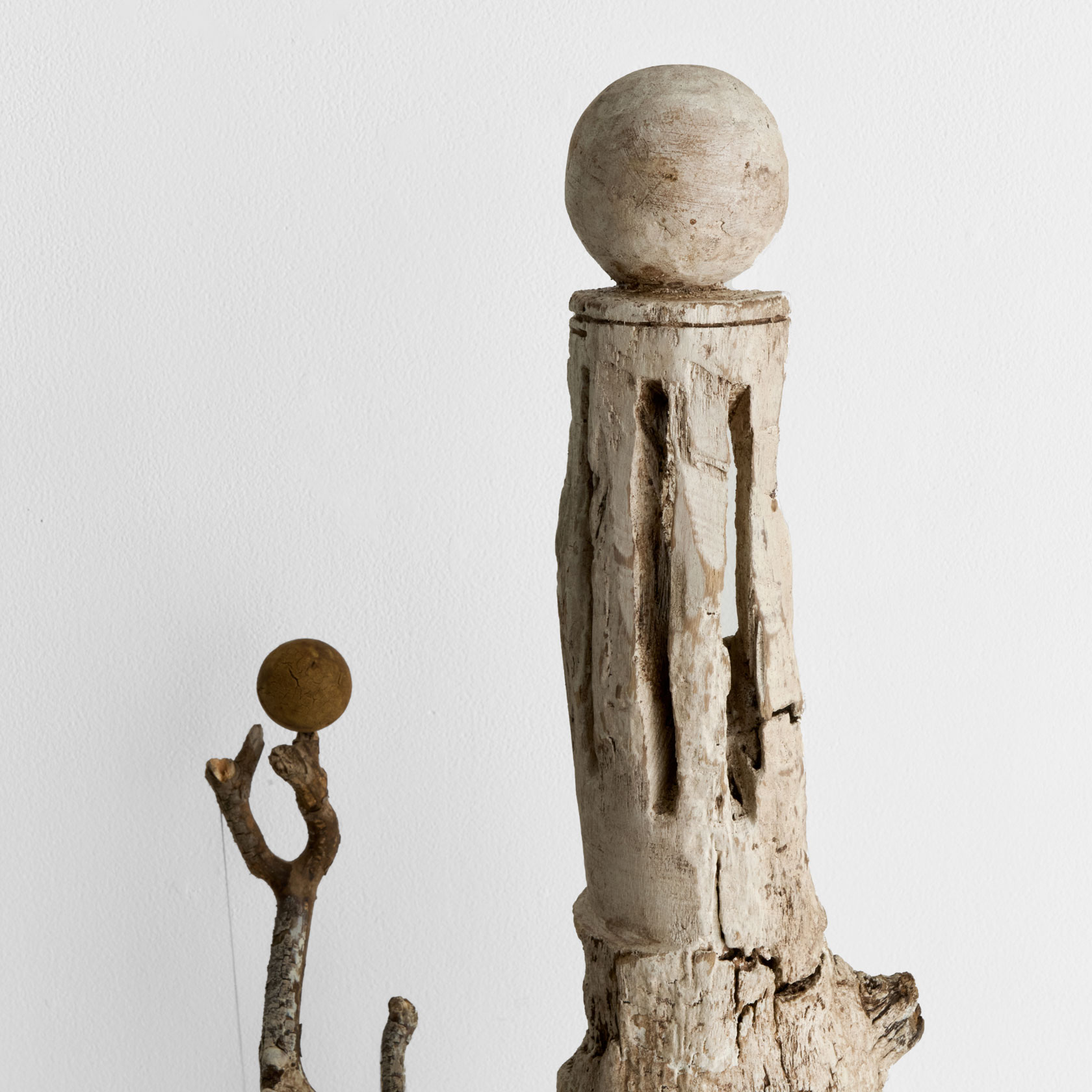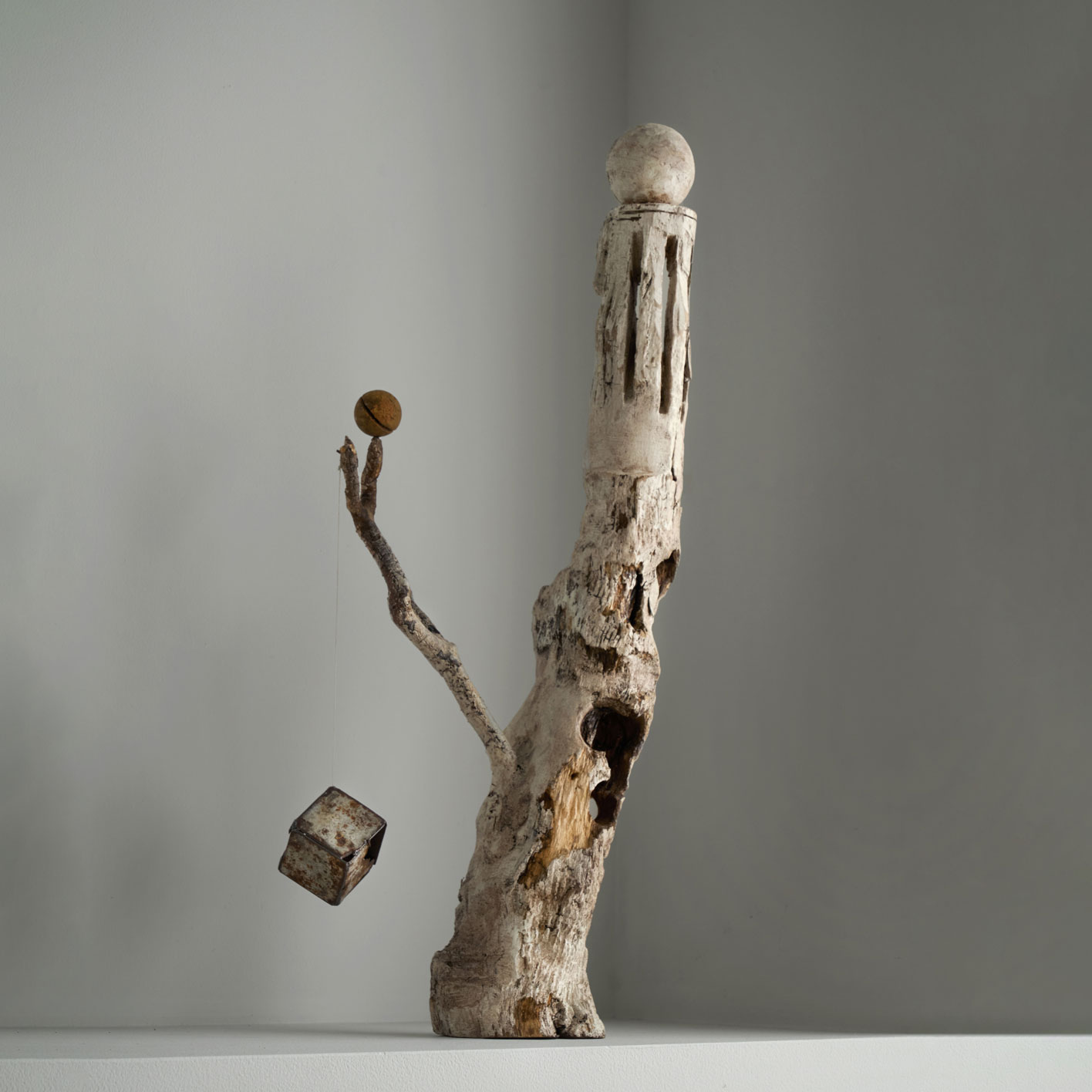 The driftwood, including the spherical form at the top, is carved as a single, continuous piece.The small sphere is made from a super ball found on the beach, and the weight is constructed by welding together iron plates, also collected from the sea, into a box-like form. The composition brings together nature and the artificial, chance and handcraft.