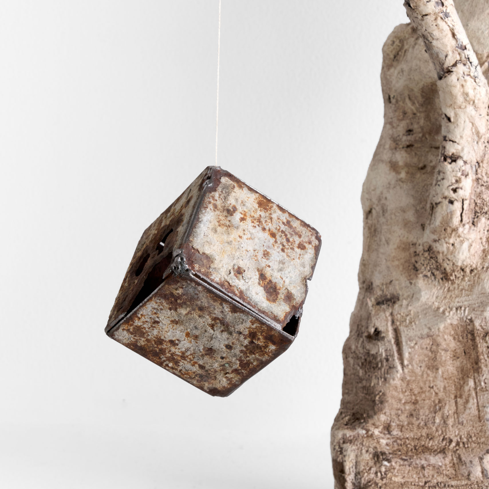 流木は、上部の球体も含めて一体として彫り出されています。小さな球体は海で拾ったスーパーボールを用い、錘には同じく海で見つけた鉄板を溶接して箱状に仕立てています。自然と人工、偶然と手仕事が重なり合う構成です。