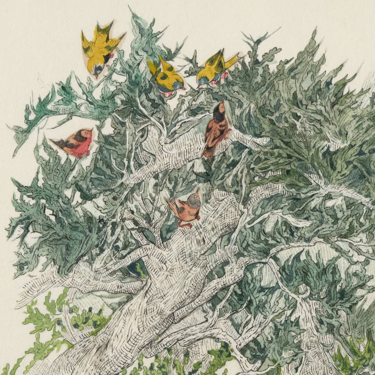 紙にガラスペンで細密なラインを描き、色鉛筆やガッシュで着色しています。