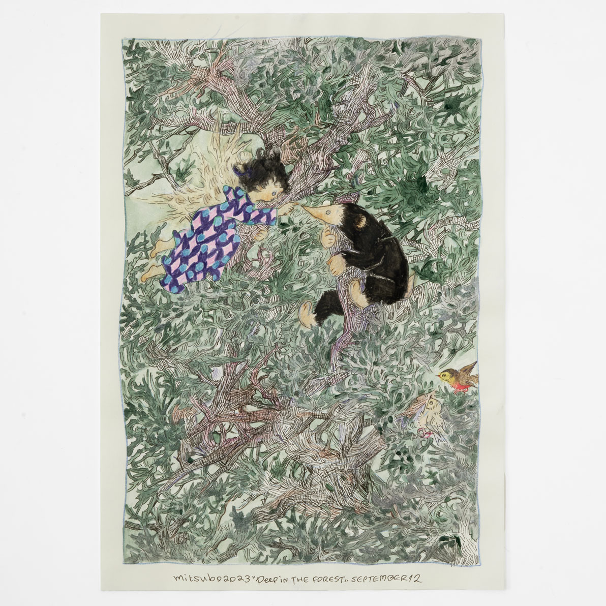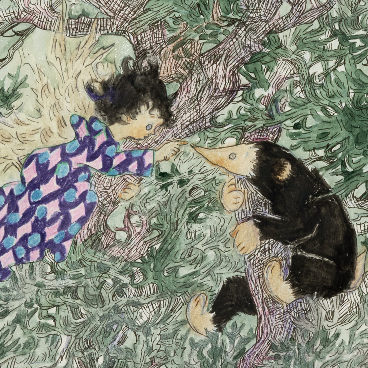 "One by one, one by one, I teach you,but you start over again from the beginning—Nōku’s patience and Kumagorō’s effort."This piece was created on paper with intricate lines drawn using a glass pen, then colored with colored pencils and gouache. The characters—both people and animals—are depicted in a lively and charming way.