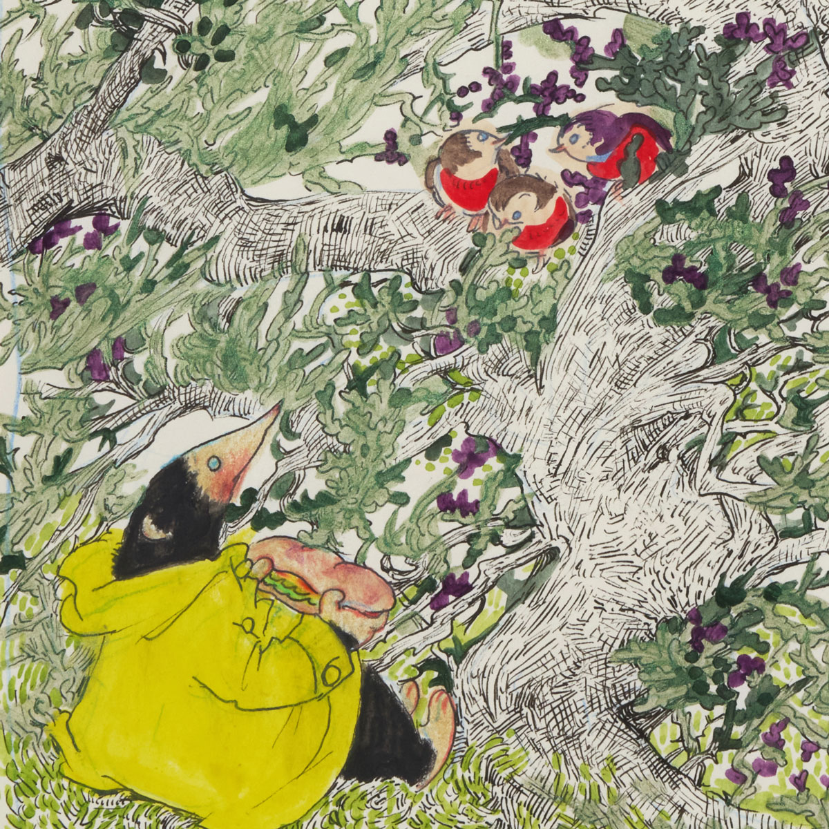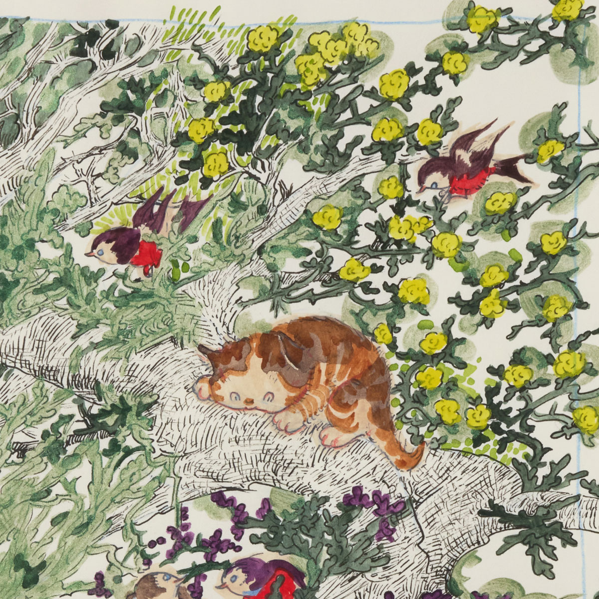 紙にガラスペンで細密なラインを描き、色鉛筆やガッシュで着色しています。登場する人物や動物がいきいきと愛らしく描かれています。