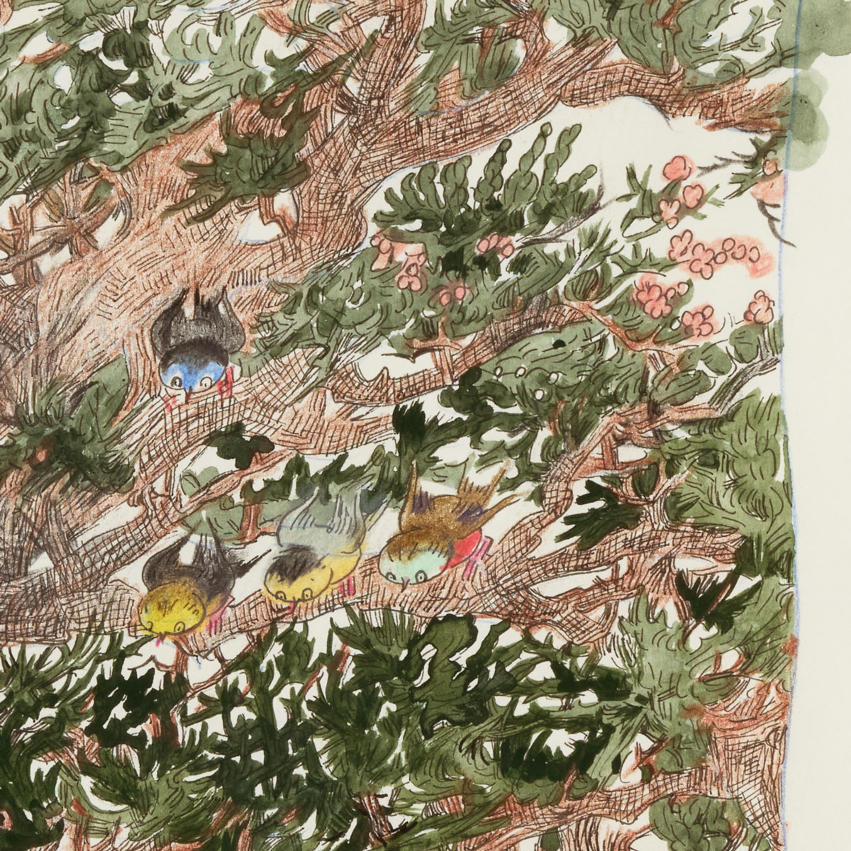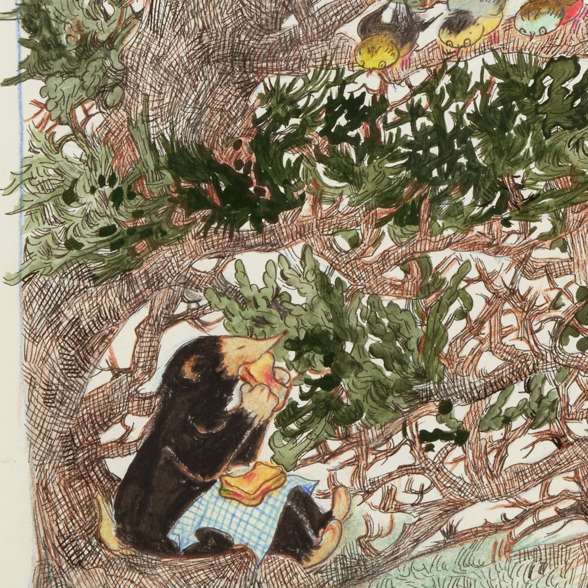 This artwork features intricate lines drawn on paper using a glass pen, carefully colored with colored pencils and gouache. The characters, both people and animals, are depicted in a lively and charming manner, bringing warmth and friendliness to the piece.