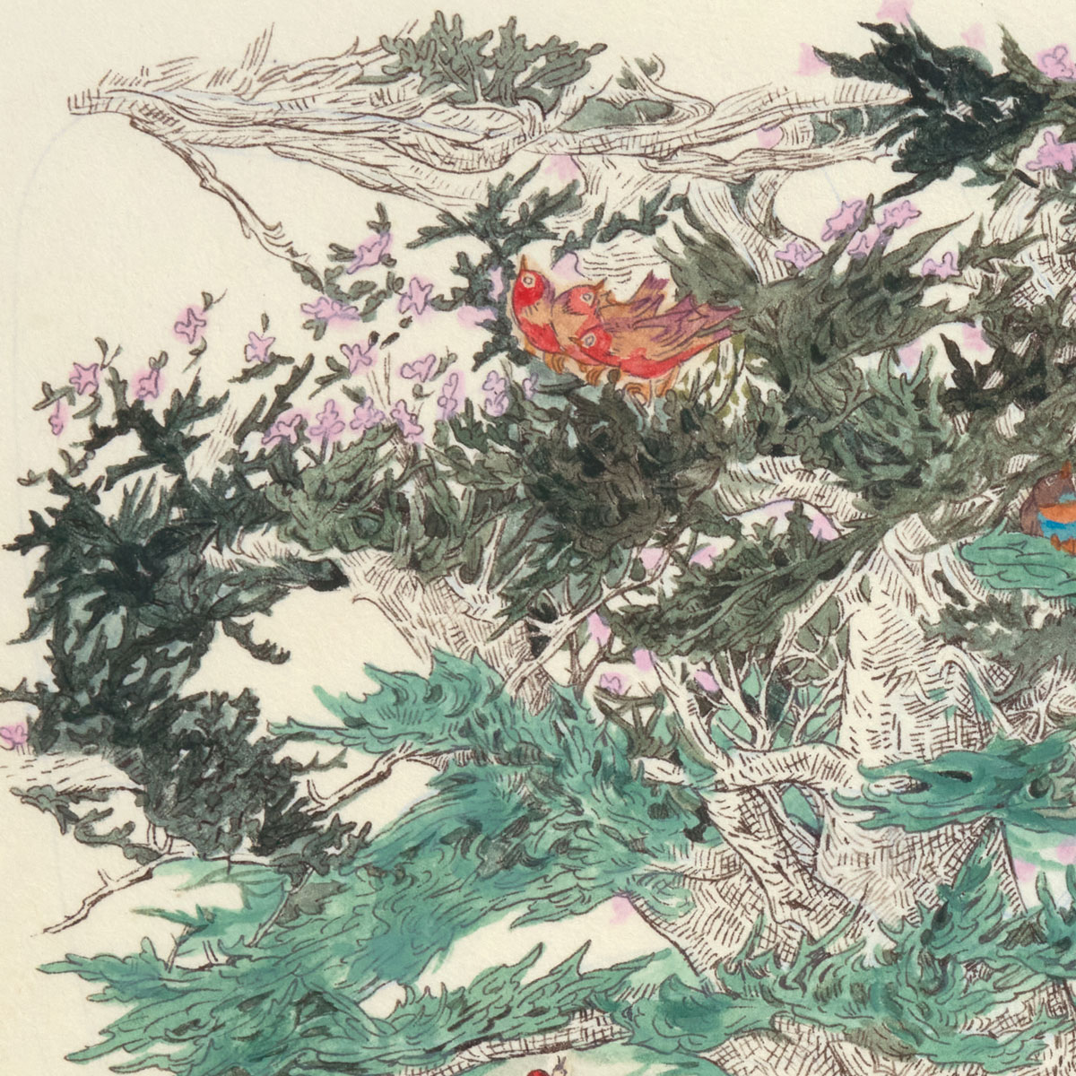 This artwork features intricate lines drawn on paper using a glass pen, carefully colored with colored pencils and gouache. The characters, both people and animals, are depicted in a lively and charming manner, bringing warmth and friendliness to the piece.