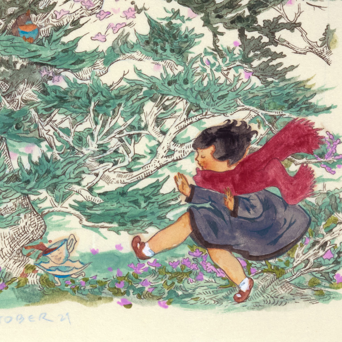 紙にガラスペンで細密なラインを描き、色鉛筆やガッシュで着色しています。登場する人物や動物がいきいきと愛らしく描かれています。
