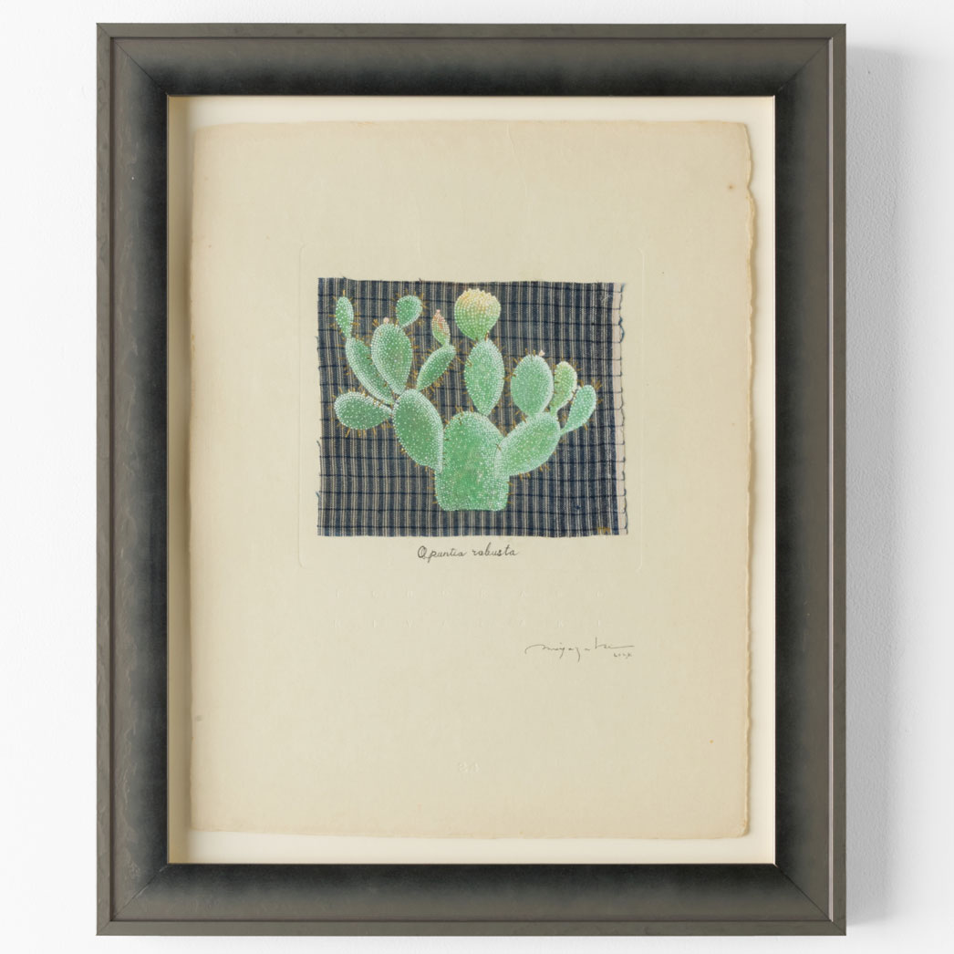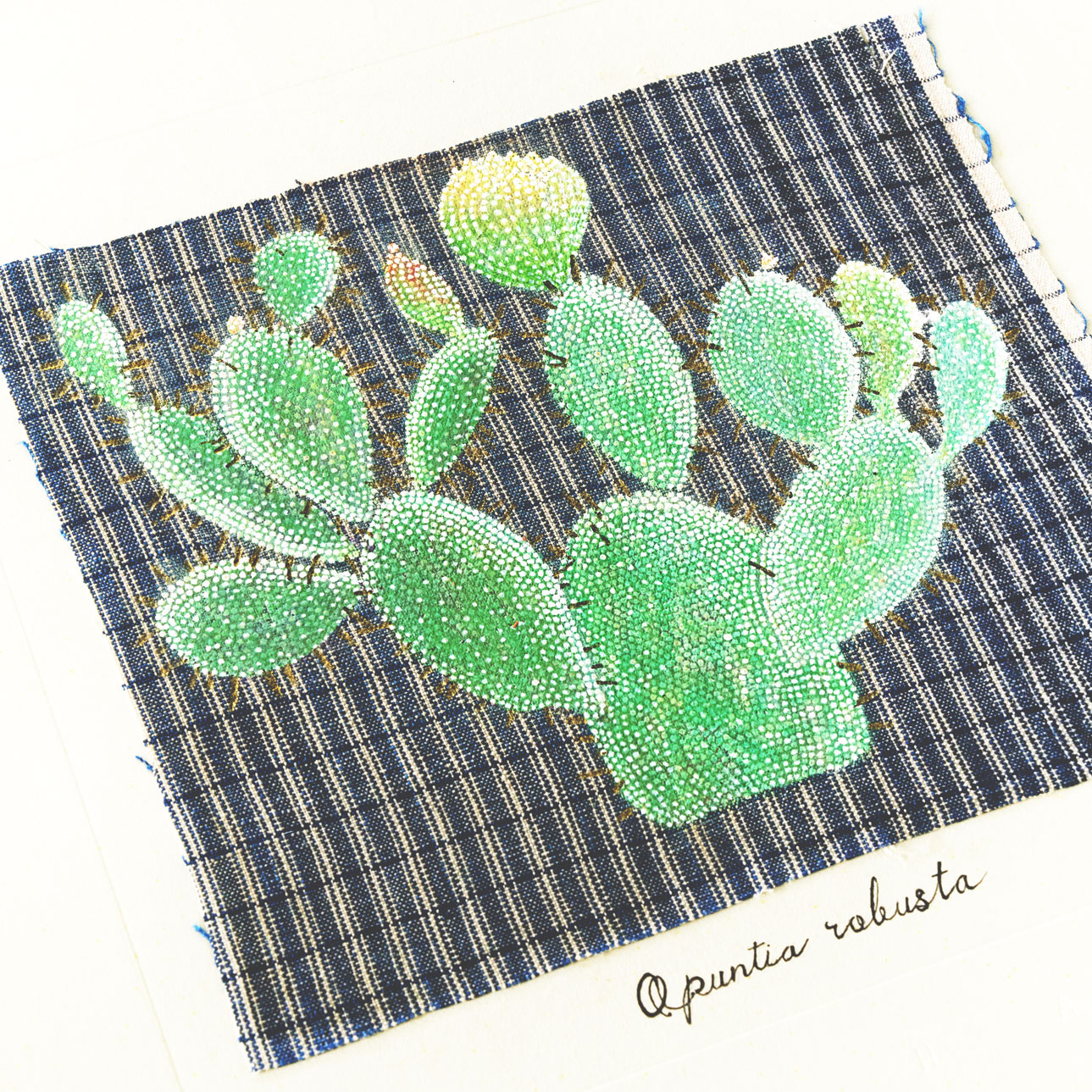 テーラーの布地見本帳に収められた布地の上に、テンペラ絵具と油絵具でウチワサボテンを描いています。古典絵画の技法であるハッチング(短いストロークの集積で量感を表す手法)を基盤にしながら、職人的な緻密さとポップな印象を併せ持たせるため、「マイクロモザイク画」(造語)の手法で描いています。鮮やかな黄緑色とゴールドで描かれたサボテンの棘が愛らしくも華やかな印象です。
