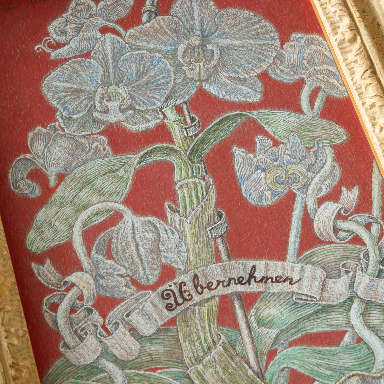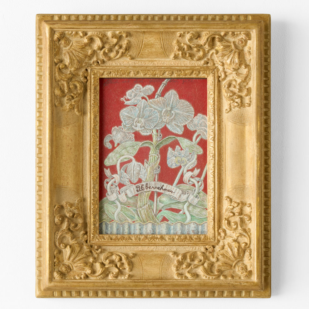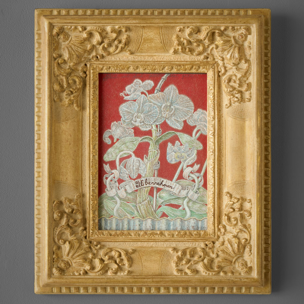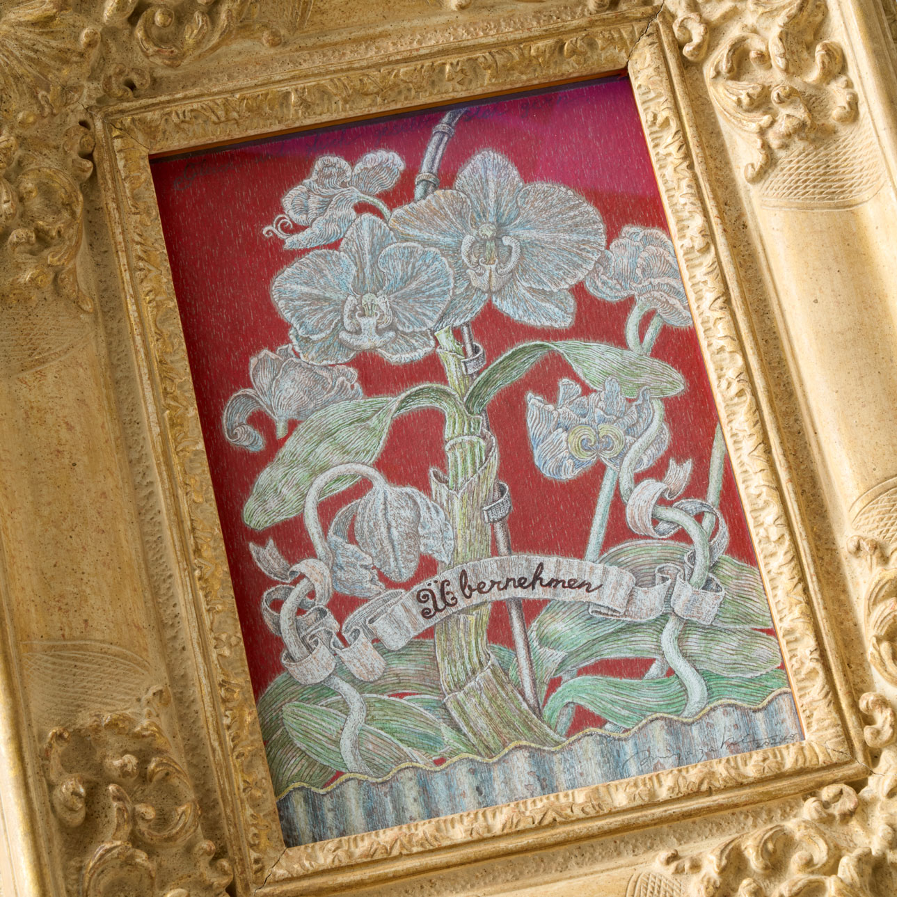This work depicts an orchid succession ceremony—or, alternatively, a drama of usurpation.An old frame by Daichidō is used, enhancing the sense of time and narrative inherent in the work.