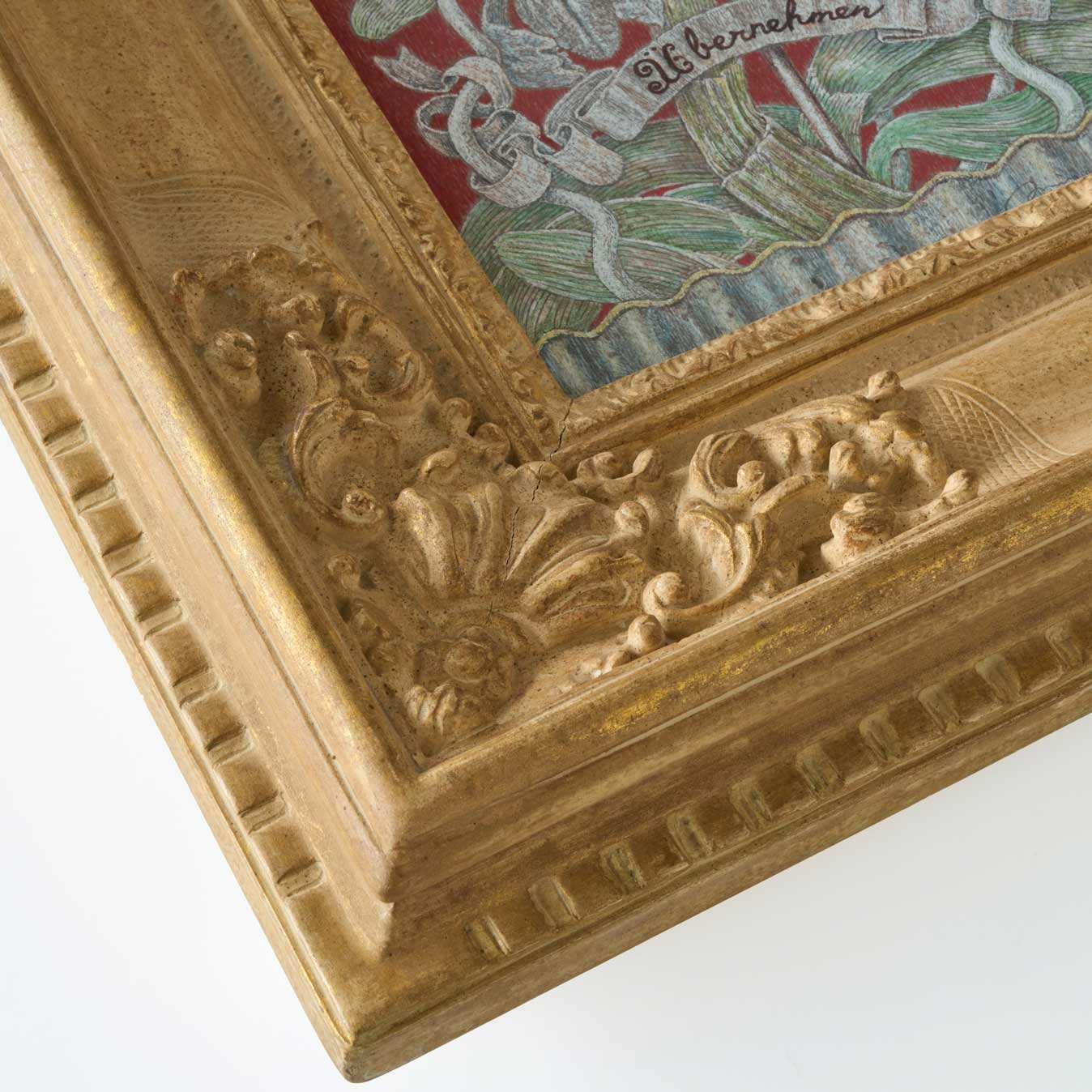 It is executed on watercolor paper, with layers of watercolor and tempera paint. It is fitted with low-reflection acrylic glazing.