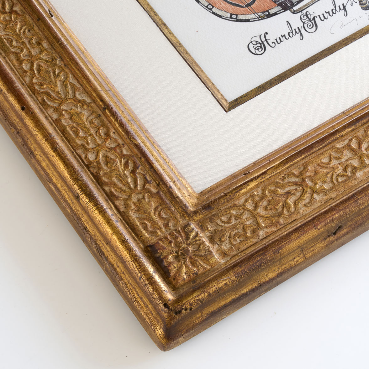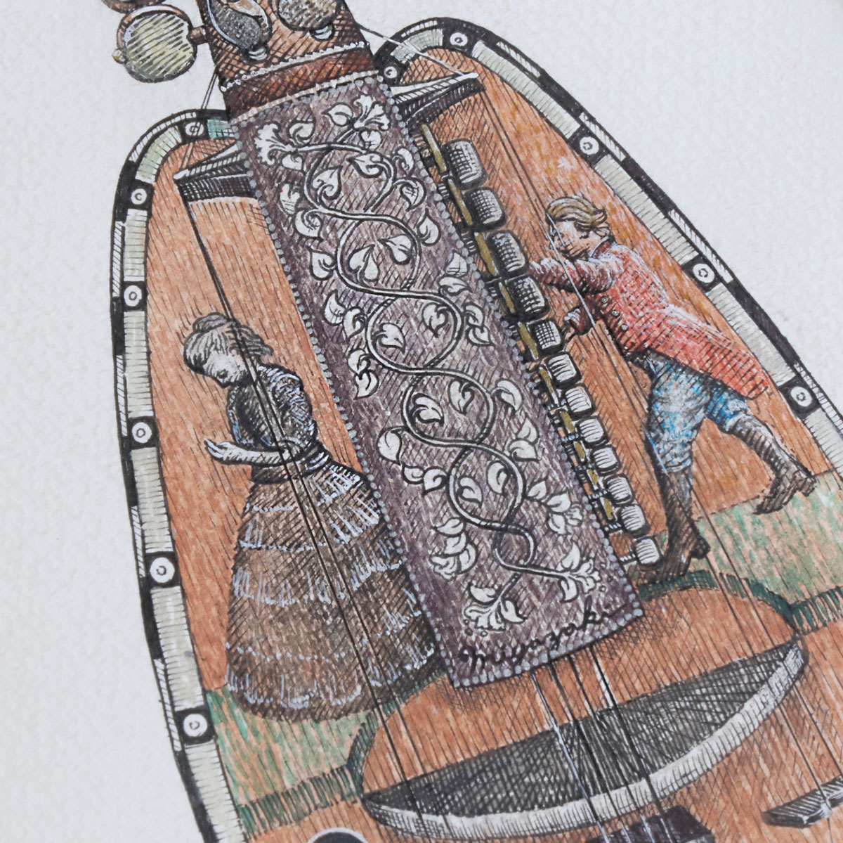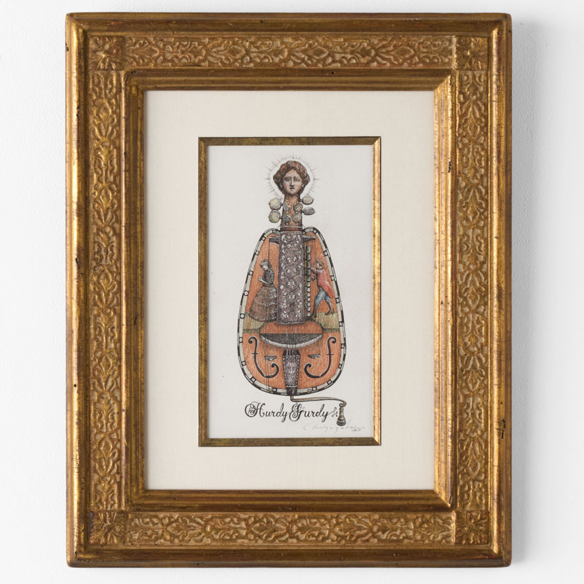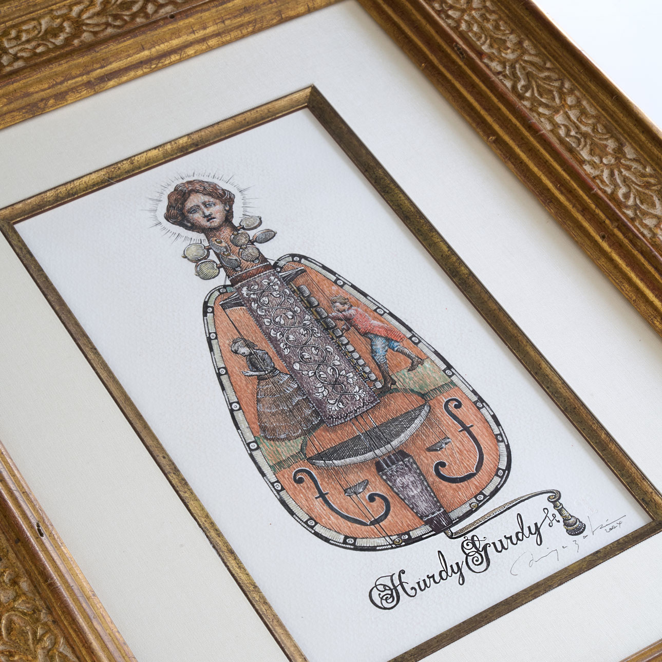ハーディーガーディーは実在する古楽器ですが、この作品では「こんな楽器があれば」という想いから描いた独自意匠の幻想楽器として表現しています。歌曲『フィガロの結婚』の一場面を挿入し、ネックの装飾は螺鈿を意識しています。